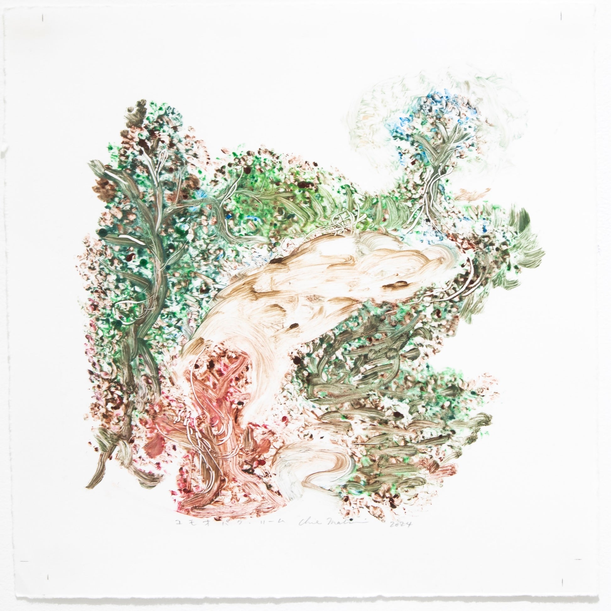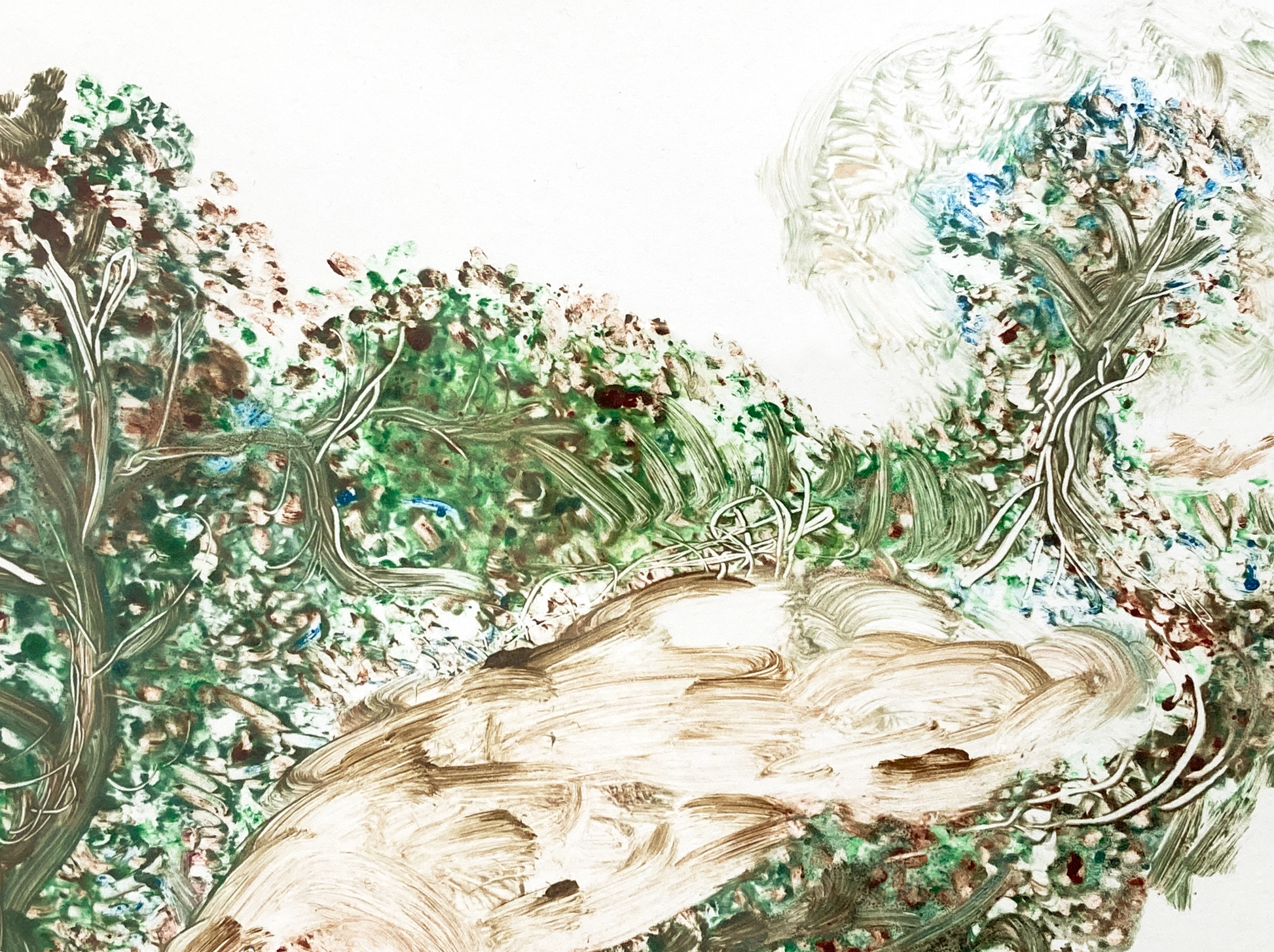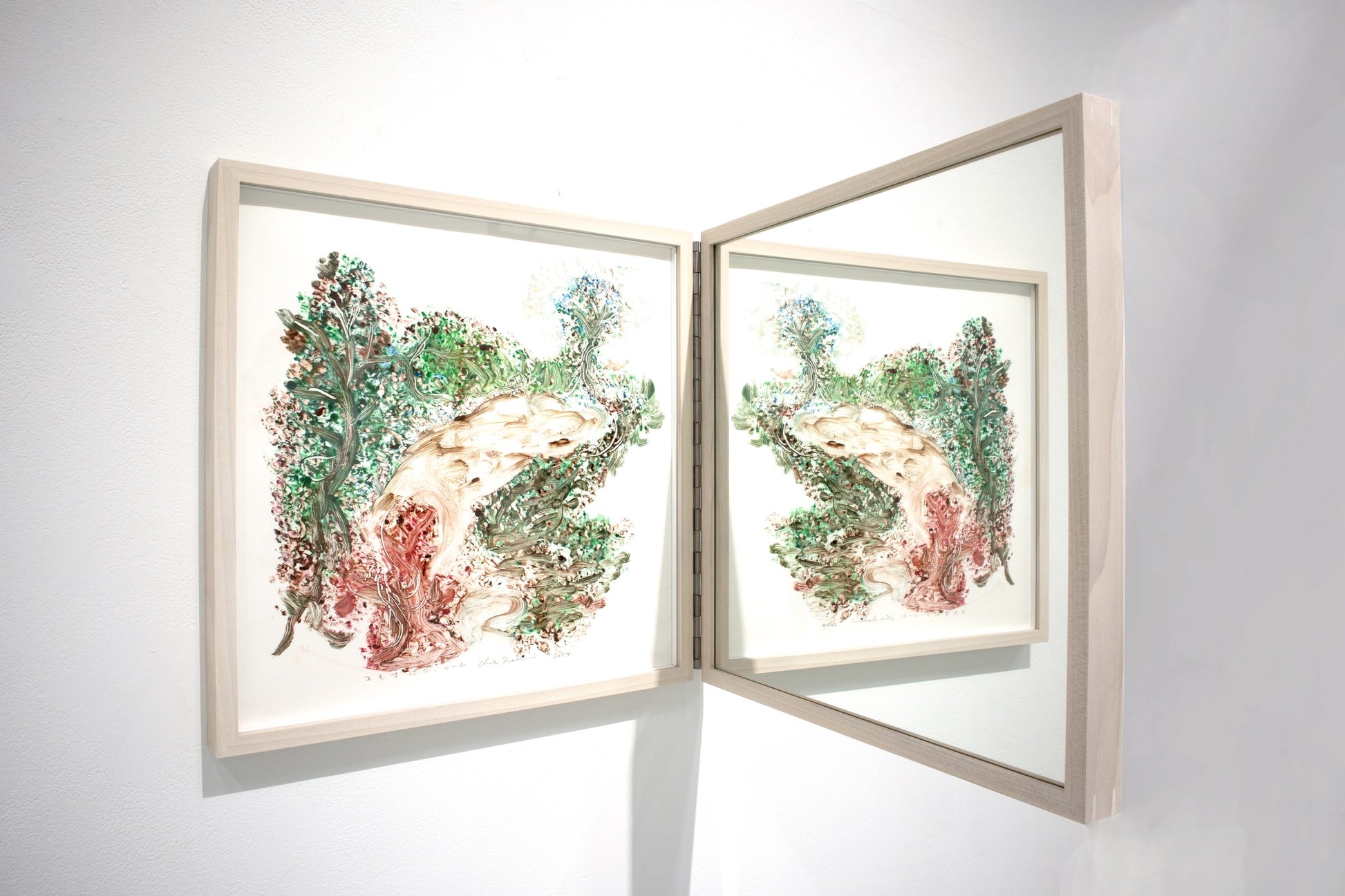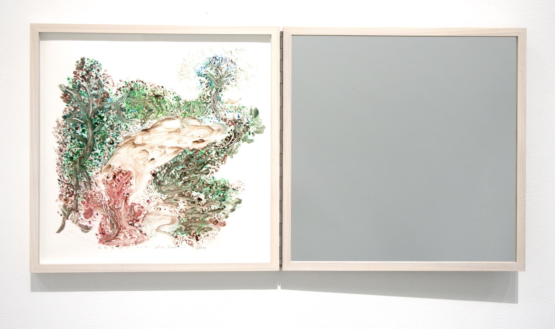 monotype, oil, pastel on paper, mirror, wooden frame