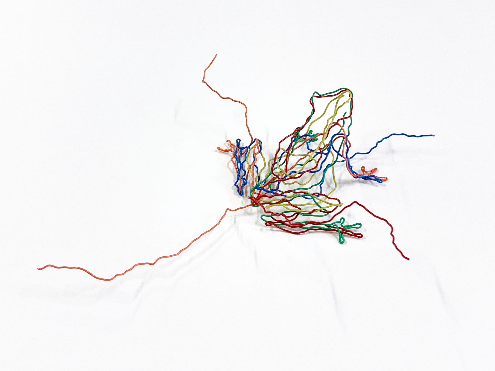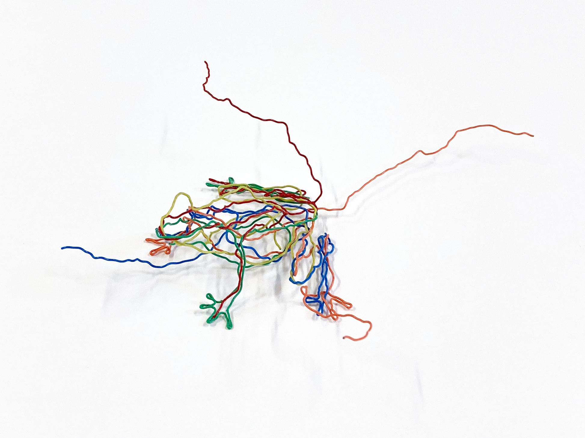The multiple colours of the coloured wire used in this work blend together and move towards grey, which represents Imamura's neutral way of perceiving the world.