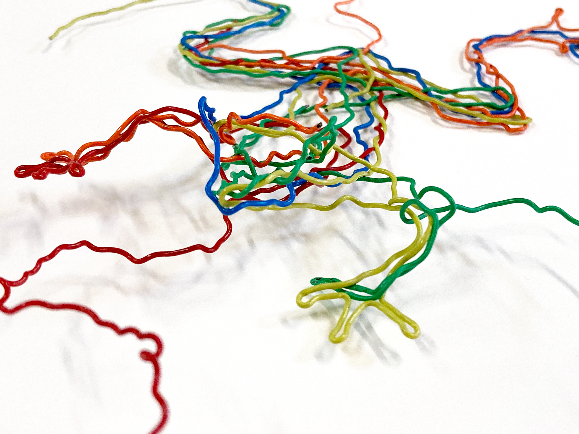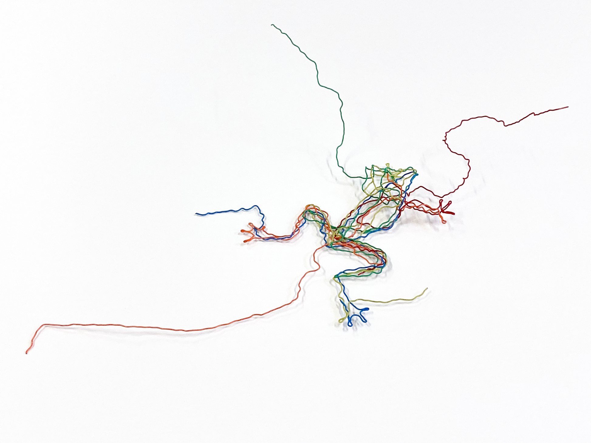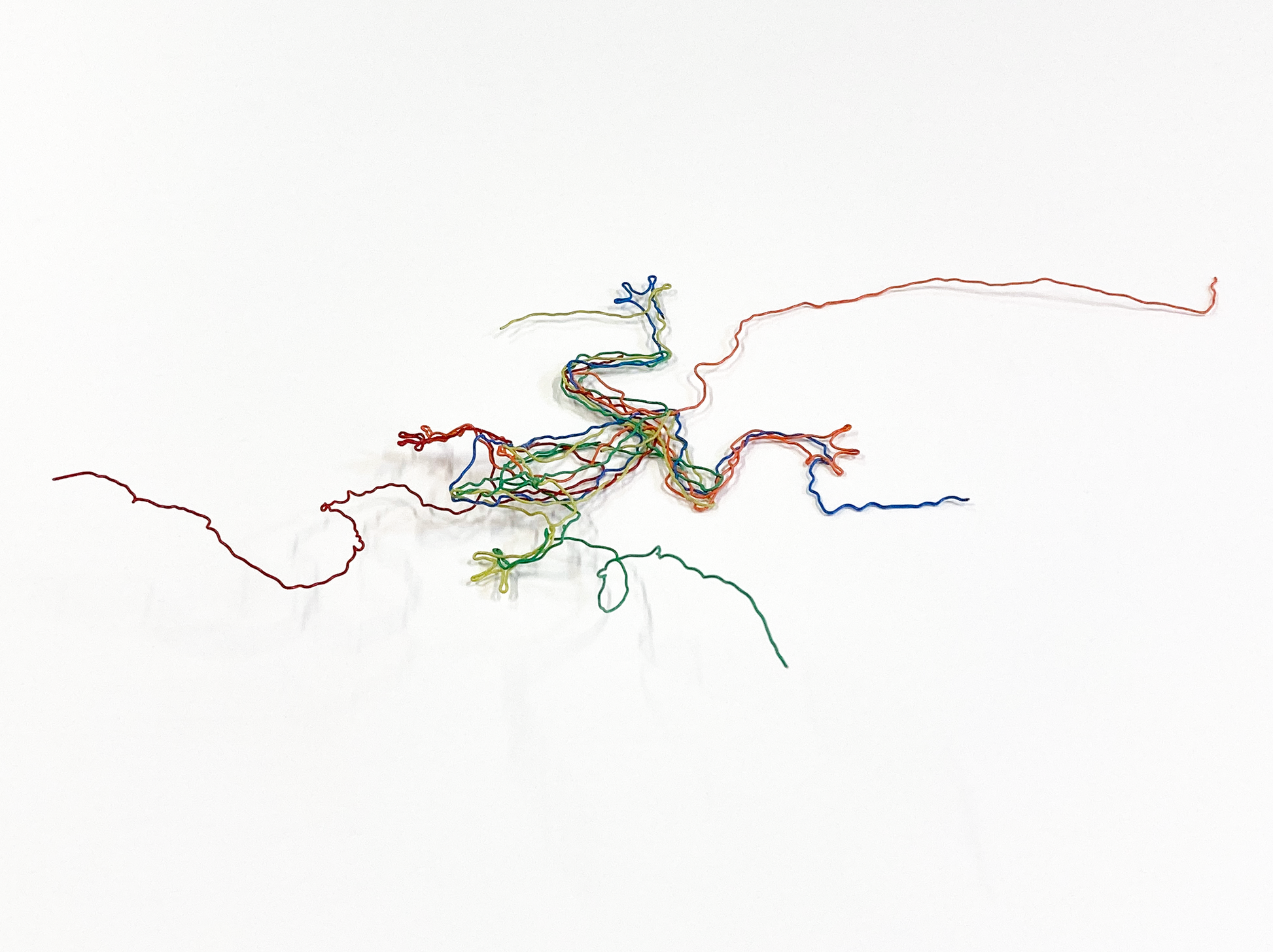 The multiple colours of the coloured wire used in this work blend together and move towards grey, which represents Imamura's neutral way of perceiving the world.