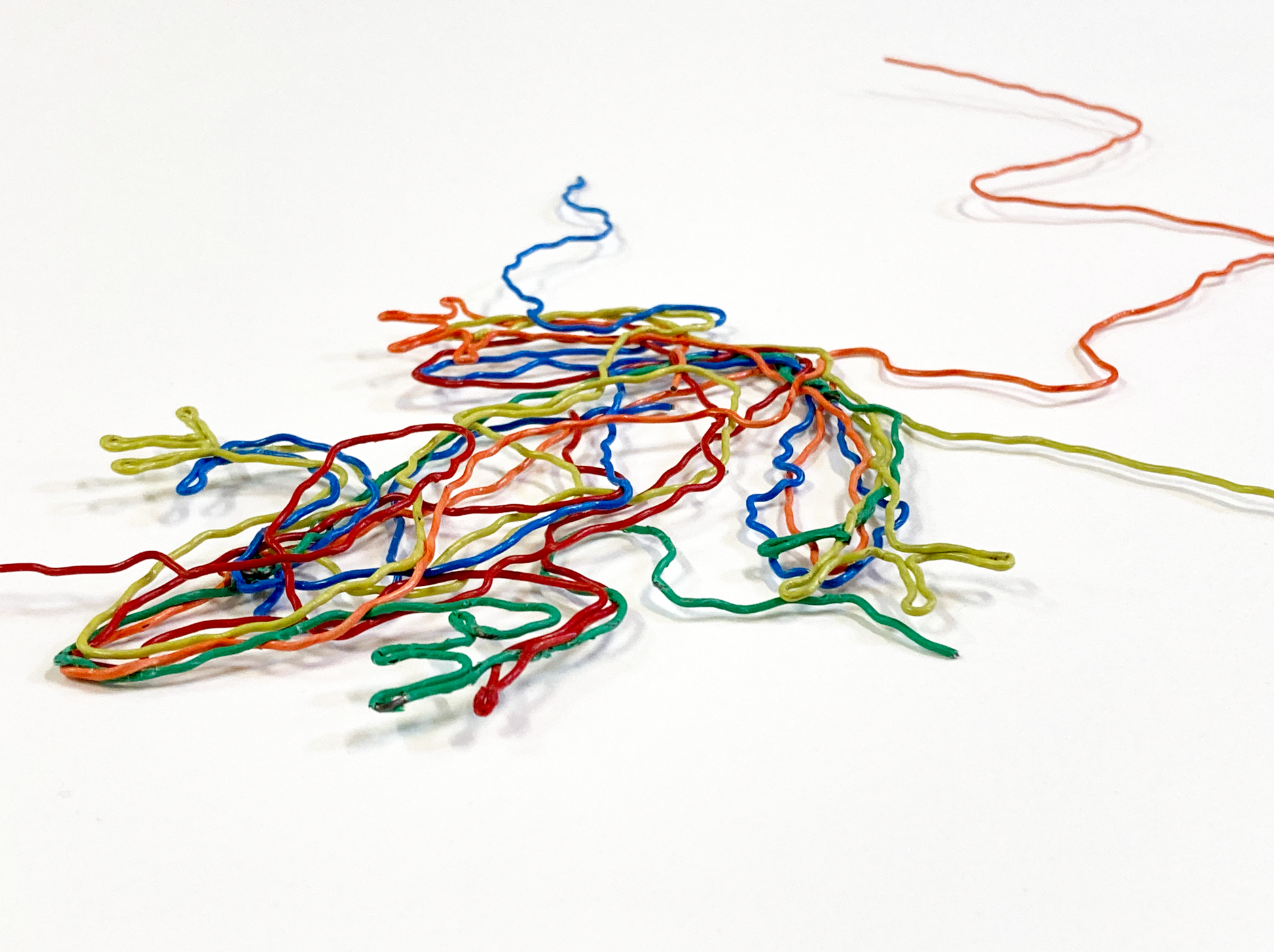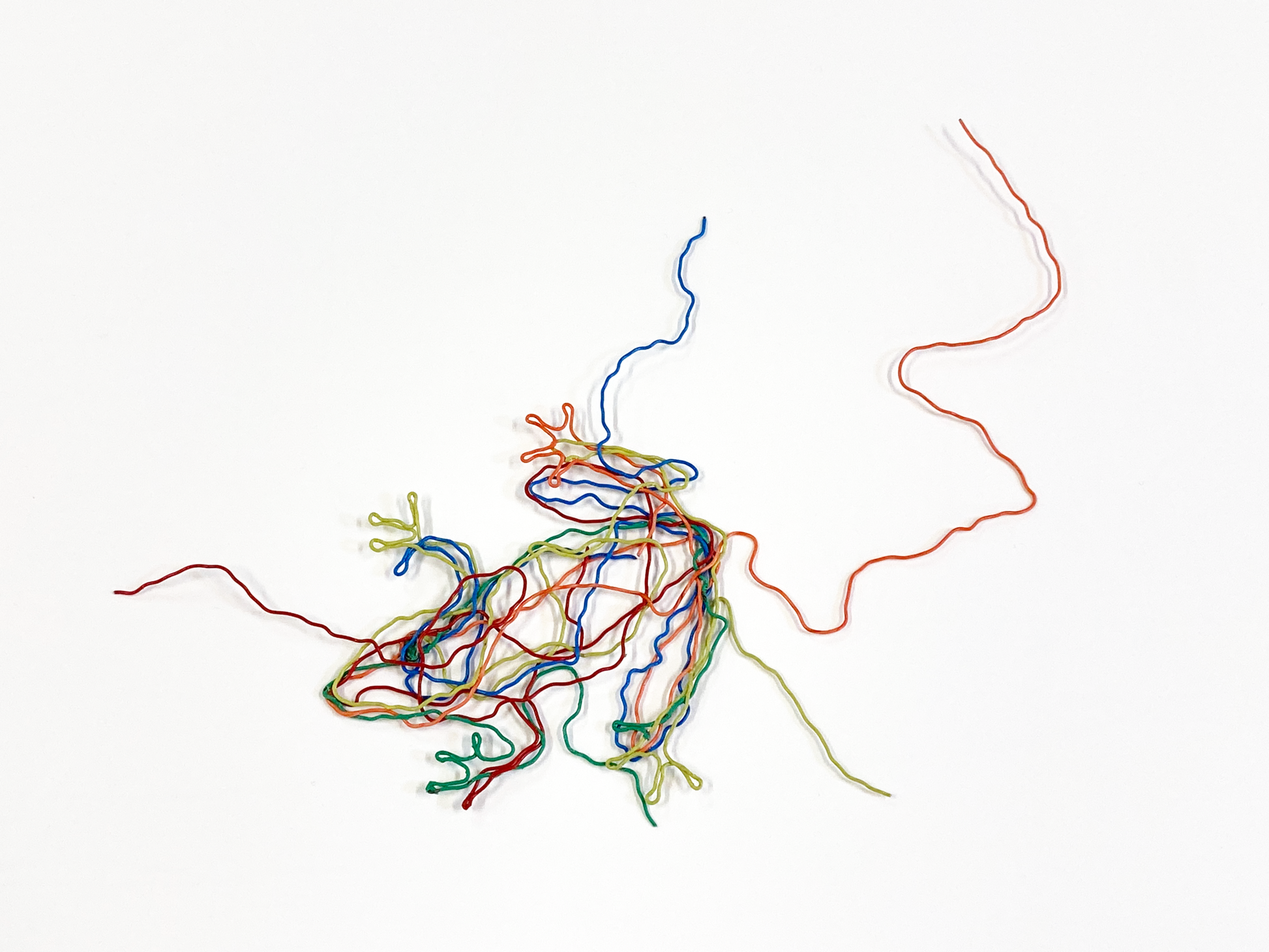 The multiple colours of the coloured wire used in this work blend together and move towards grey, which represents Imamura's neutral way of perceiving the world.