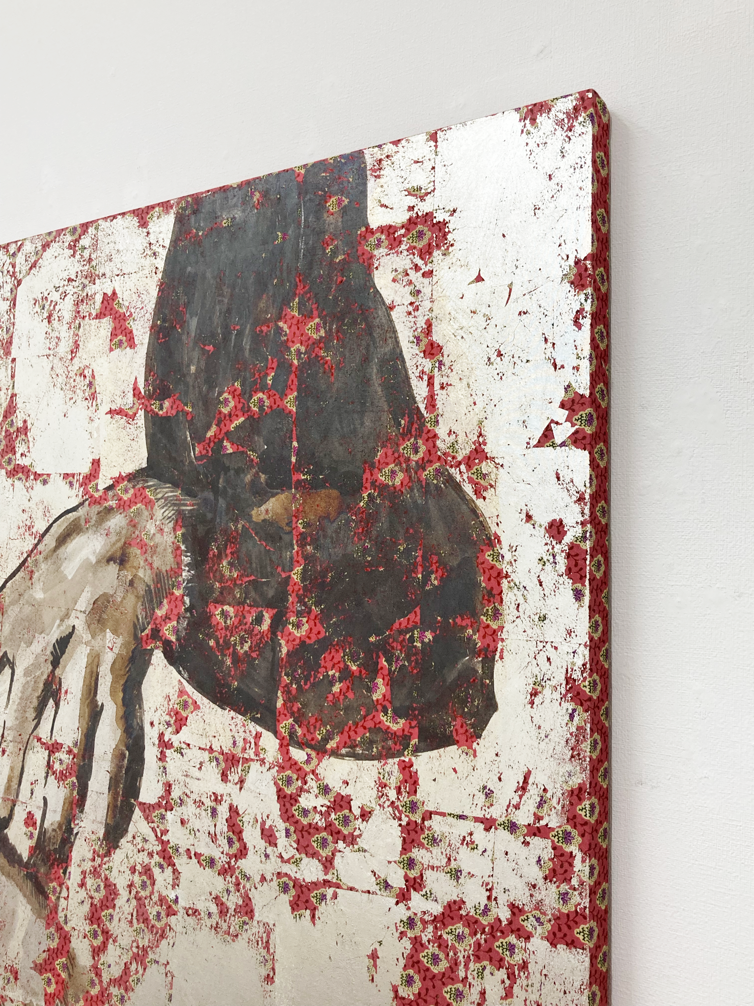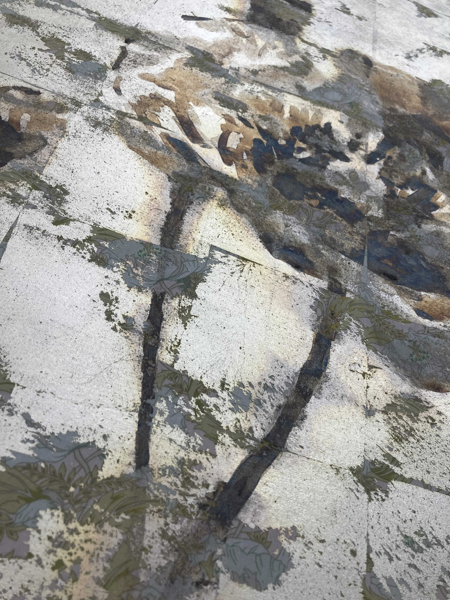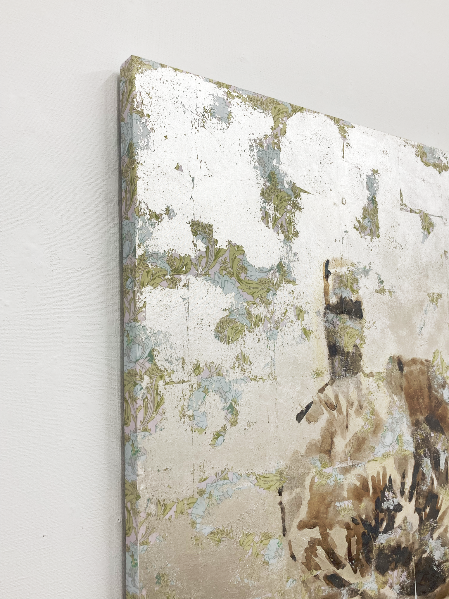 This work is one of the new series [Silver], in which silver foil attached to fabric is drawn by sulfurizing it in a smoking solution. Kotani's method of expression is to artificially generate a phenomenon that originally occurs in nature over time.