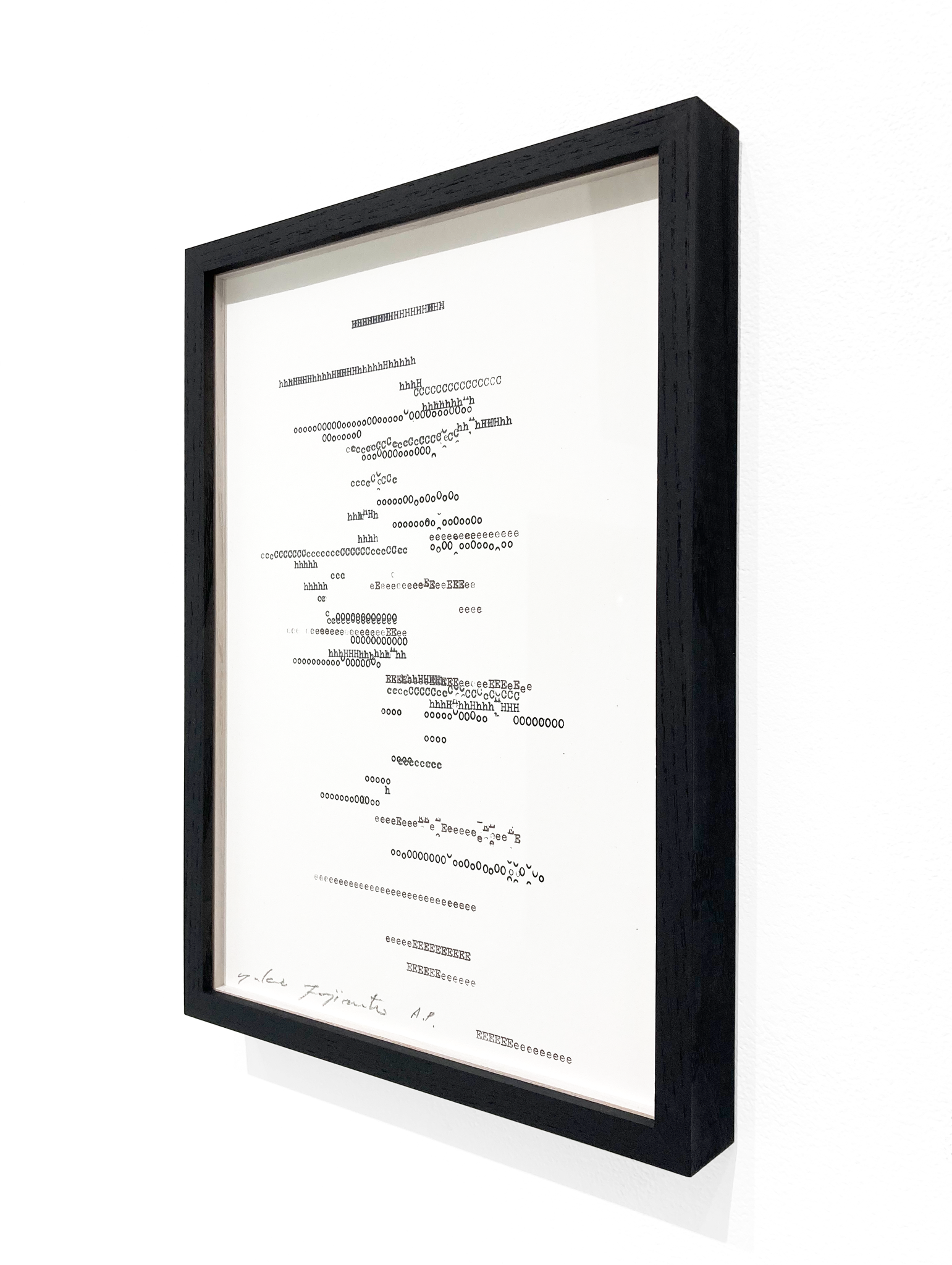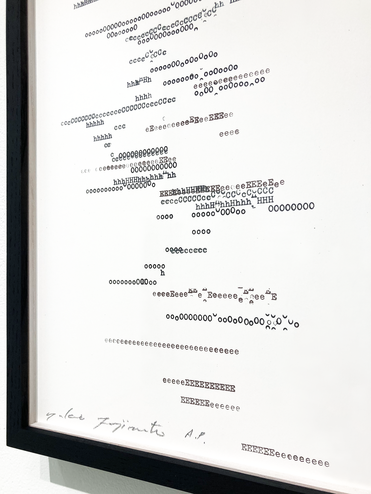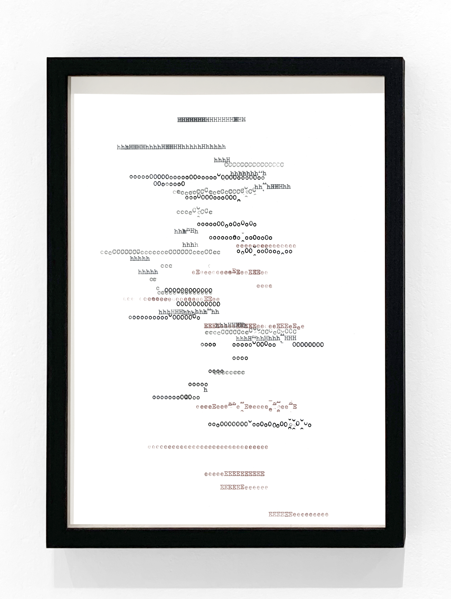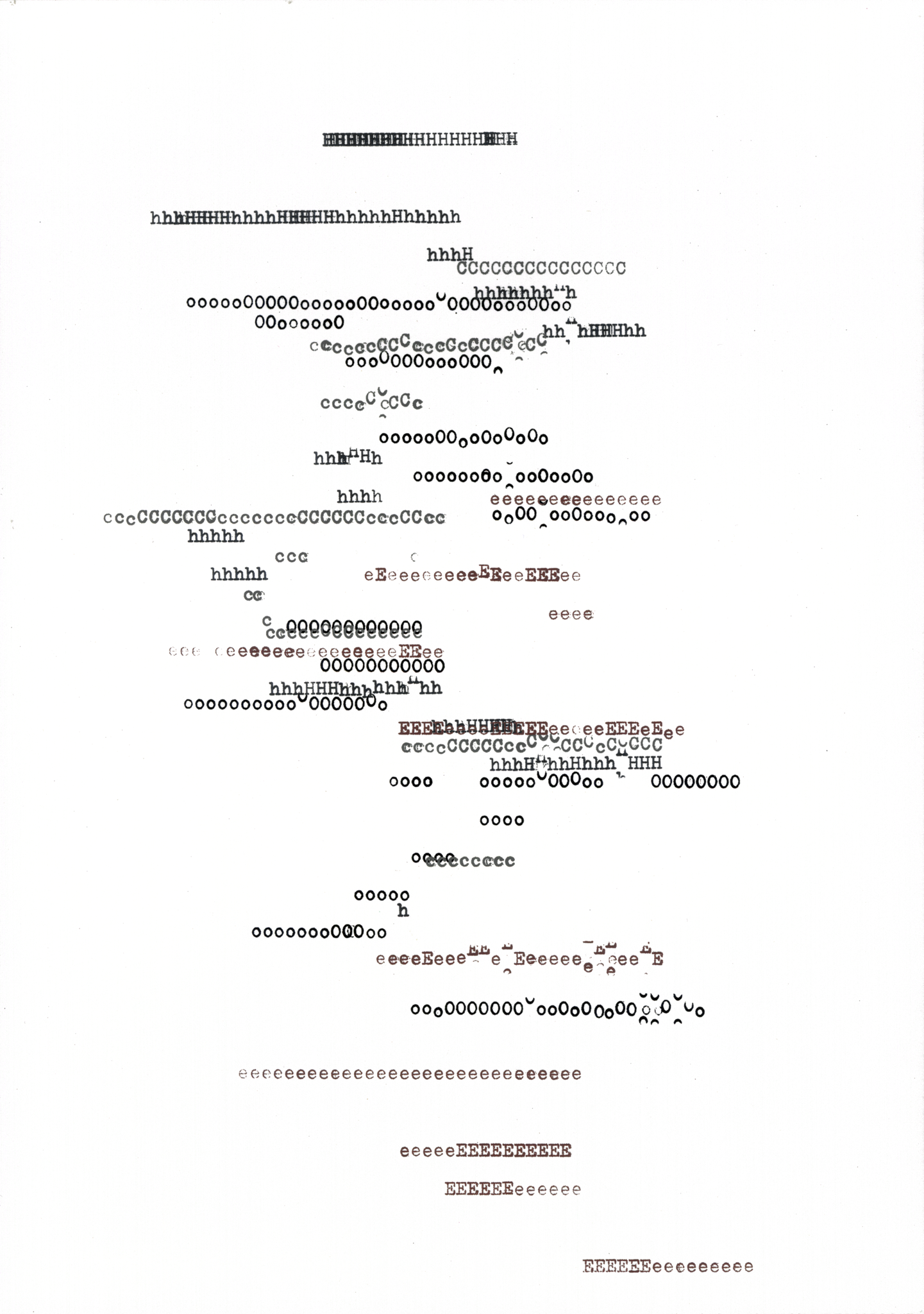 This work is a silkscreen print based on a typewritten manuscript (four typed drafts of the letters "E", "C", "H", and "O").