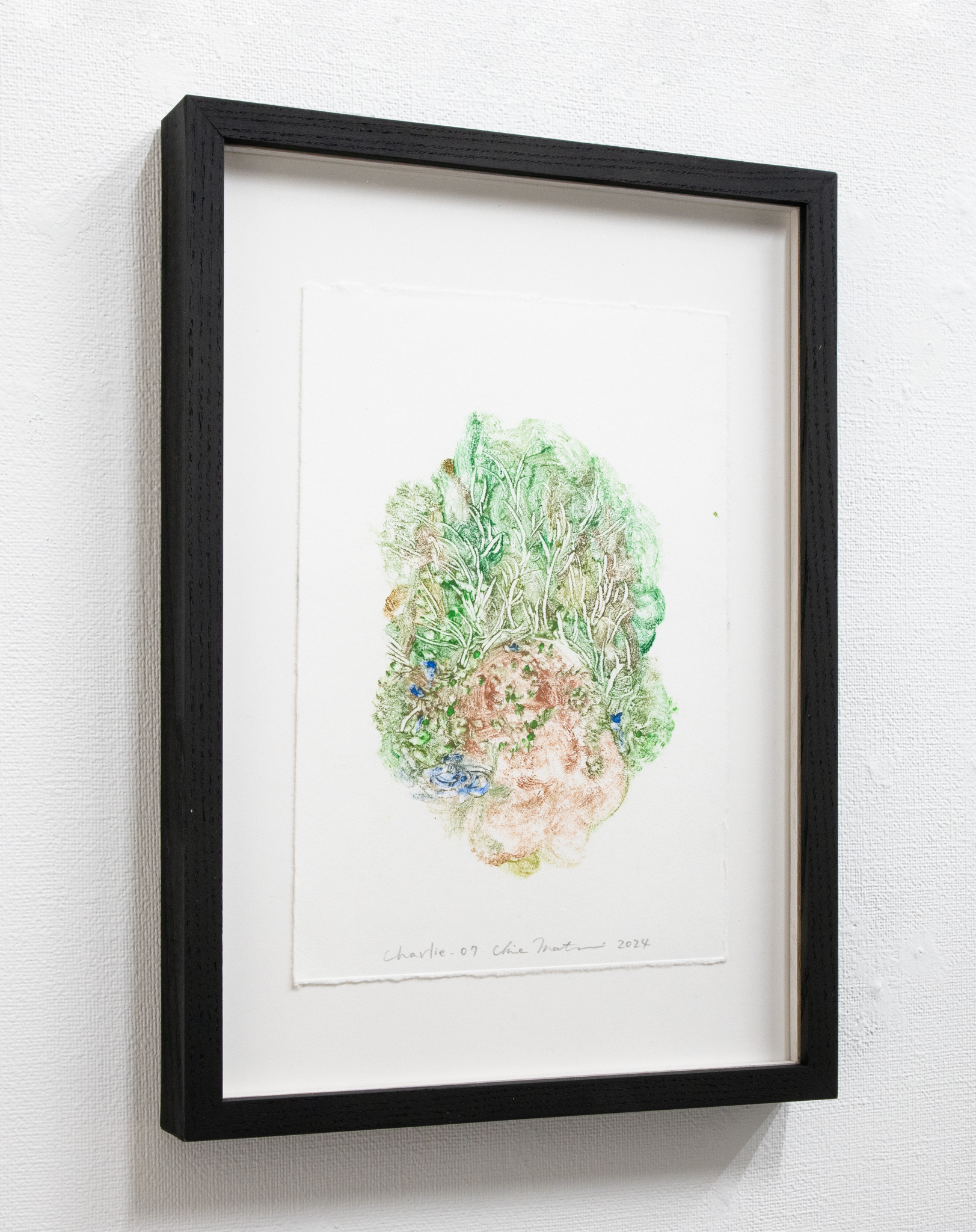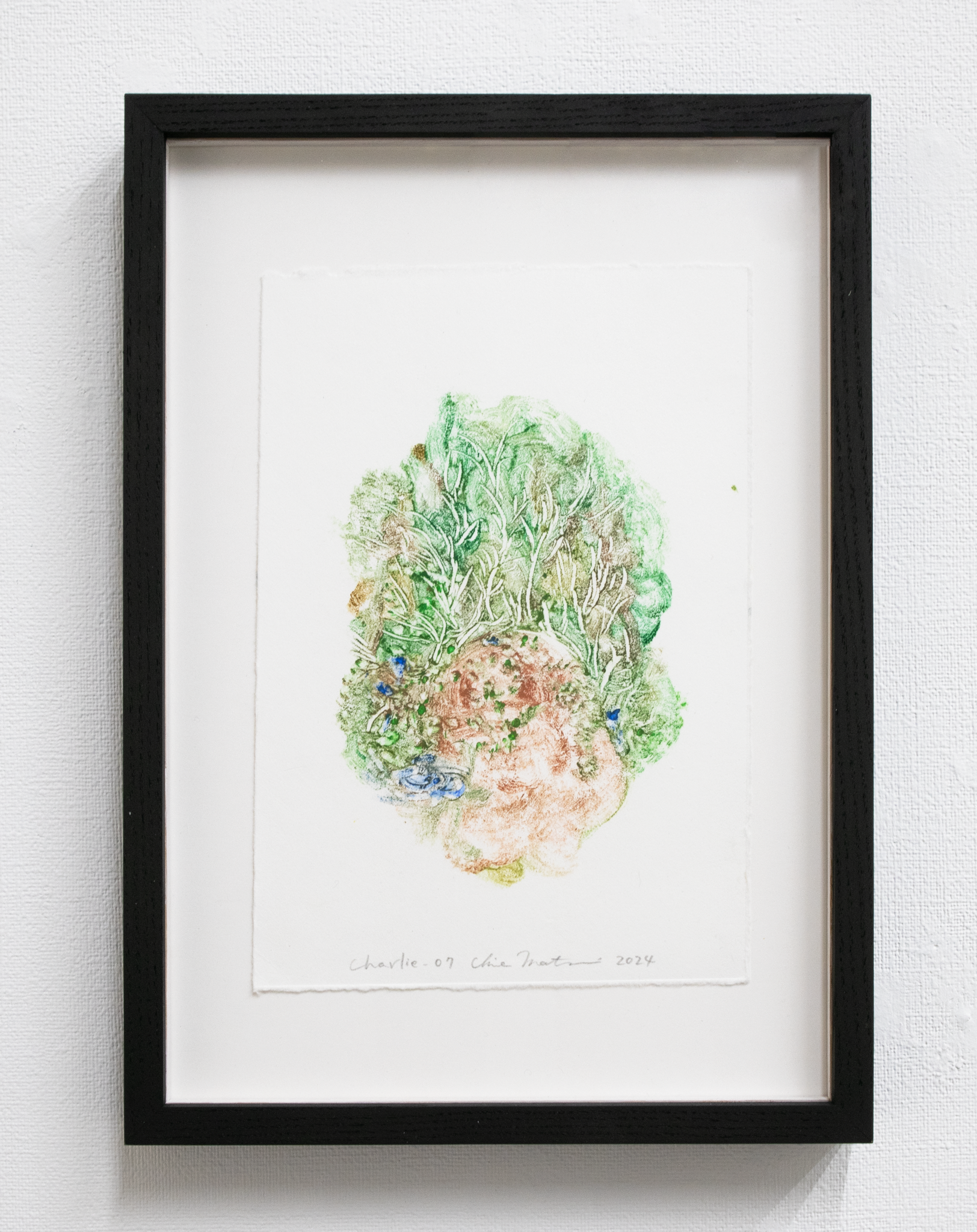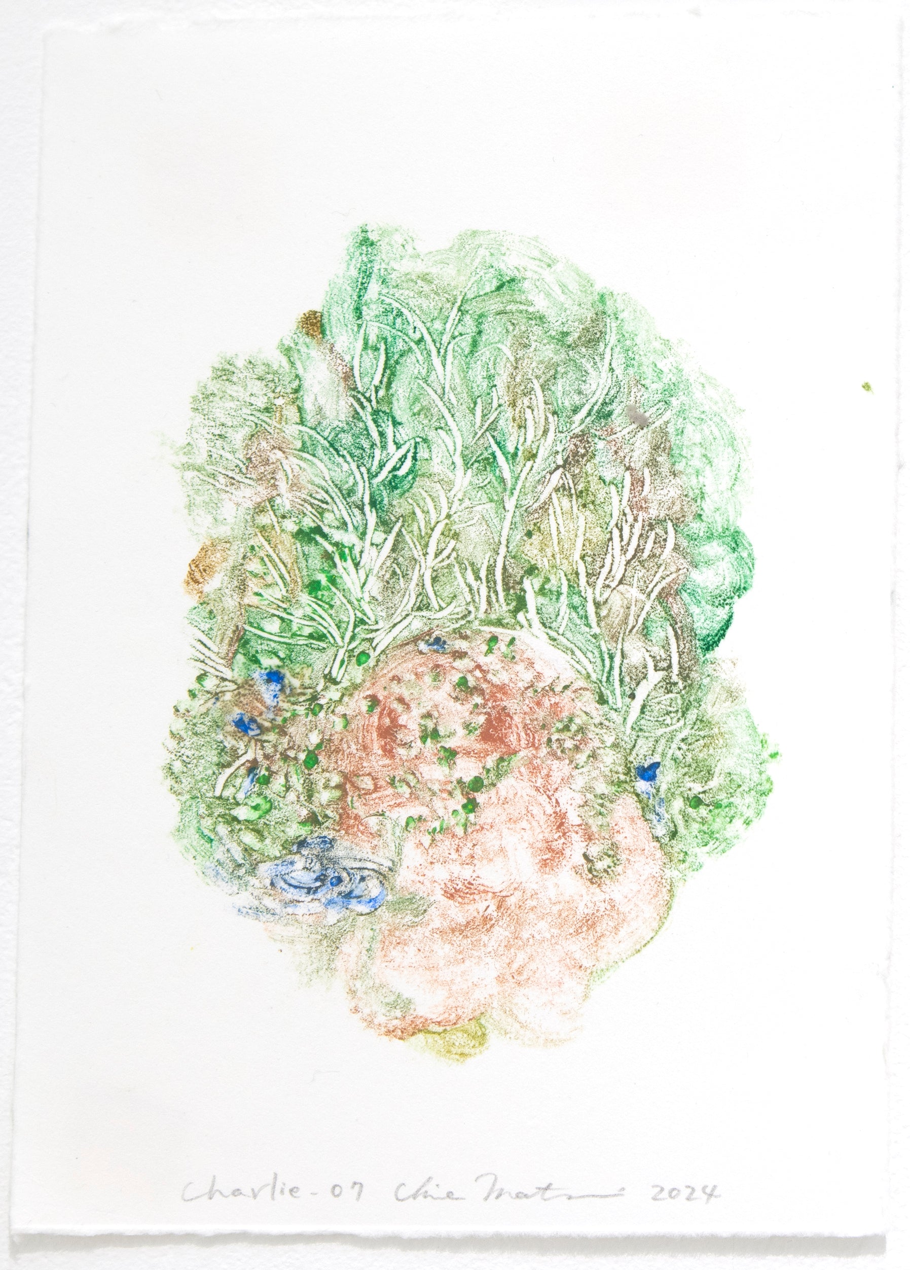 今回は、モノタイプの技法と重ねて「鏡」というテーマが画廊主から提案された。底無し沼に⼊るようなテーマに躊躇したが、やってみないとわからないと、私は受けることにした。モノタイプはアクリル板に絵の具やクレヨンで描いたものを紙にうつしとるだけのシンプルな技法だ。左右反転し、筆触や絵の具の盛り上がりがない、あっさりとした質感の絵が出来上がる。しかも⼀枚のみである。なぜ、⼀枚の転写のためにわざわざ絵を描くのか。鏡という意味深い⾔葉と、実際に出来上がった軽やかな画⾯とのズレが悩ましく、解けない問いを⽴ててしまった。以下に、制作中に浮かんだ雑記を記す。