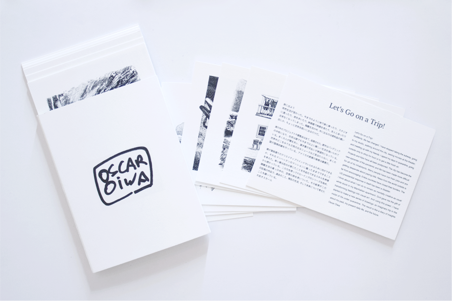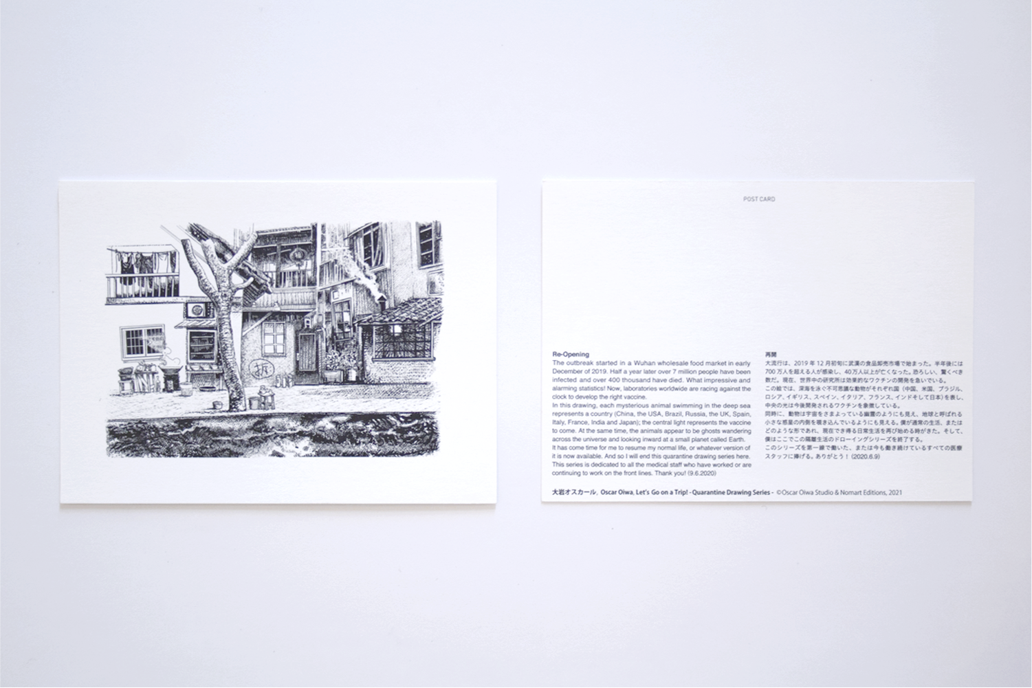 2020年、コロナ禍で世界各国でのプロジェクトや展覧会が全て延期となった大岩オスカールが隔離生活の中で描いた空想の旅ー20点のドローイングを版画作品としてノマルから出版。その全作をポストカード化し、セットにしました。