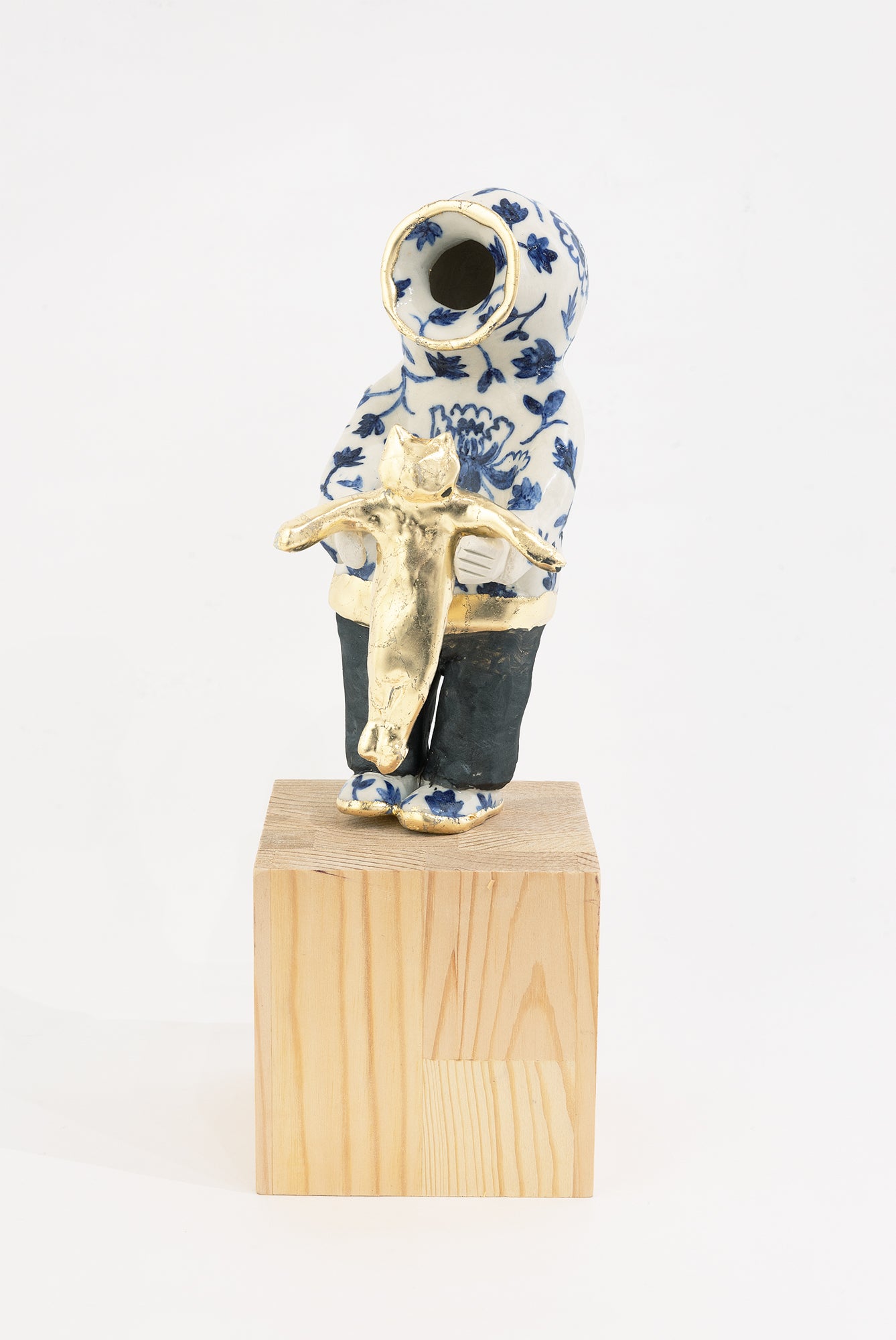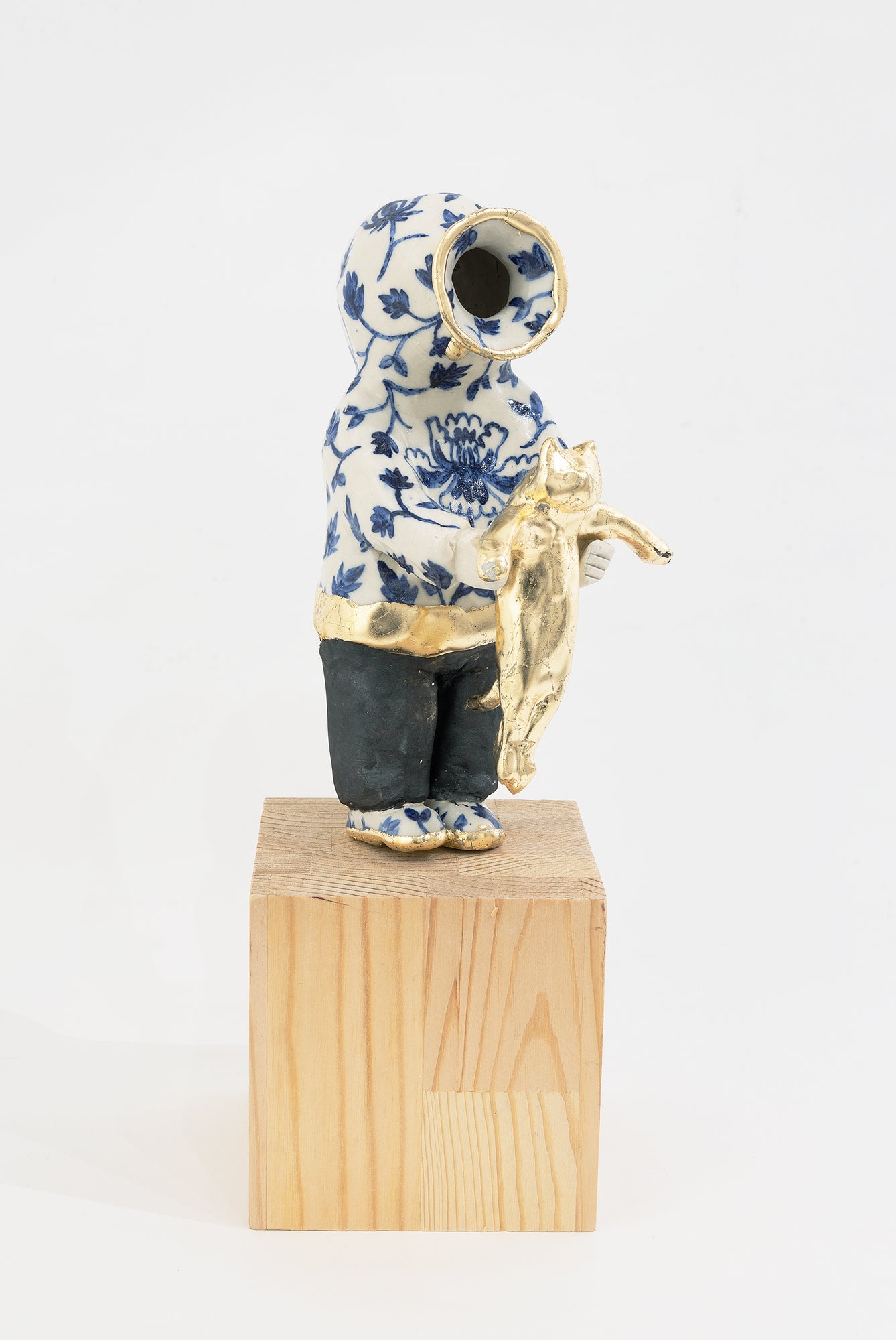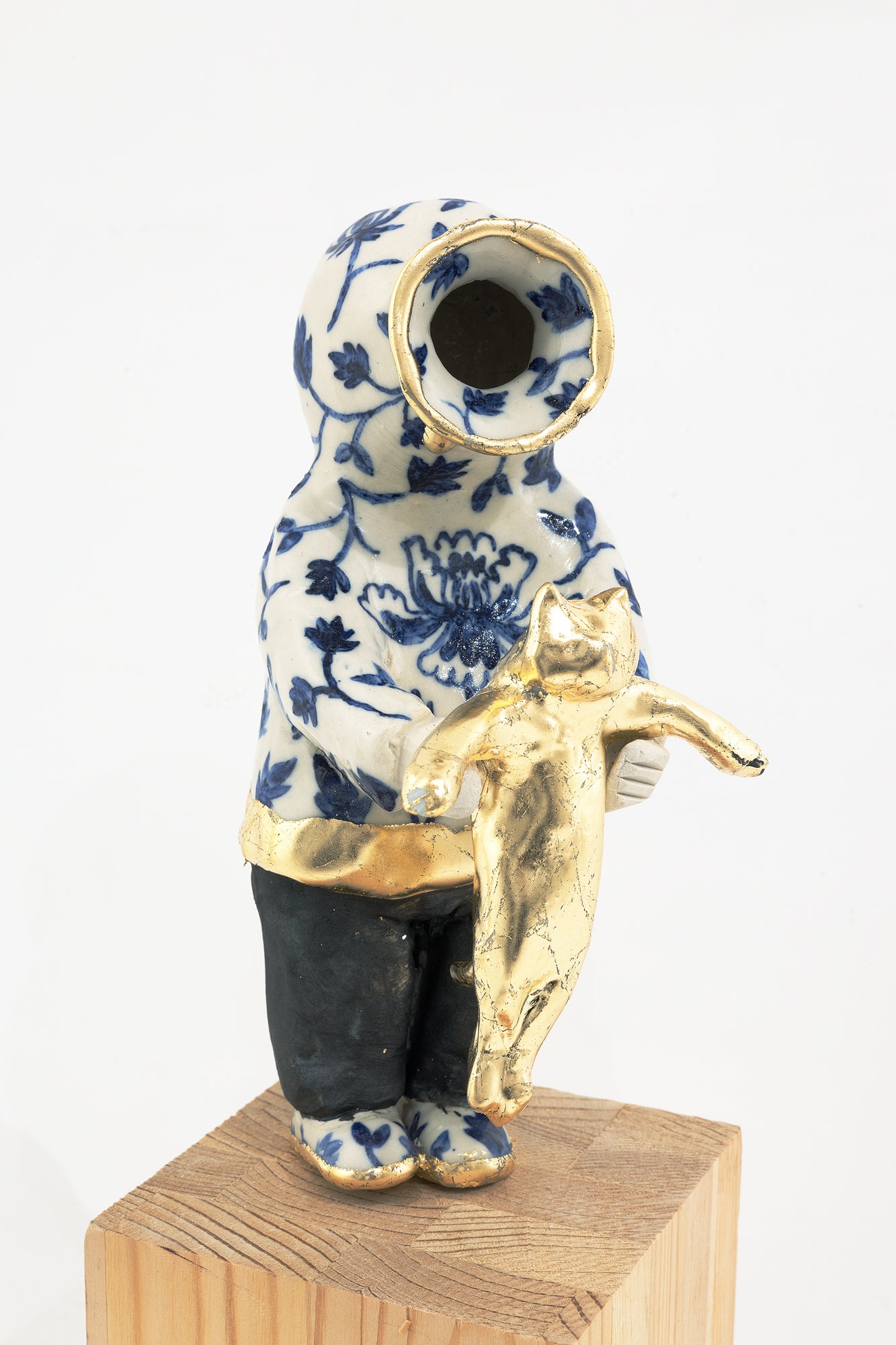 「からっぽに満たされる」という作品は、人や動物など生物の顔の部分を花瓶や壺などの陶器の口の部分に置き換えた肖像のシリーズです。ひとつひとつの作品は焼き物の土を使い、手びねりで中を空洞にしながら制作をしています。顔には穴が空いており、その表情は見えませんが佇まいや仕草などから一点一点の存在の輪郭を感じ取ることが出来ます。
