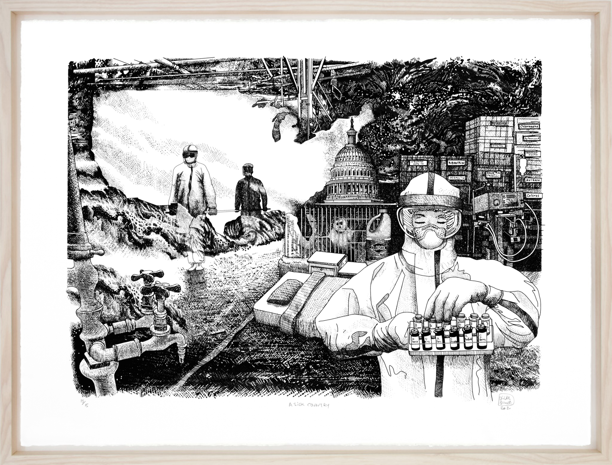 「Quarantine Drawing Series」はコンピュータを使って描かれたデジタルデータですが、アーティストの空想の旅を、全世界の人と分かち合う手段としてシルクスクリーンによる版画作品に刻印することに。かくして計20点、エディション数限定15の版画作品として2020年末に完成しました。