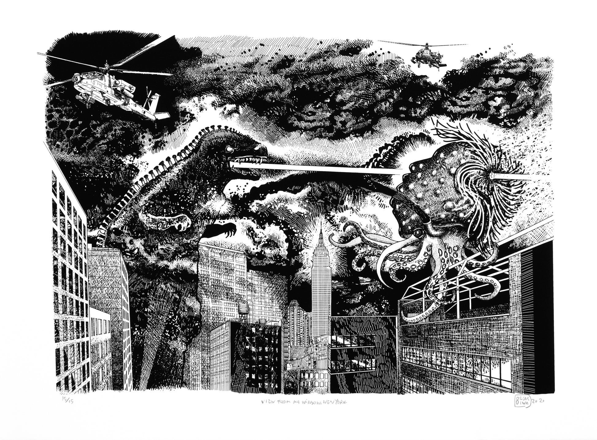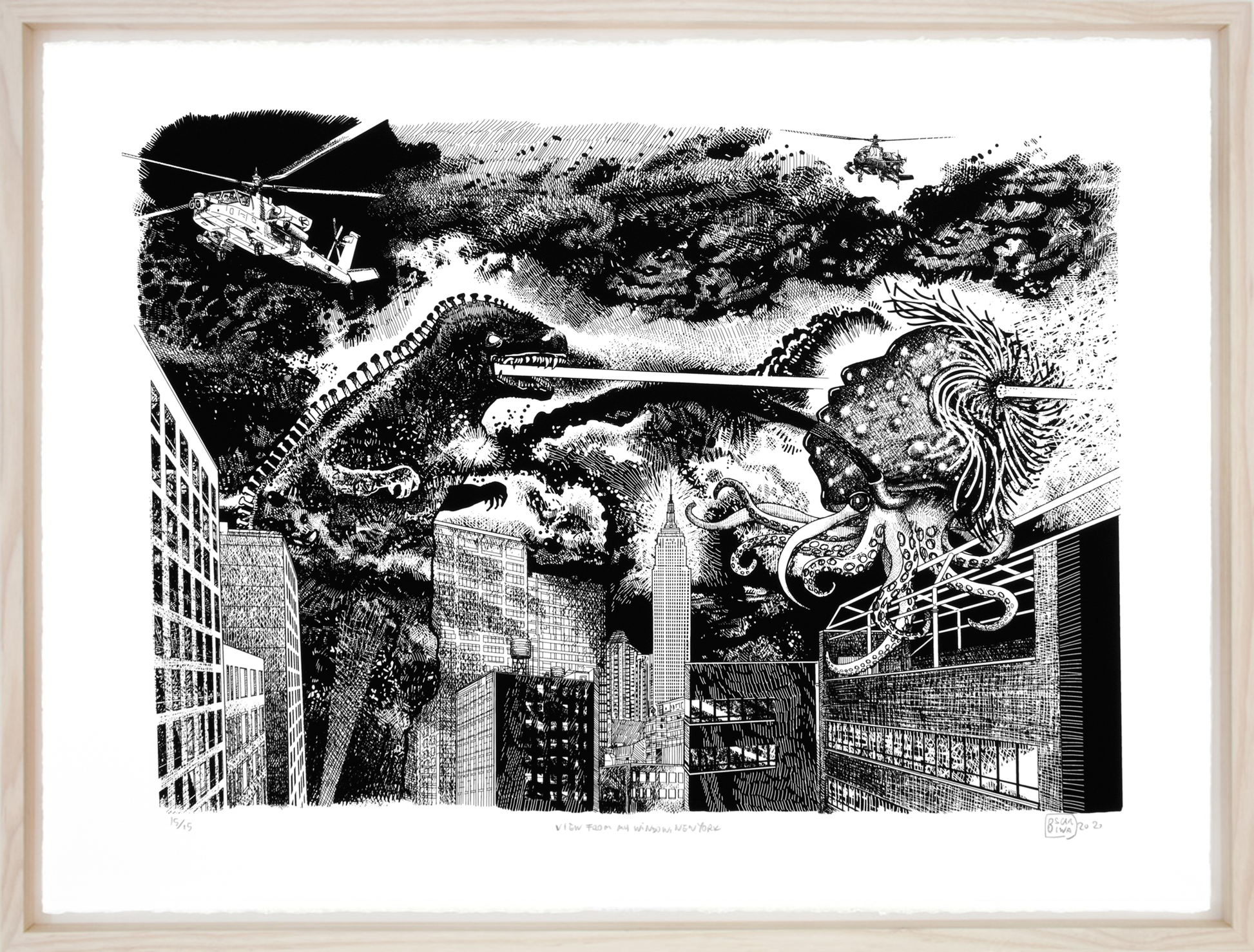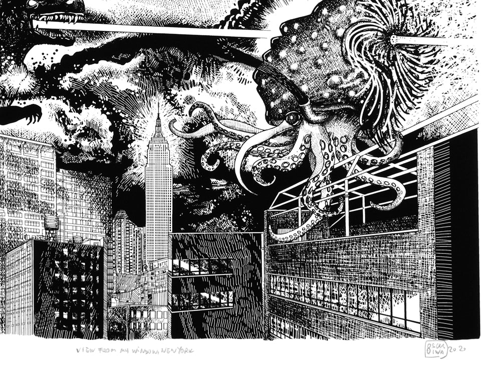 隔離生活中、人々は長時間コンピュータに向かっている。人々はソーシャルメディアを使って、自宅からの小さなコンサートや料理の技、そして窓からの眺めなどをシェアする。僕の窓は映画館の大きなスクリーンのようだ。この街は悪者とスーパーヒーローの過密都市なので、ここから多くのことが起るのが見える。今夜のお楽しみはB級SF映画の代表作、コジラ対トラントパスの大決戦!