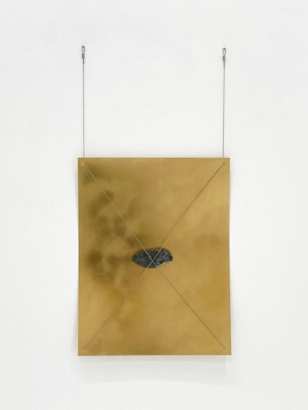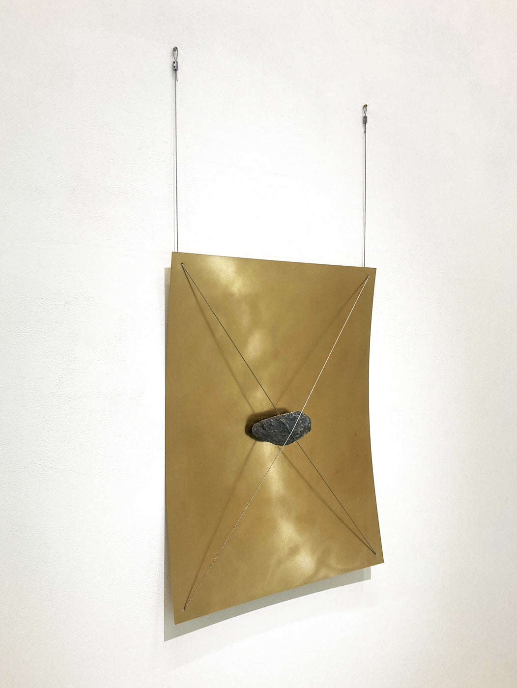 正方形の真鍮板・長方形の銅板と自然石がワイヤーで繋がり壁面にある。石は2本の釘と、真鍮板は石の重さで落下の停止の状況が作られている。