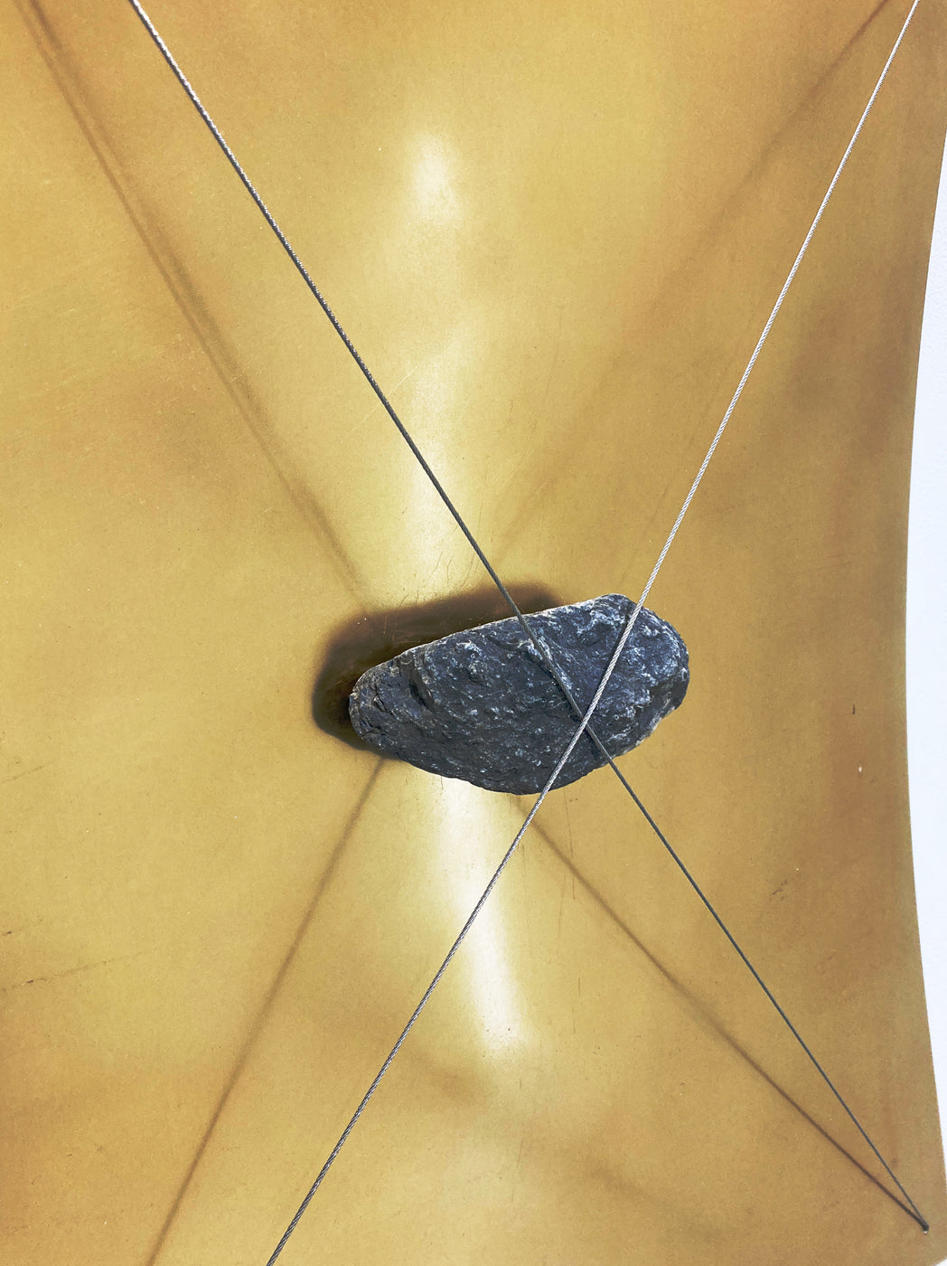 ここには真鍮板と石とワイヤーからなる関係から見えない重力、引力を目で確かめることの出来る重力のかたちの場が作られる。