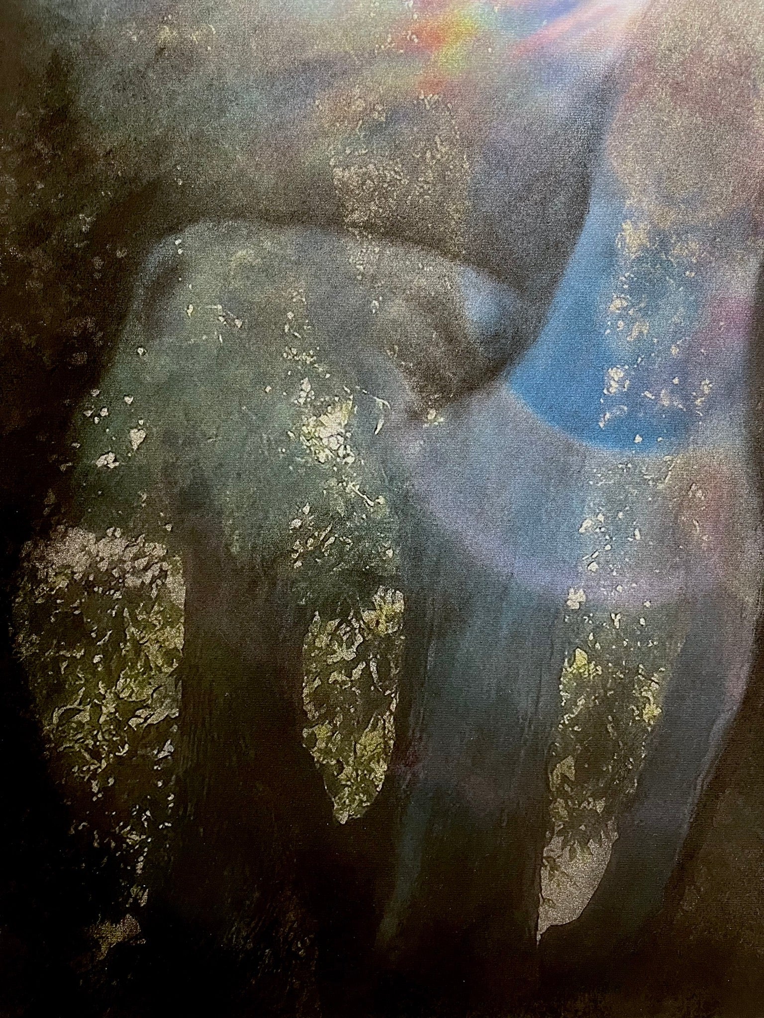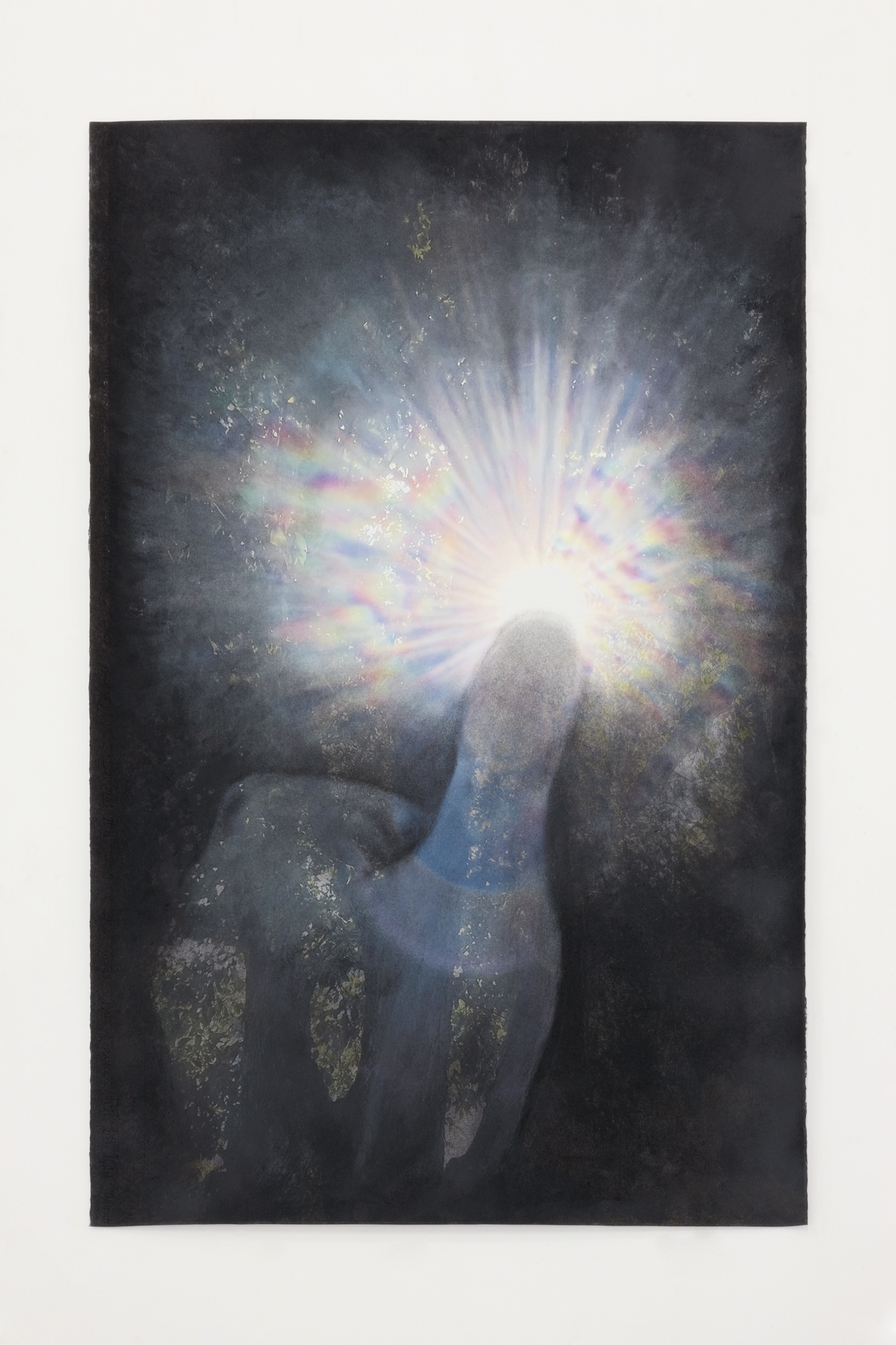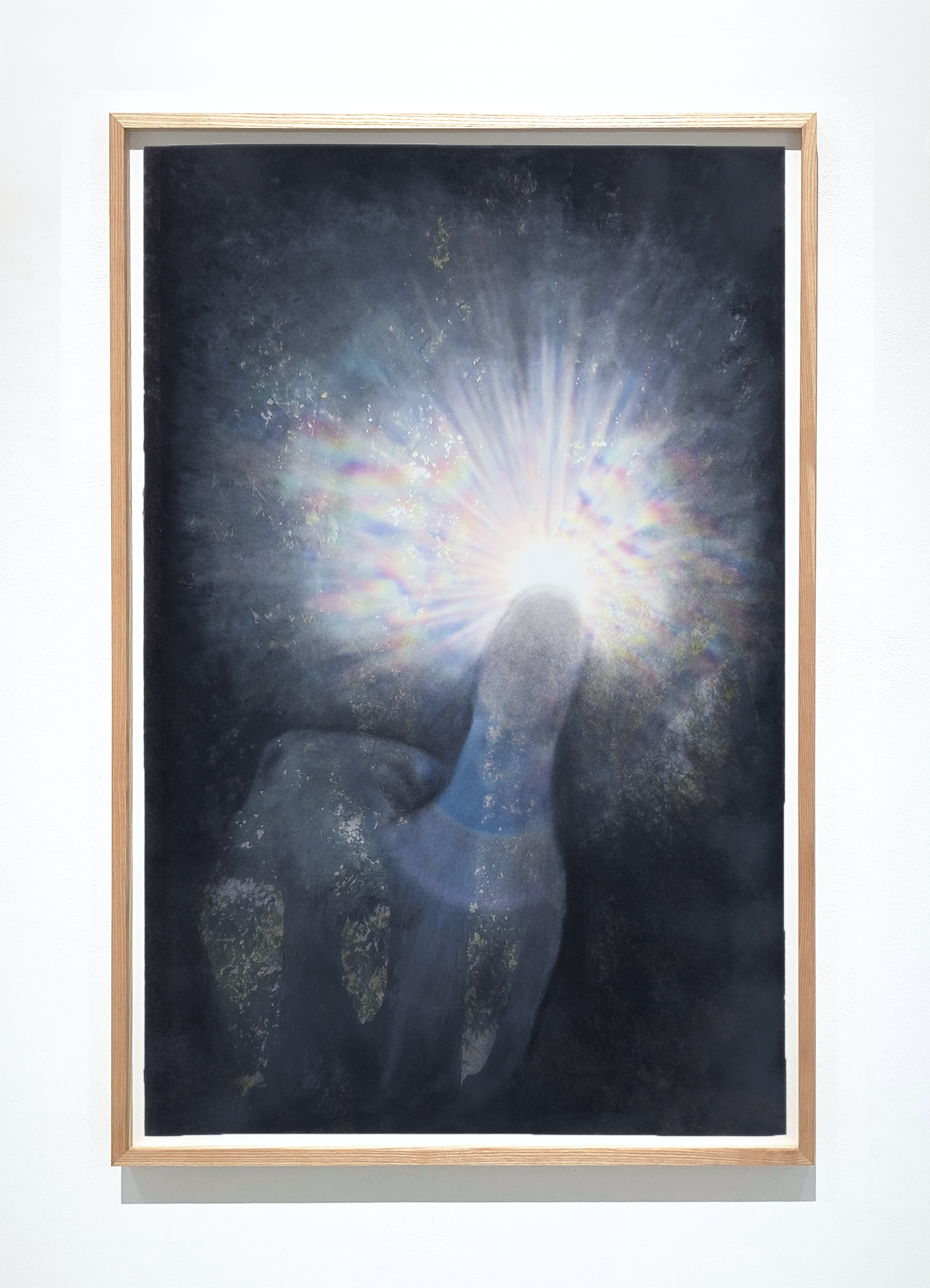 長年にわたり、他者の身体に触れて感じ取ったエネルギーを形として表現してきた池上。本作を含むノマルとのコラボレーション「Prayer」シリーズでは、ガネーシャ、シーサー、日本刀、仏像といった、個人の感覚を超えて精神の深層を象徴するモチーフを中心に据え、手や指を使って自身のアウラを塗り込めるように、木炭や胡粉によるドローイングを展開しています。
