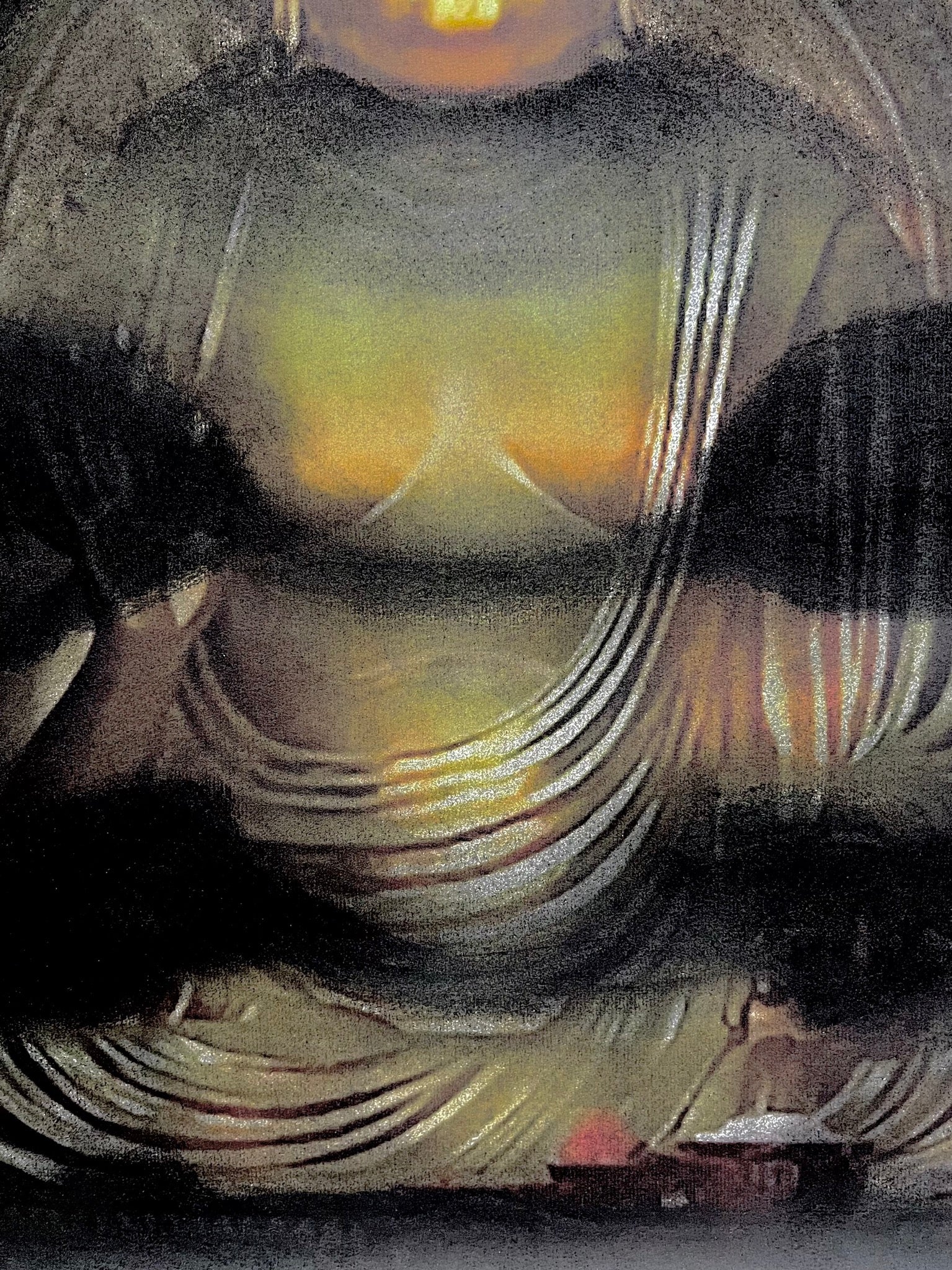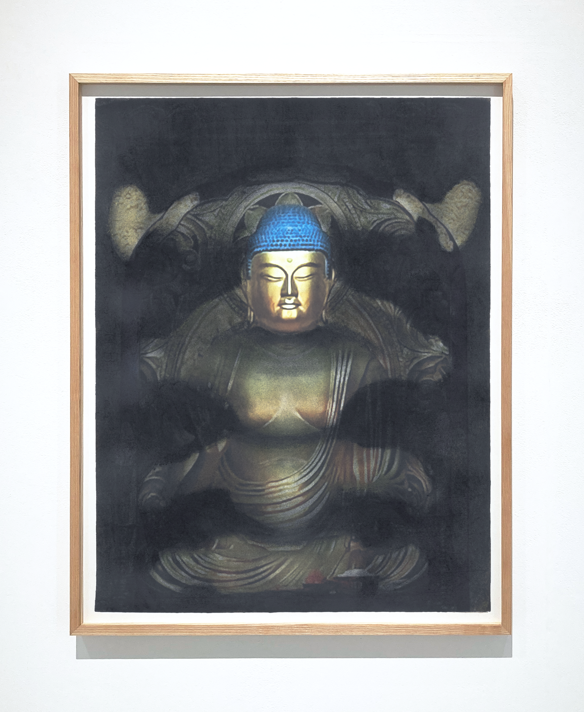 長年にわたり、他者の身体に触れて感じ取ったエネルギーを形として表現してきた池上。本作を含むノマルとのコラボレーション「Prayer」シリーズでは、ガネーシャ、シーサー、日本刀、仏像といった、個人の感覚を超えて精神の深層を象徴するモチーフを中心に据え、手や指を使って自身のアウラを塗り込めるように、木炭や胡粉によるドローイングを展開しています。