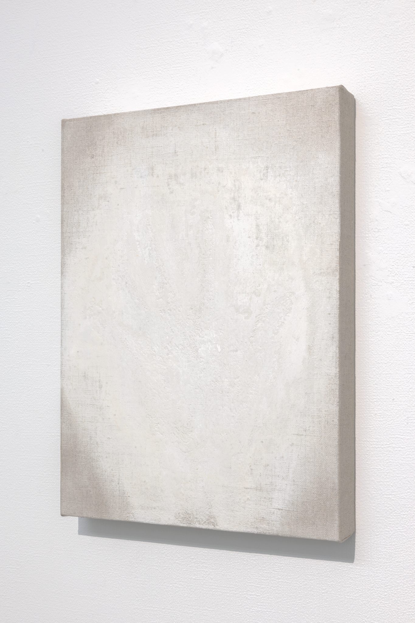 「Prayer 光明」「Prayer 希望」は、それぞれのキャンバスに左と右の手のひらのイメージが胡粉によって塗り込められ、光で浮き上がるように見える作品です。
