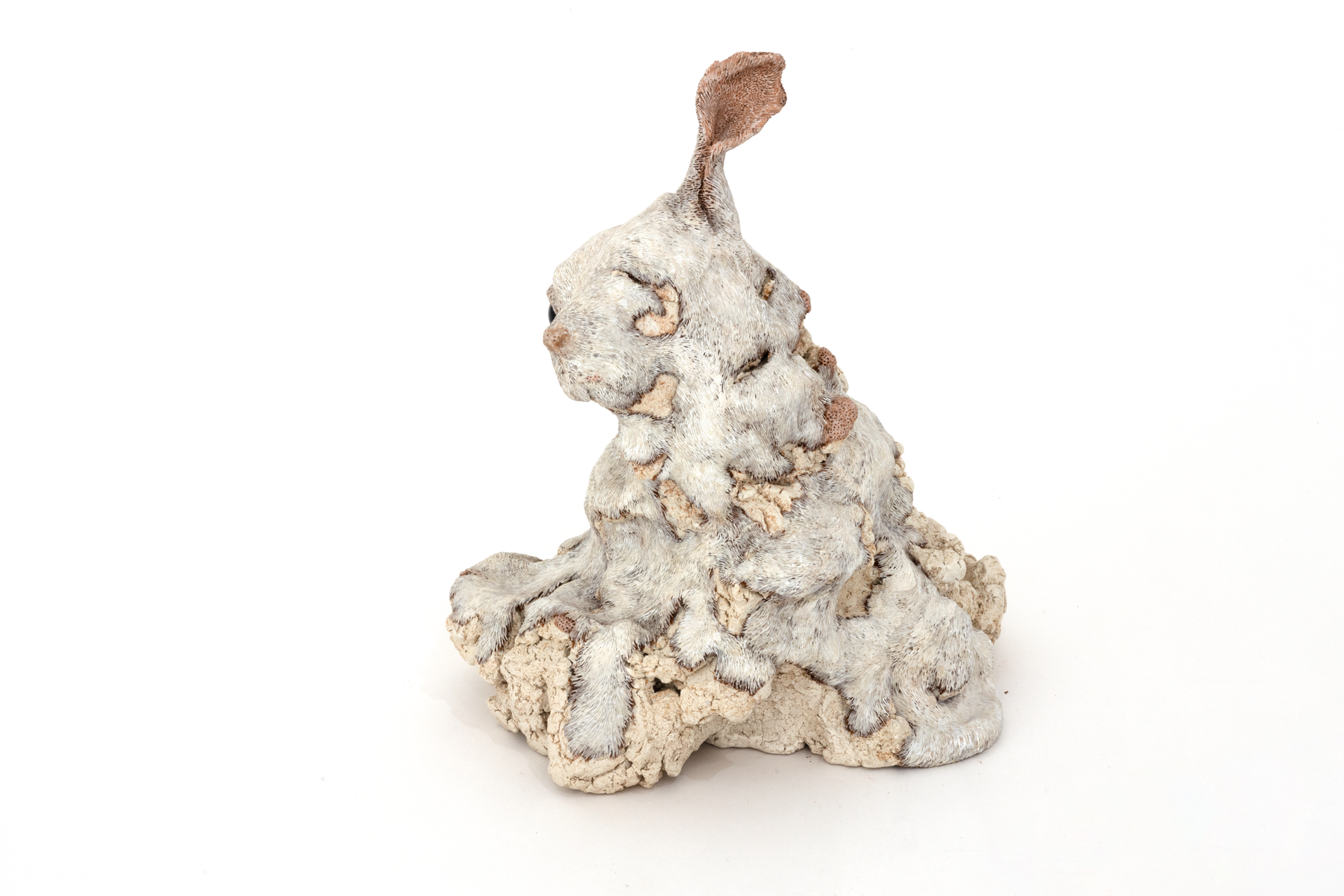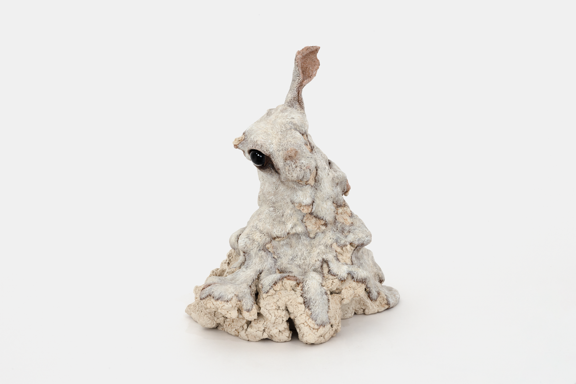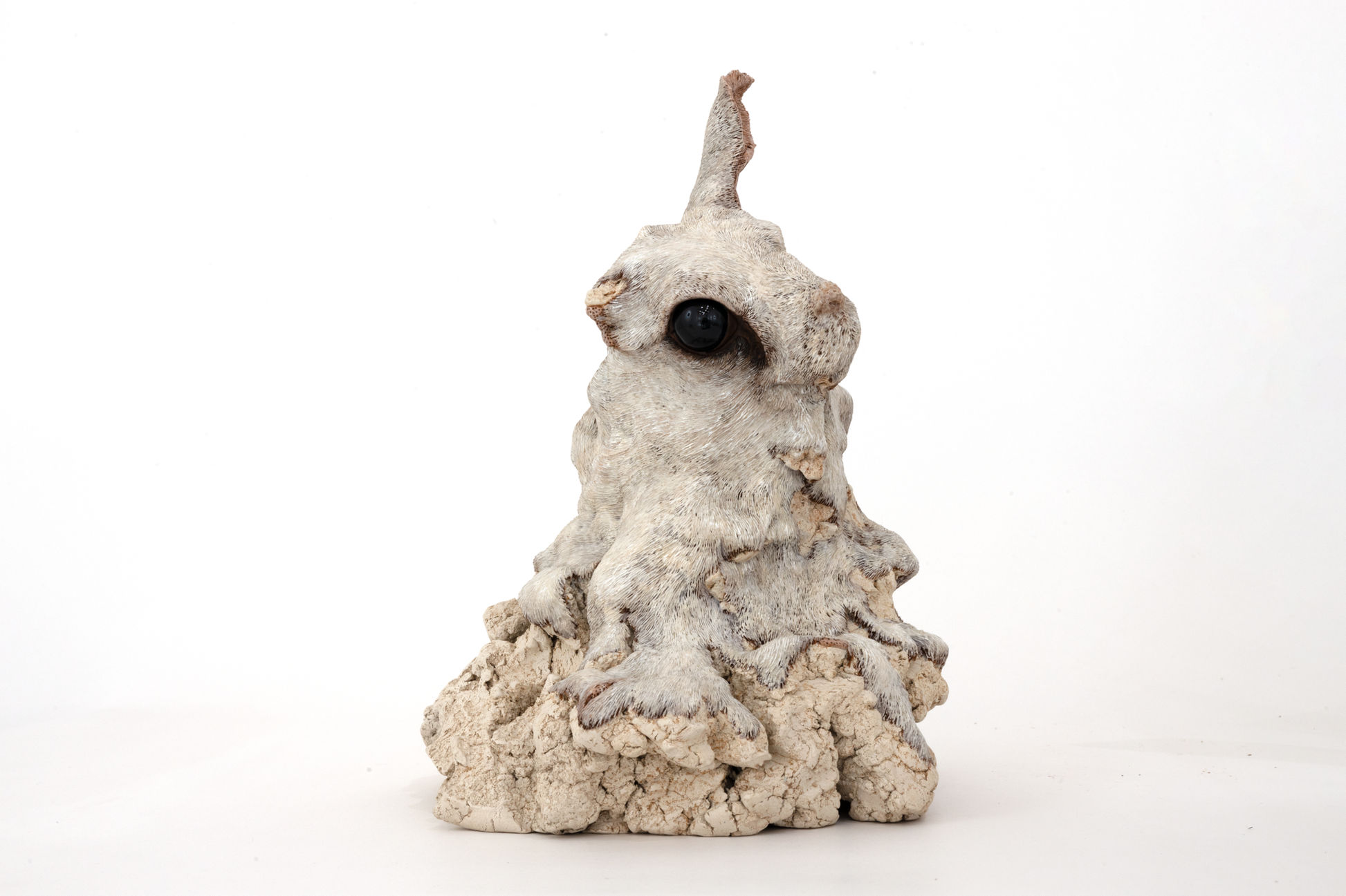 緻密な毛並みに覆われた精巧な作品群は一見すると写実的ですが、自身の記憶のみでかたち作るその造形は見る人に不思議な違和感と余韻を残します。