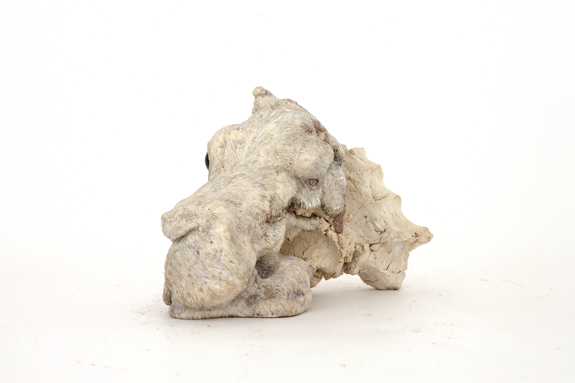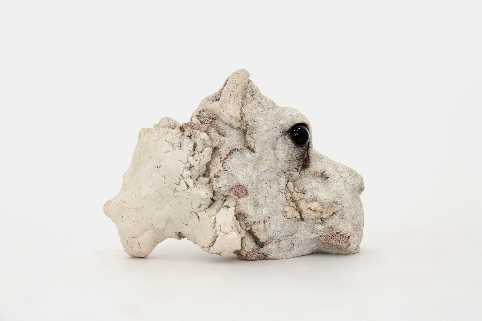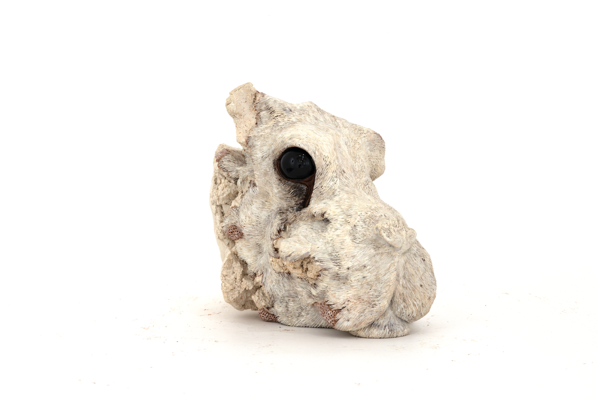 緻密な毛並みに覆われた精巧な作品群は一見すると写実的ですが、自身の記憶のみでかたち作るその造形は見る人に不思議な違和感と余韻を残します。
