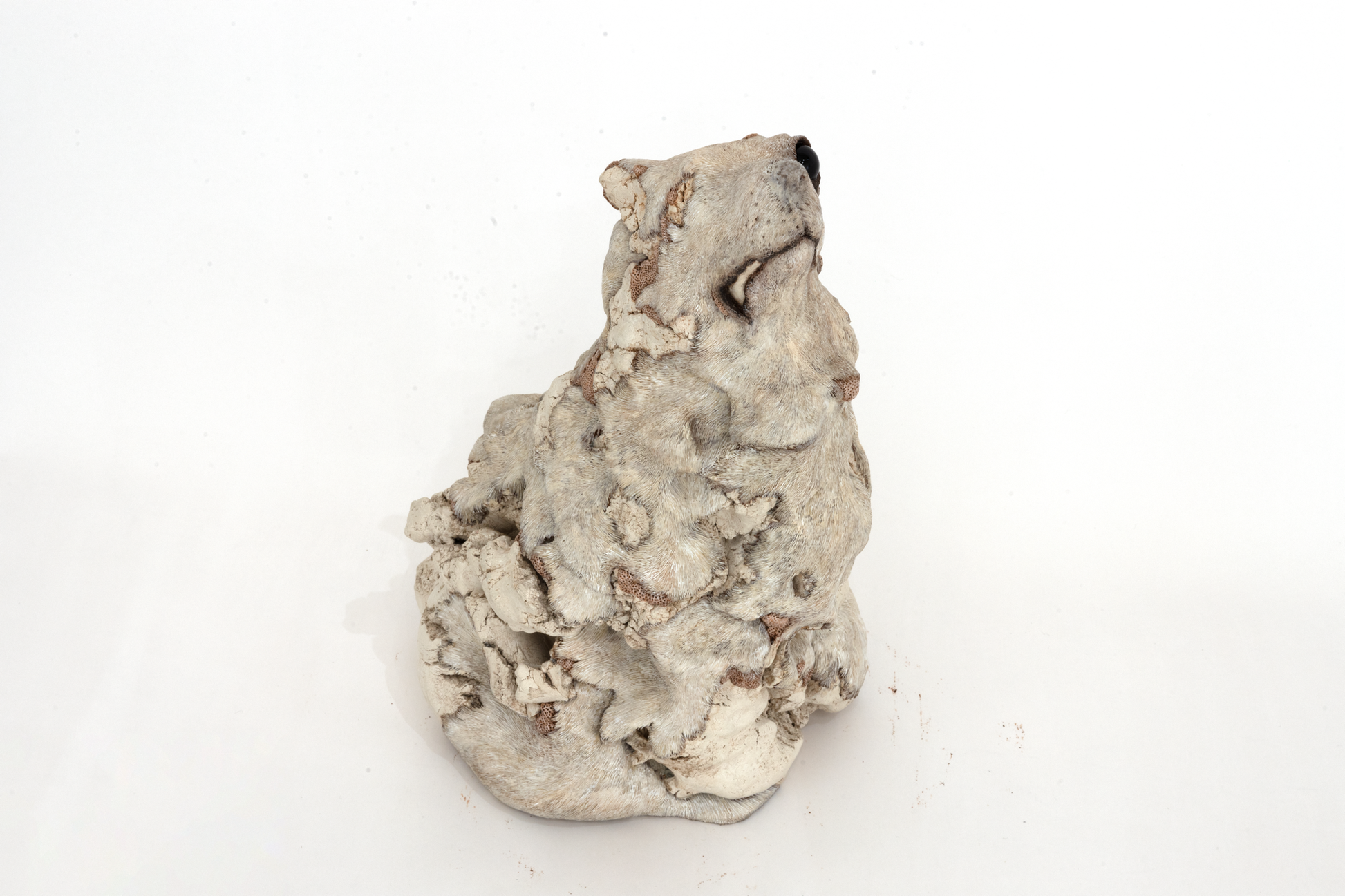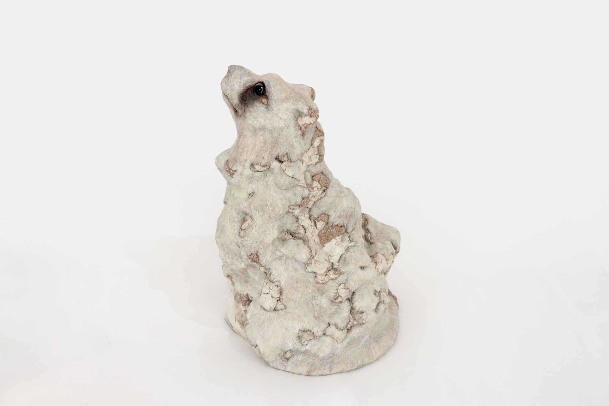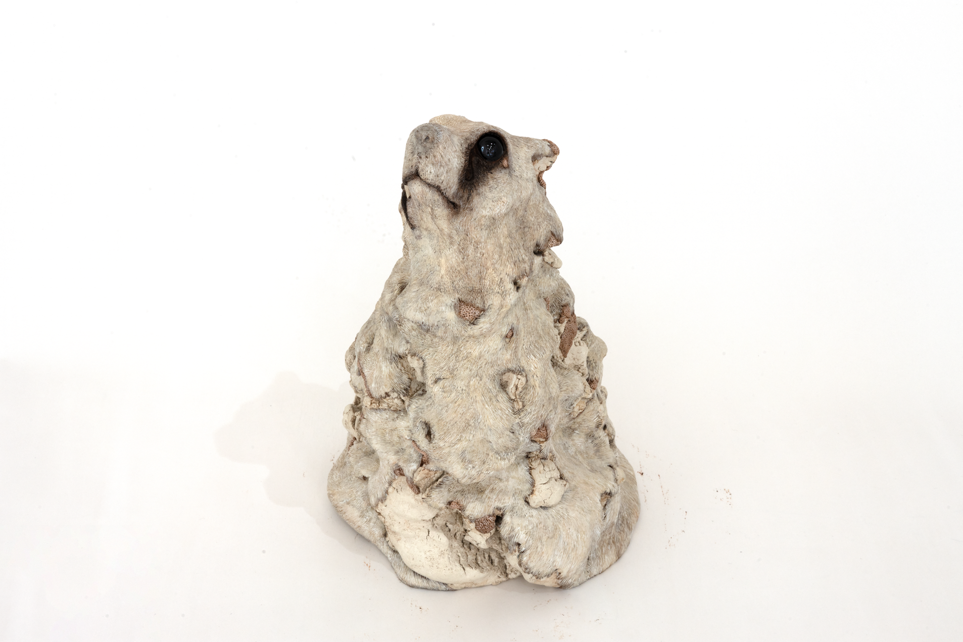 緻密な毛並みに覆われた精巧な作品群は一見すると写実的ですが、自身の記憶のみでかたち作るその造形は見る人に不思議な違和感と余韻を残します。