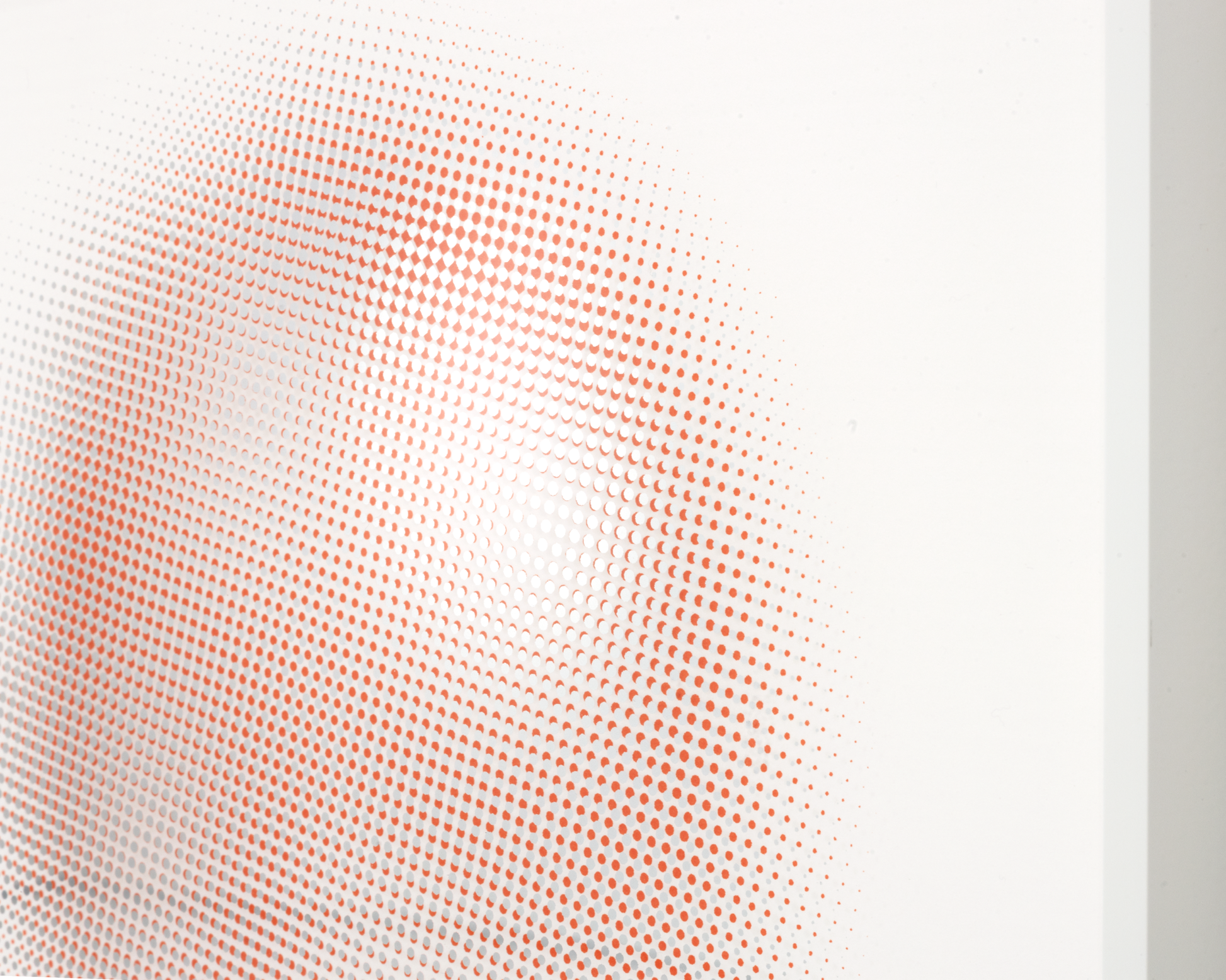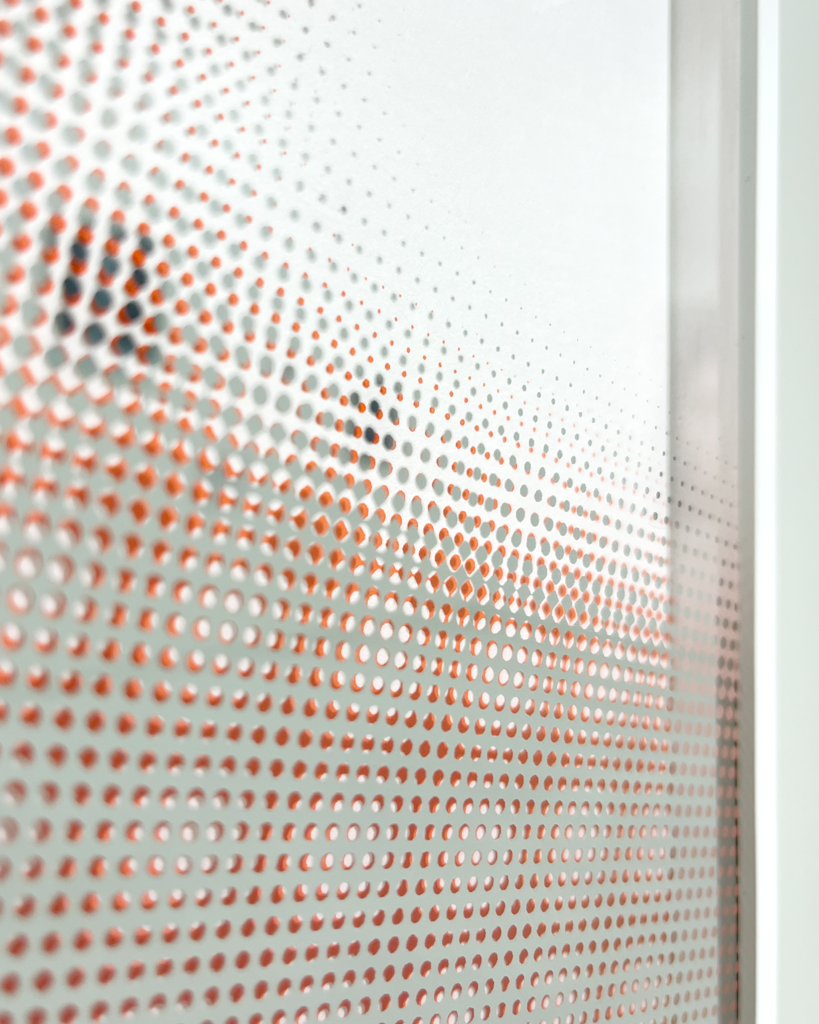 奥の紙にはオレンジ色のインクで、手前の透明ポリカーボネートには同じ像がミラーインクで印刷されています。鑑賞者の立ち位置によって、見え方が変化する作品となっています。