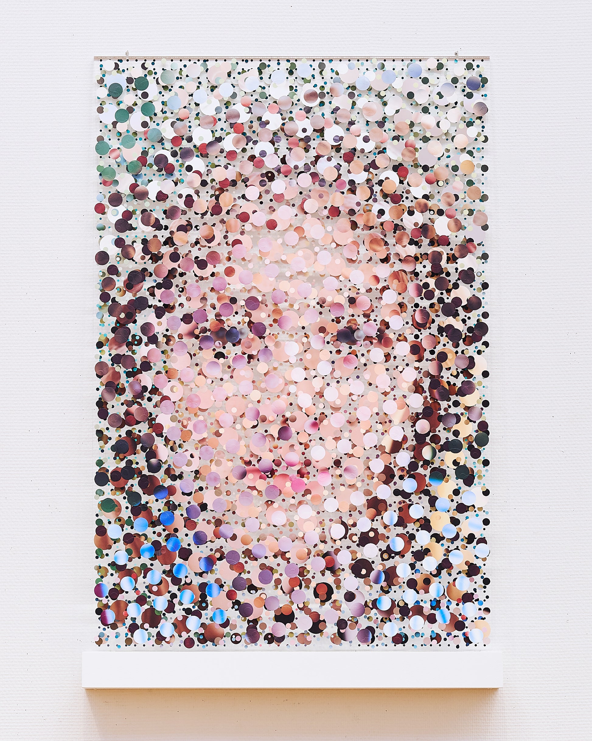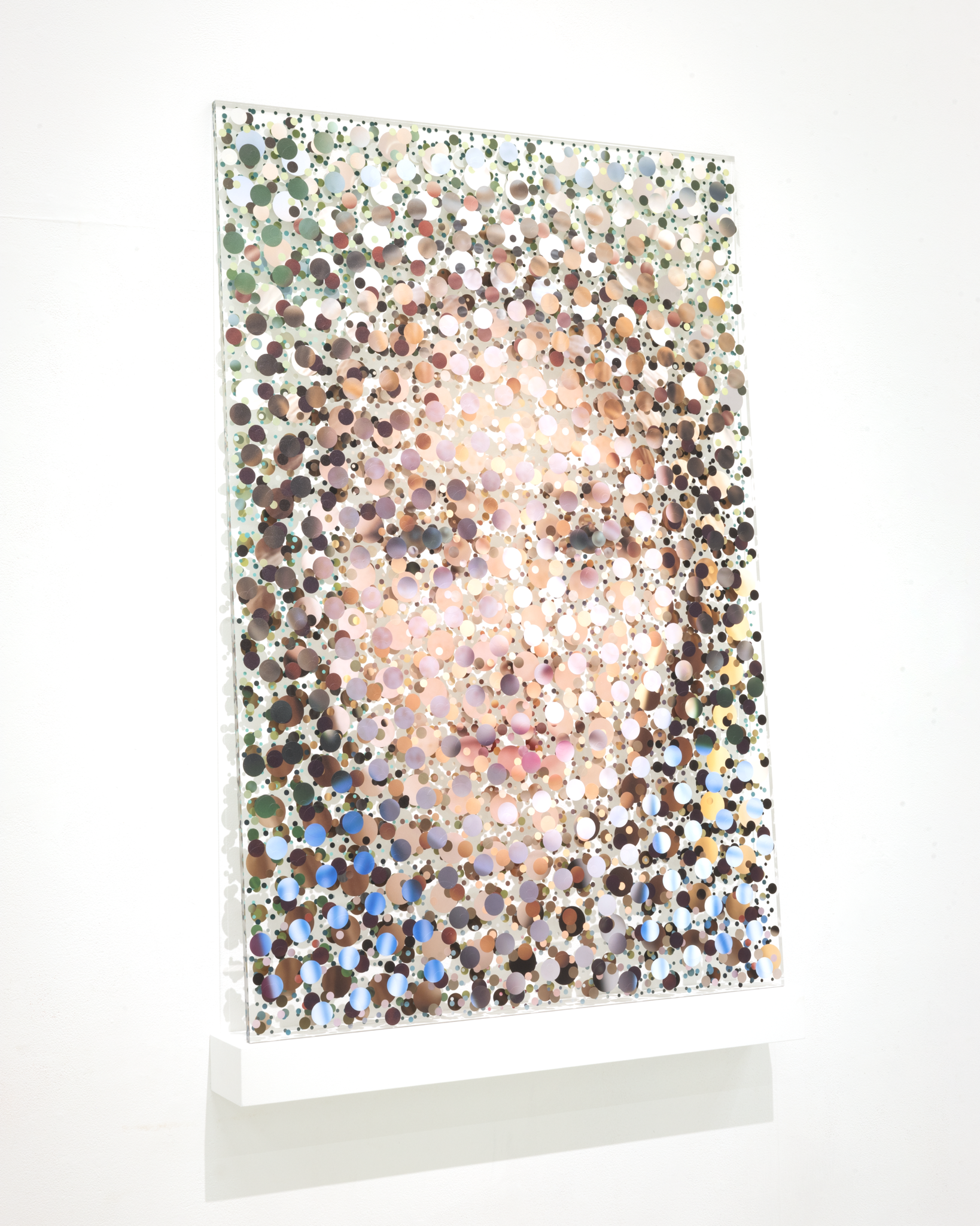「particle」シリーズは、点の集合による印刷技術と、あらゆる存在が粒子でできているという科学的視点から、肖像というモチーフに新たな意味を与えています。複数のパブリックドメインの肖像をドットで切り抜き、透明なアクリル板の表と裏からUVプリントによって刷り重ねられています。ミクロな単位の積層がマクロな像を形づくるその構造は、私たちの世界への眼差しを問い直します。