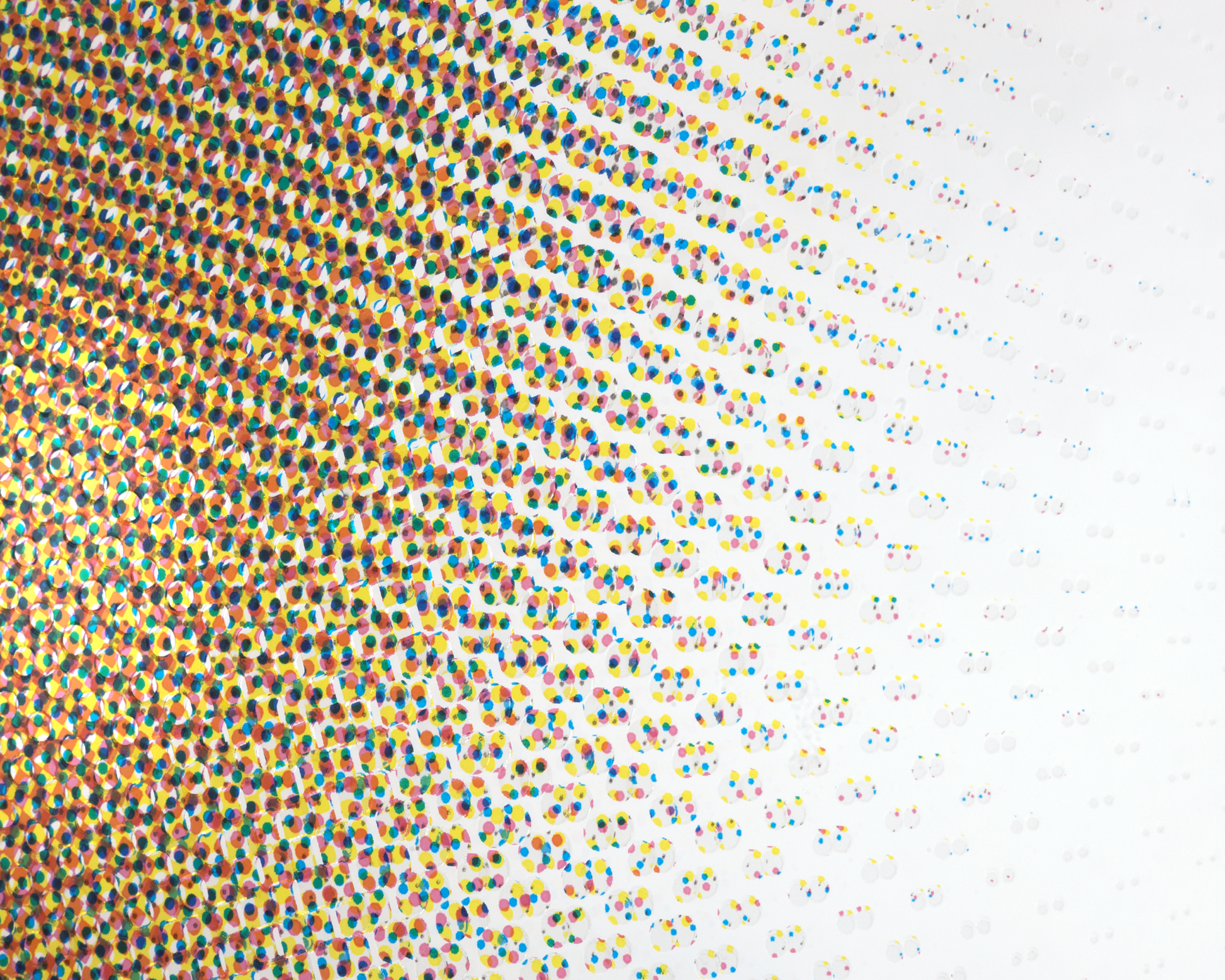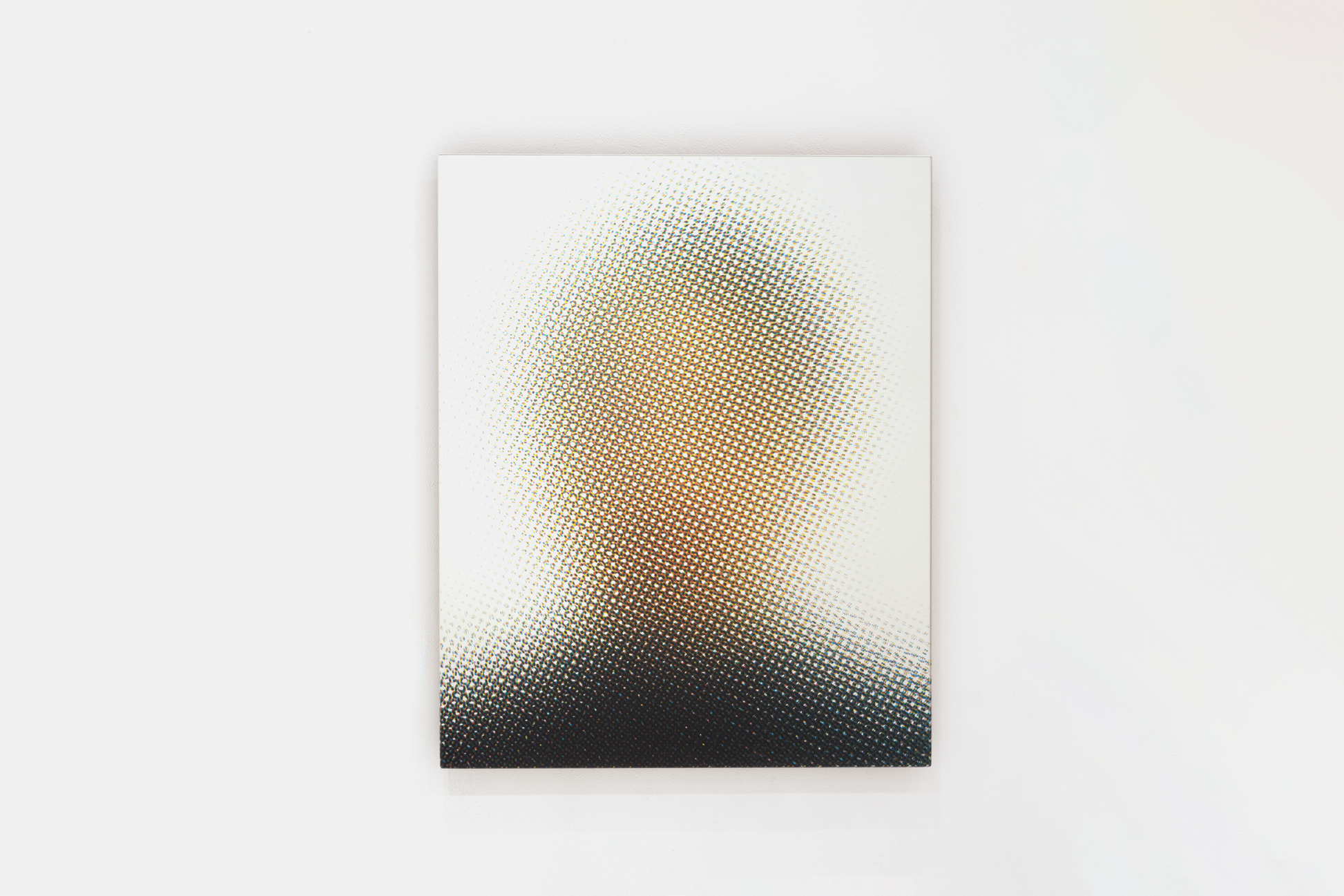 ミラーに作家の肖像を色分解して刷り重ね、透明メディウムの網点を施した後、カラーインクだけを拭き取ることで、網点の重なった部分にだけ色を残しています。