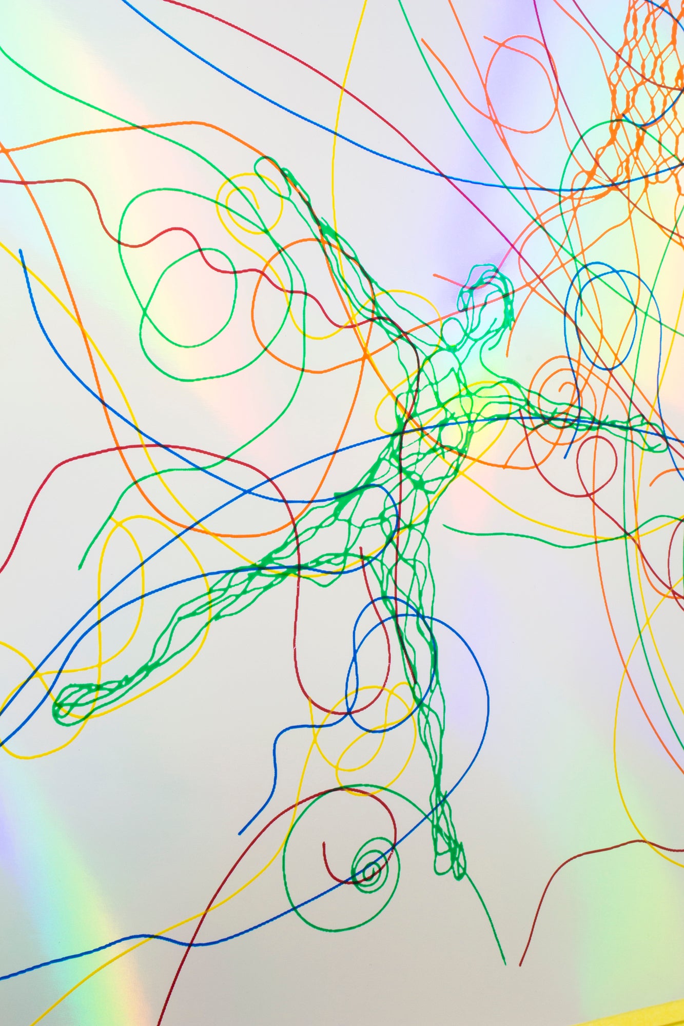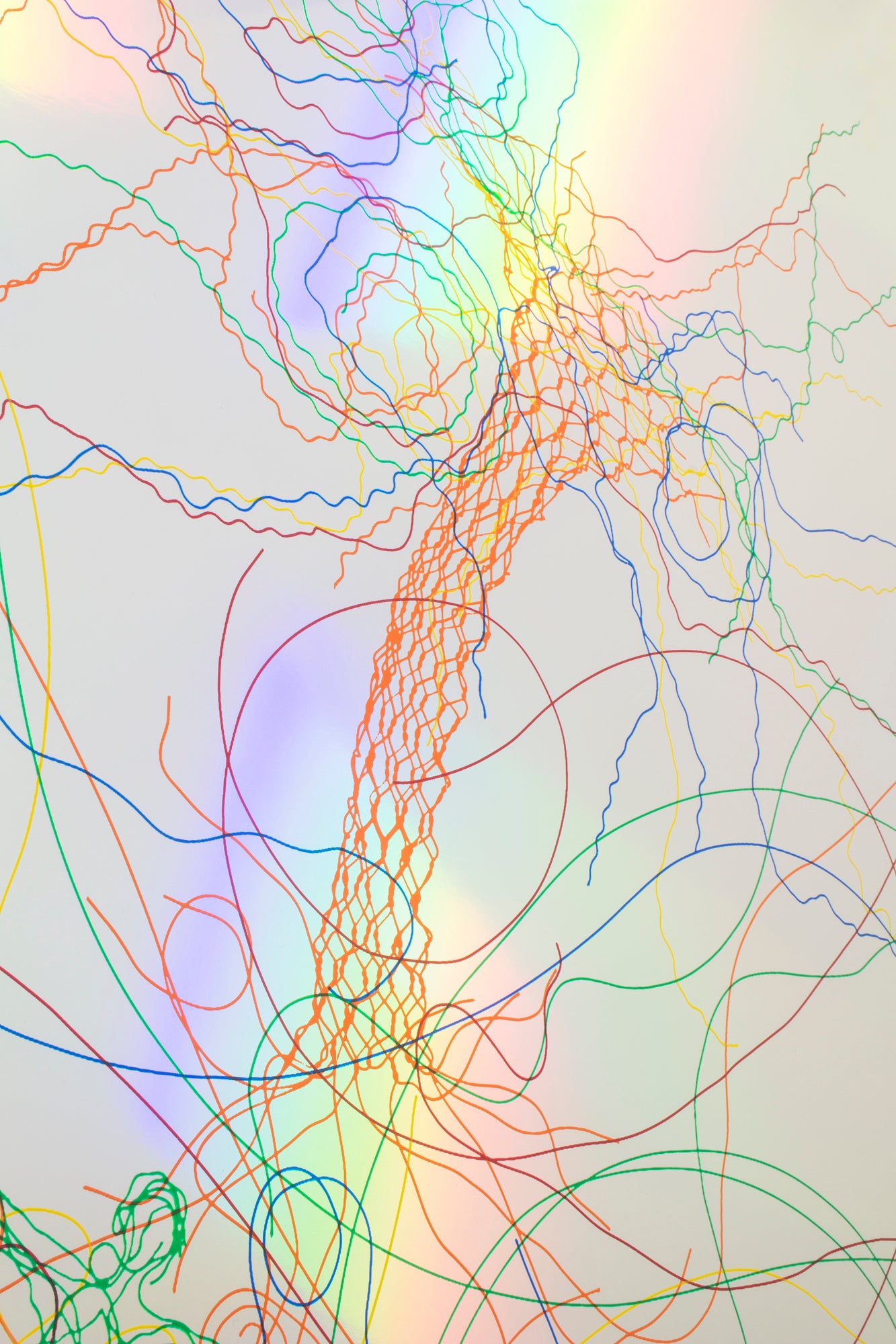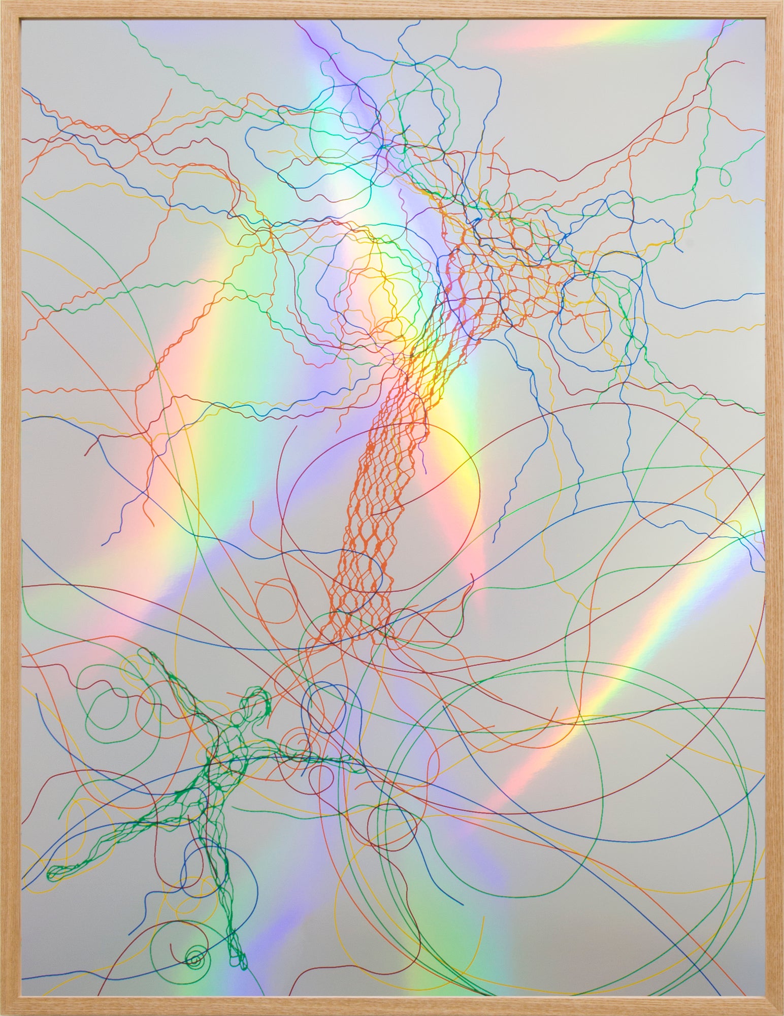 カラーワイヤーを用いて制作した様々な立体をプレスして平面化し透明フィルム上に配置、5色分の版画の原稿を作成。それぞれ異なる色のインクでホログラムシートに刷り重ね、カラフルな色が混じり合い、光に還元される様を表現。見る人が色と光、平面と立体、さらには画面の奥とこちらを行き来するかのような作品に仕上がりました。