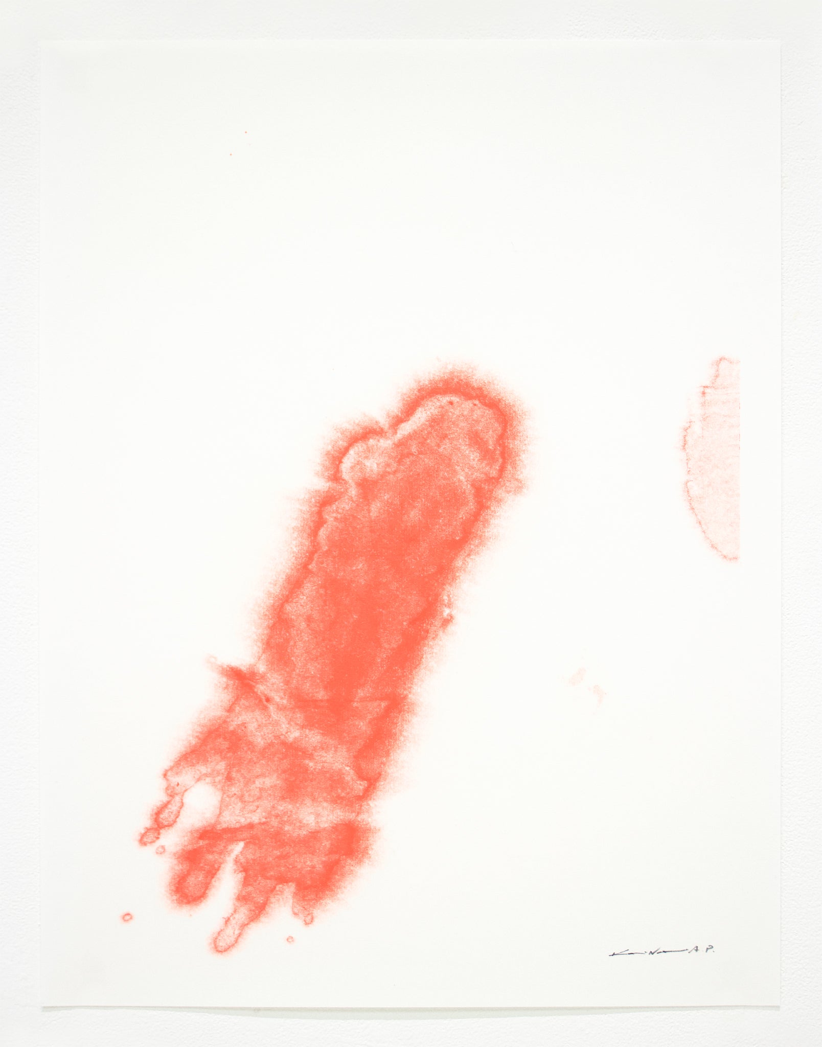 現物のイメージを忠実に再現するのではなく、インクの質感と発色を考え、朱肉に使われる顔料を使用。朱は古来より普遍の顔料として埋葬する遺体を包む布を染める際にも利用され、あの世とこの世の架け橋のような意味もあったようです。版を重ねながら色彩は整理されより深くなっていきます。サイズもすこし大きくなり元となったドローイングとはまた違った魅力を持った作品に仕上がりました。
