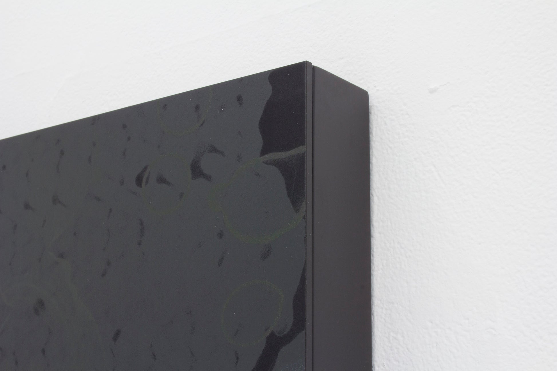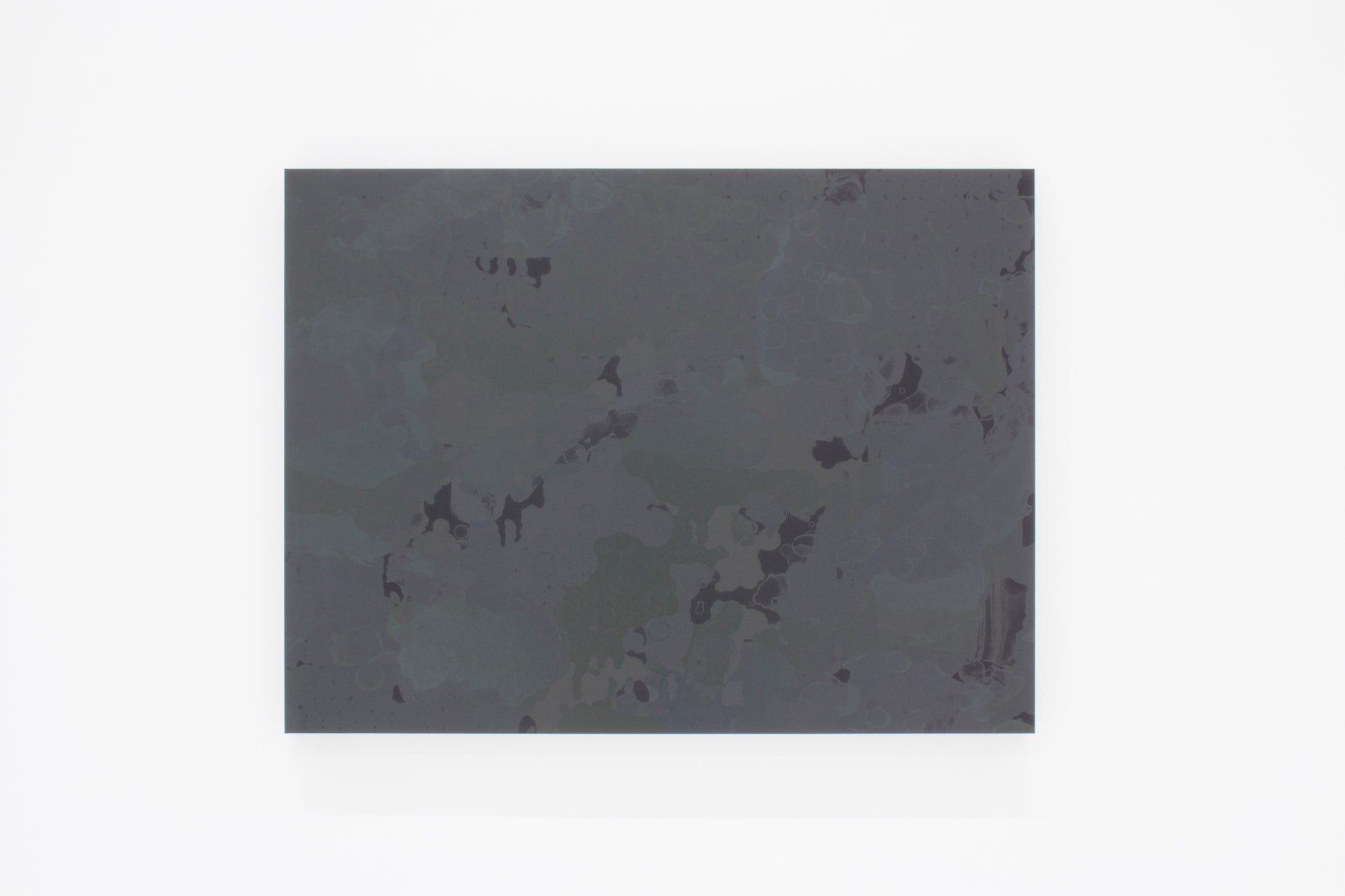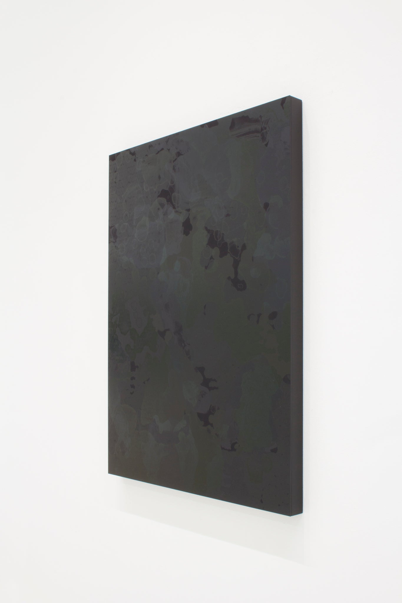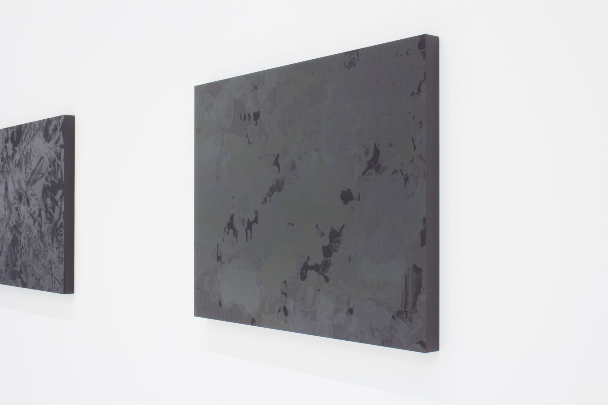 一見すると黒~グレーに見える画面の奥底から、光の反射によって抽象的な像と多様な色が立ち現れる印象的な作品となっています。