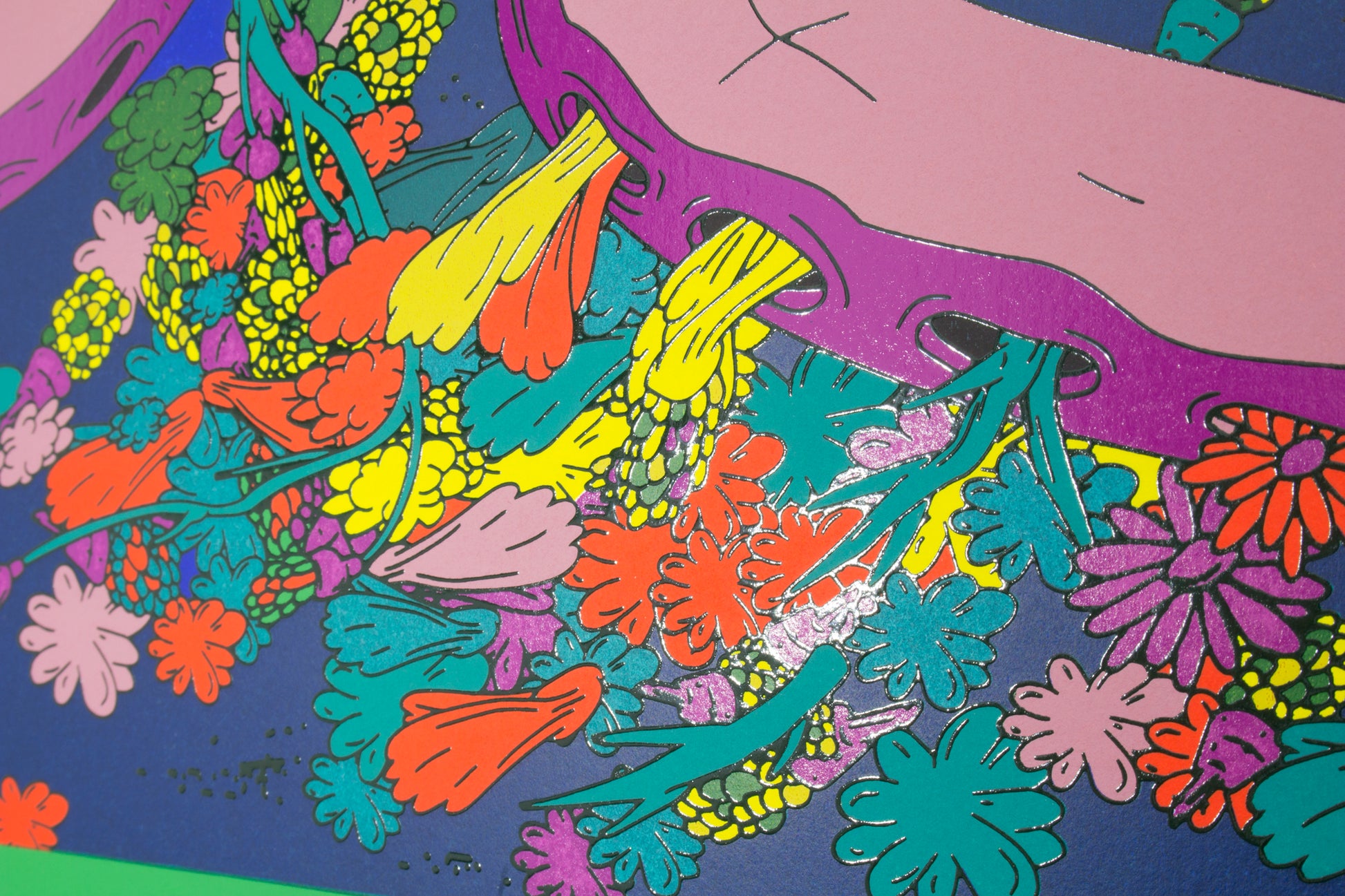 Chang作品の特徴であるヴィヴィッドな色彩を表現するため10版以上を刷り重ねて制作。さらにイメージのフチはインクを盛り上げてプリント。つややかなテクスチャでフラットな世界に視覚的効果を与えることで、イメージをさらに強いものにしています。