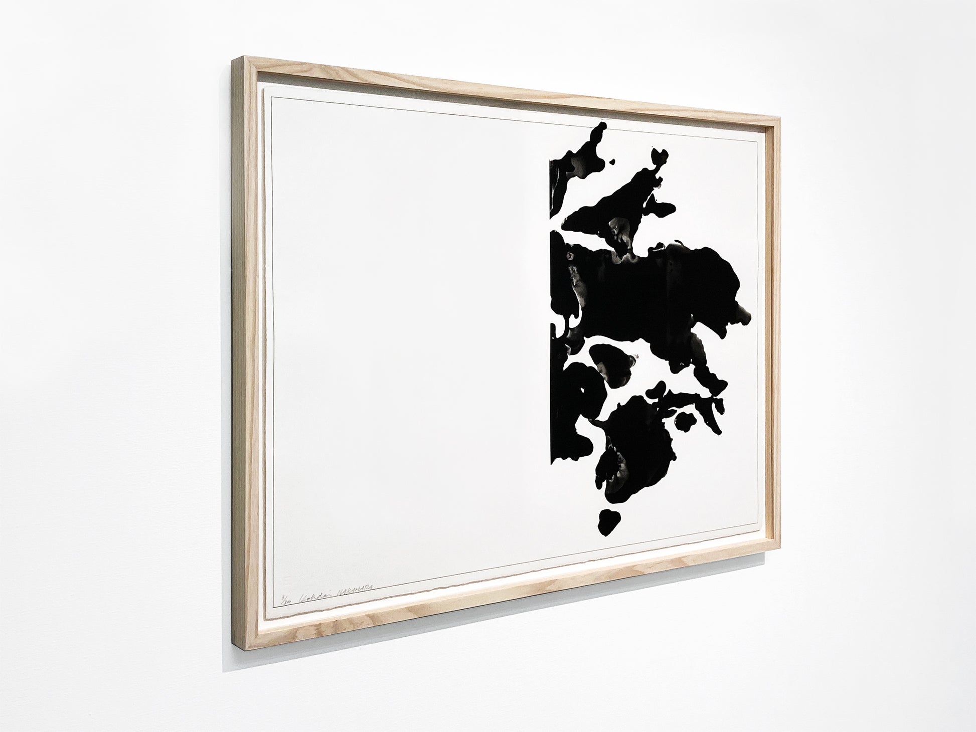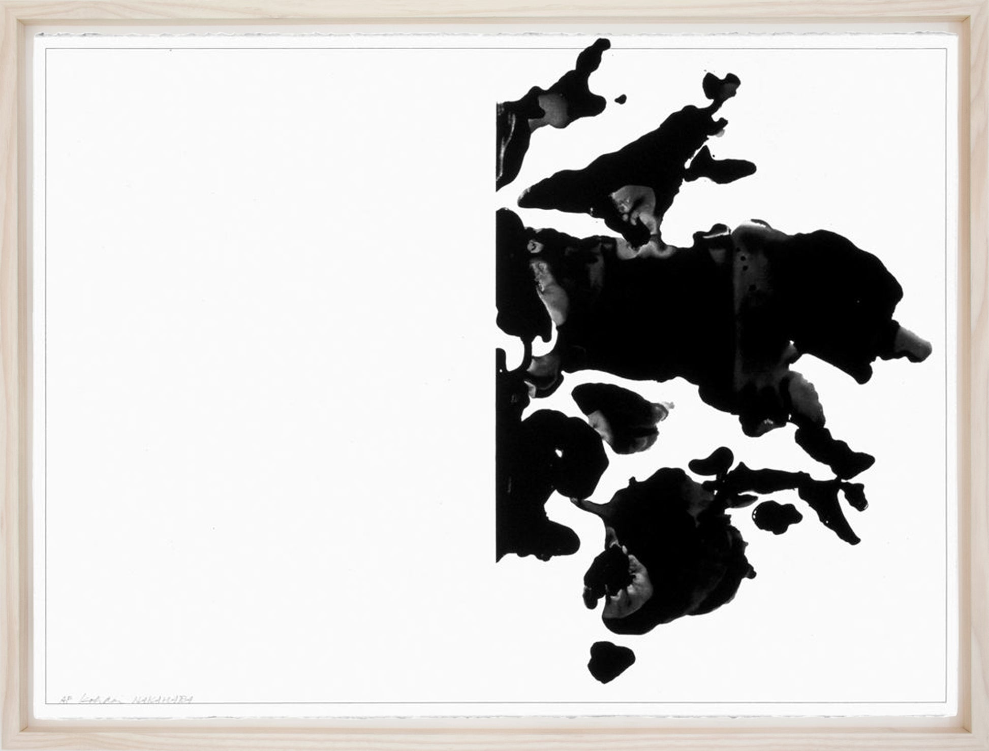 ポリエステル・フィルム上にロールシャッハ・テストの方法でデカルコマニーされたイメージを半分に切断し、その片側だけを画面の半分に墨一色でプリント。シンプルなコンセプトをシンプルな手法でプリントした故の圧倒的な強さが画面から溢れる、印象深い作品です。