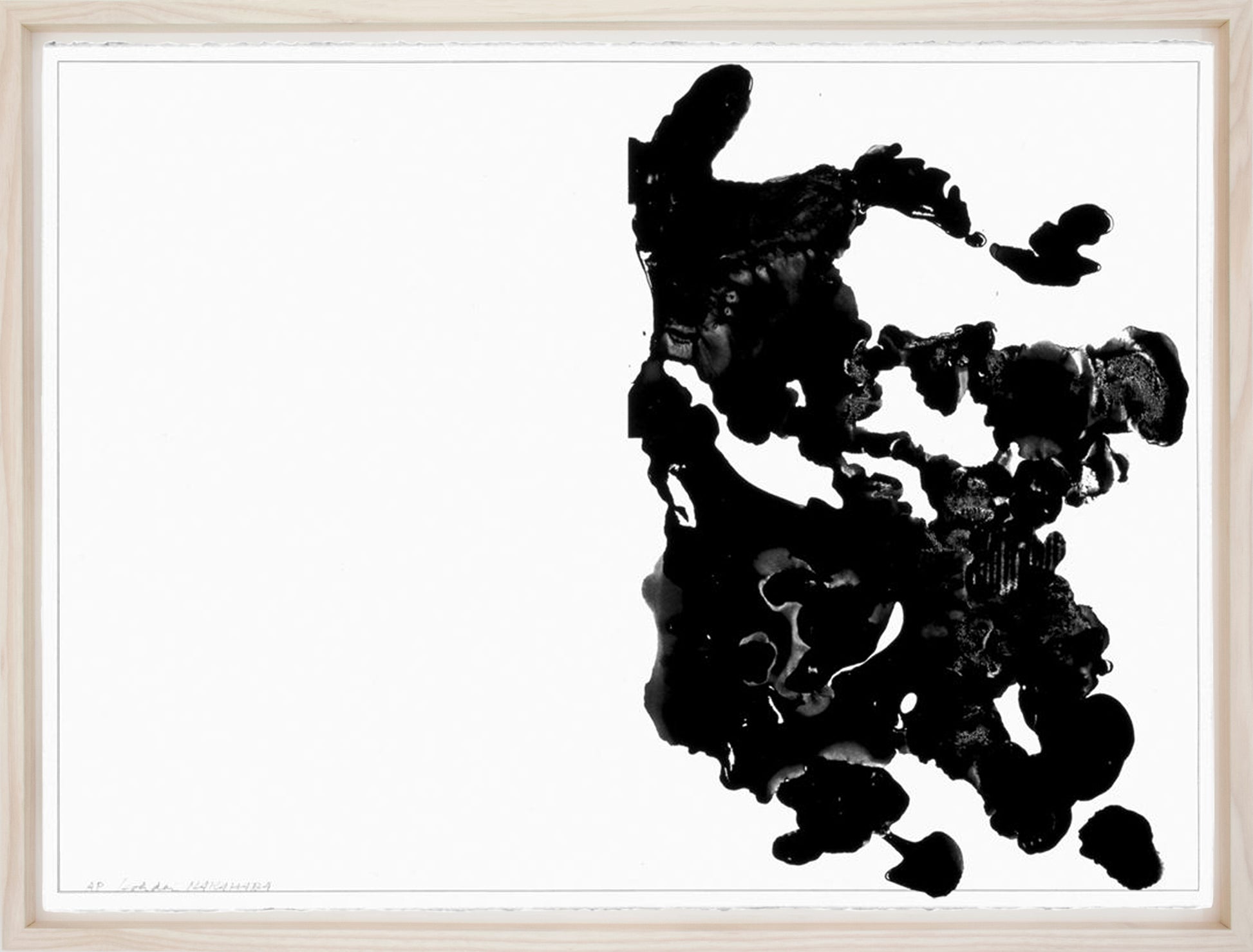 ポリエステル・フィルム上にロールシャッハ・テストの方法でデカルコマニーされたイメージを半分に切断し、その片側だけを画面の半分に墨一色でプリント。シンプルなコンセプトをシンプルな手法でプリントした故の圧倒的な強さが画面から溢れる、印象深い作品です。