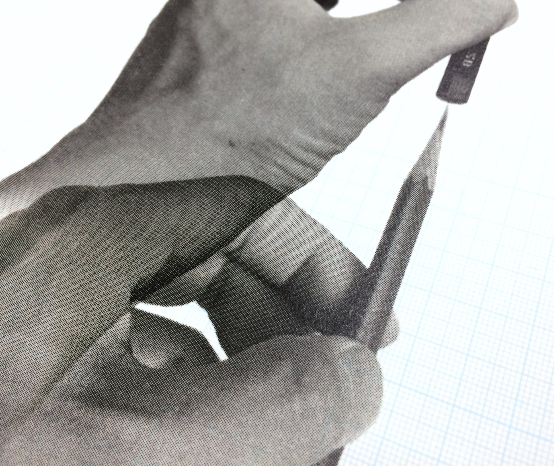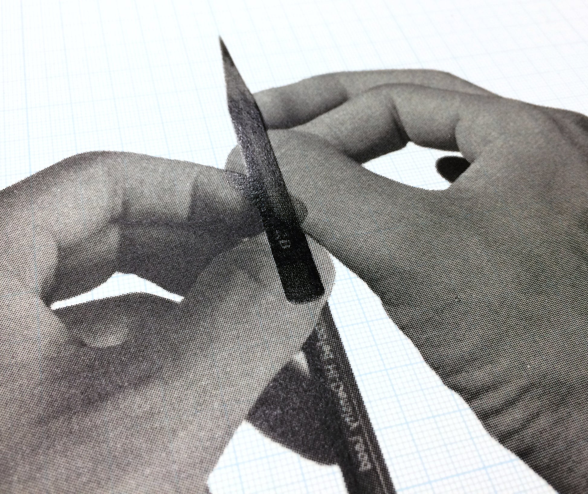 ●鉛筆を持った手は、イメージすなわちイリュージョンとして見なされる時、地となる方眼紙は、淡いブルーの背景として遠ざかりますが、手と鉛筆がインクで出来た皮膜である事を暴露されると、定規としての姿を現します。ここにある方眼紙は、虚と実の狭間に揺れる境界面と言えますが、その境界面上に存在する事を、一種の特権性として許可された存在、それが原寸大という可視的な概念だと思われます。