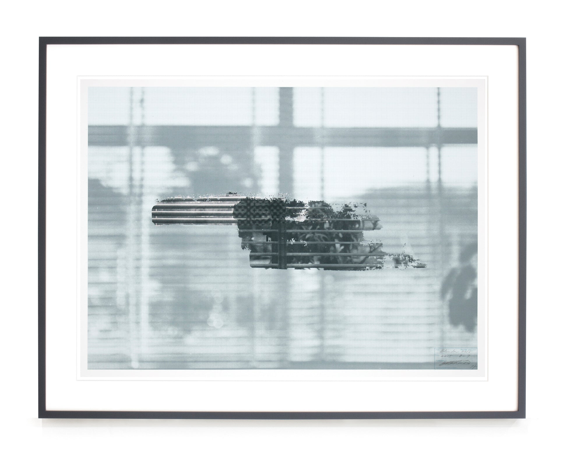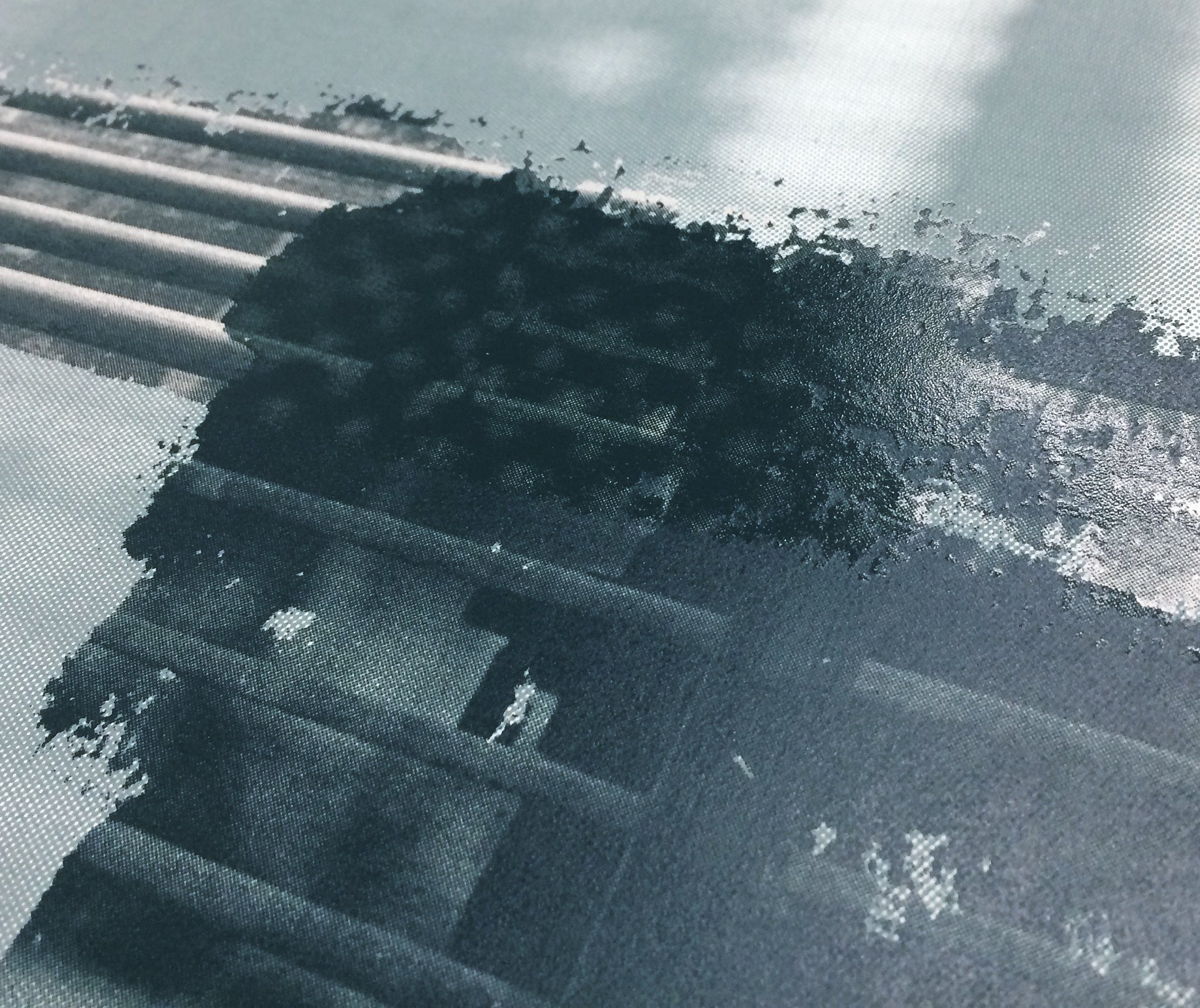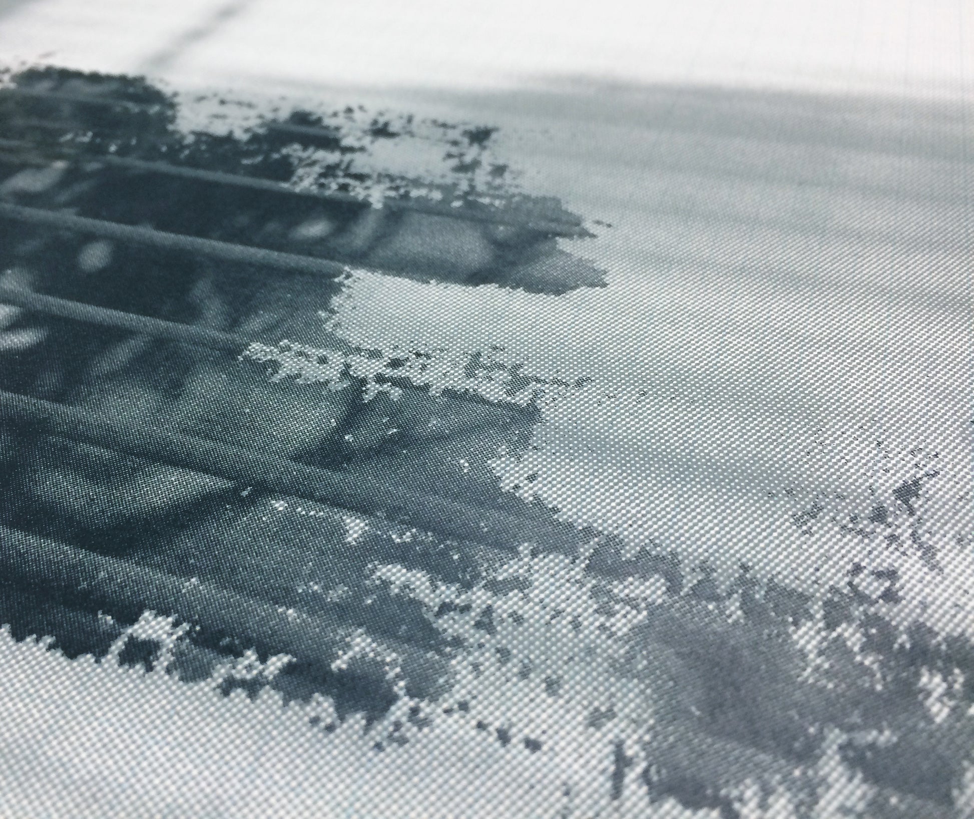 [Blinder 2015]はブラインドの手前にスリガラスが設置されているイメージです。それは半透明性の二重状況のイメージです。2種類の映像、ブラインド面にピントが合った映像とピントがボケた映像をシルクスクリーンを使ってモンタージュしています。2種類の映像の撮影は、不可避的に時差を発生させます。モンタージュという技法は、その時差/差異が無かったかの様に振る舞う事を許しますが、同時に、増幅させる事、即ち、遊びも許可するように思われます。
