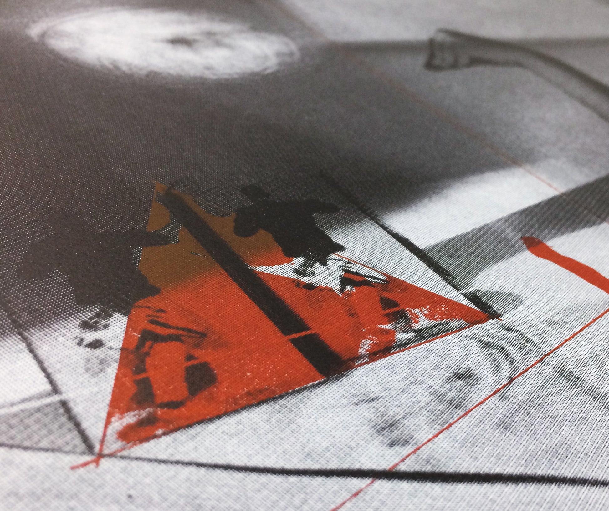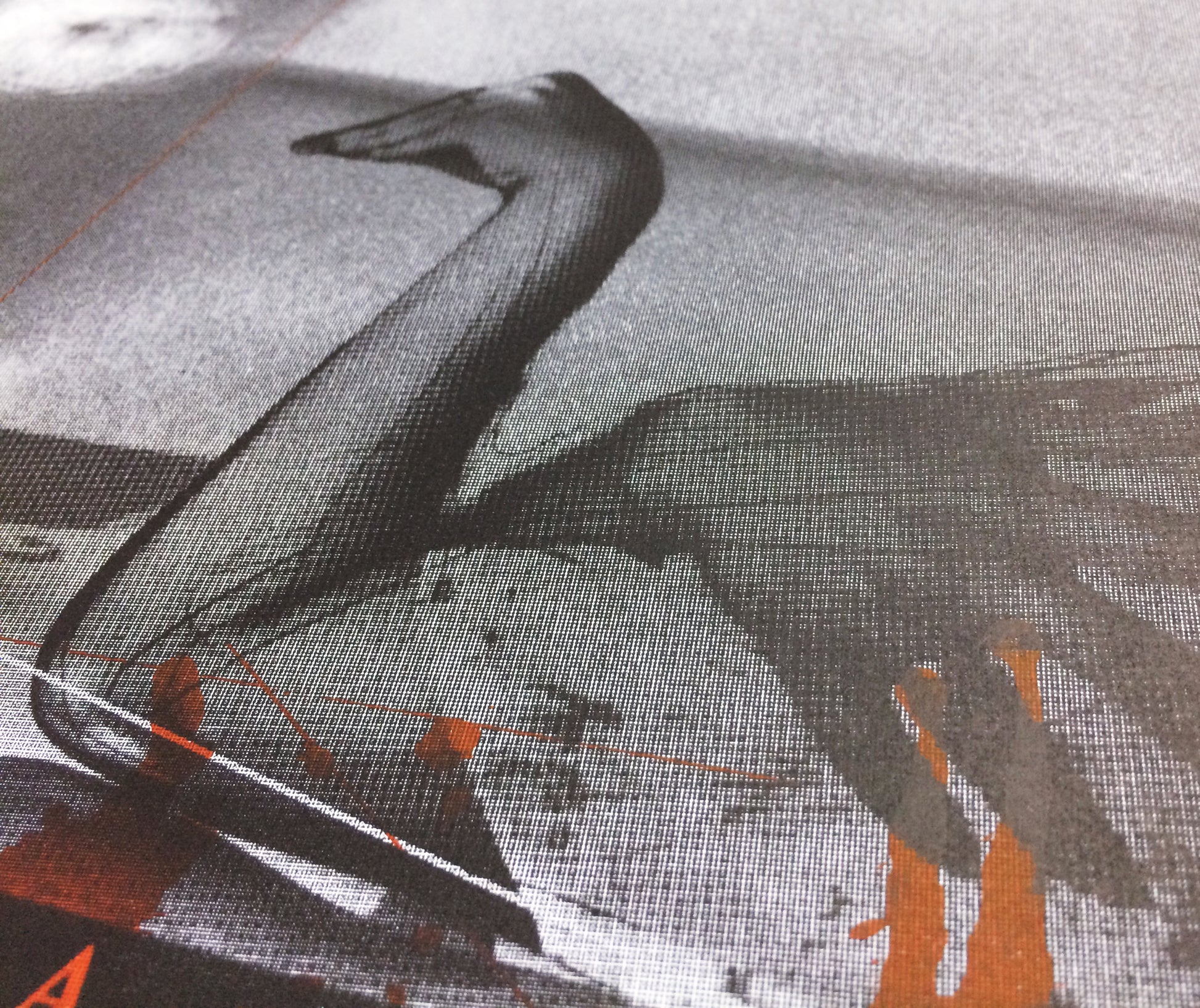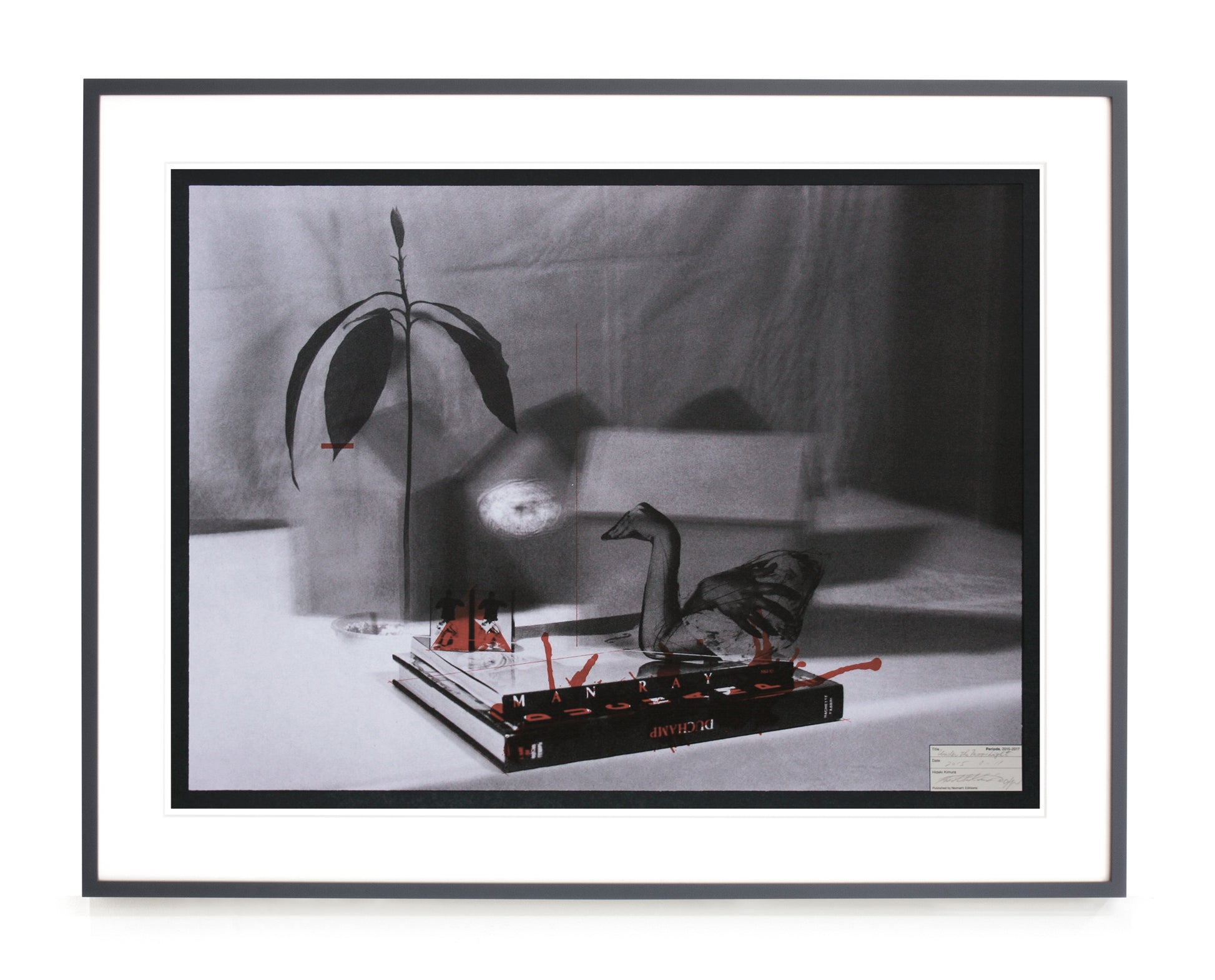 水鳥の形に切り抜いた写真を、本やオブジェと共にテーブルの上に設置し、そのシーンを、標準レンズで撮影し、写真製版のシルクスクリーンで刷っています。左手にある木のイメージは、別の作品のために撮影した映像を流用して、モンタージュ印刷しています。