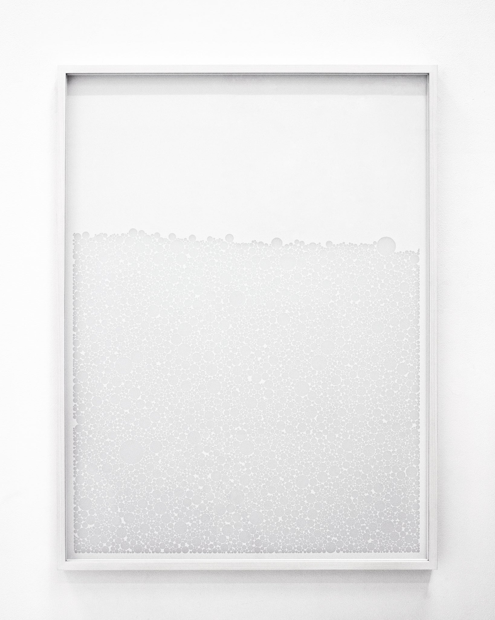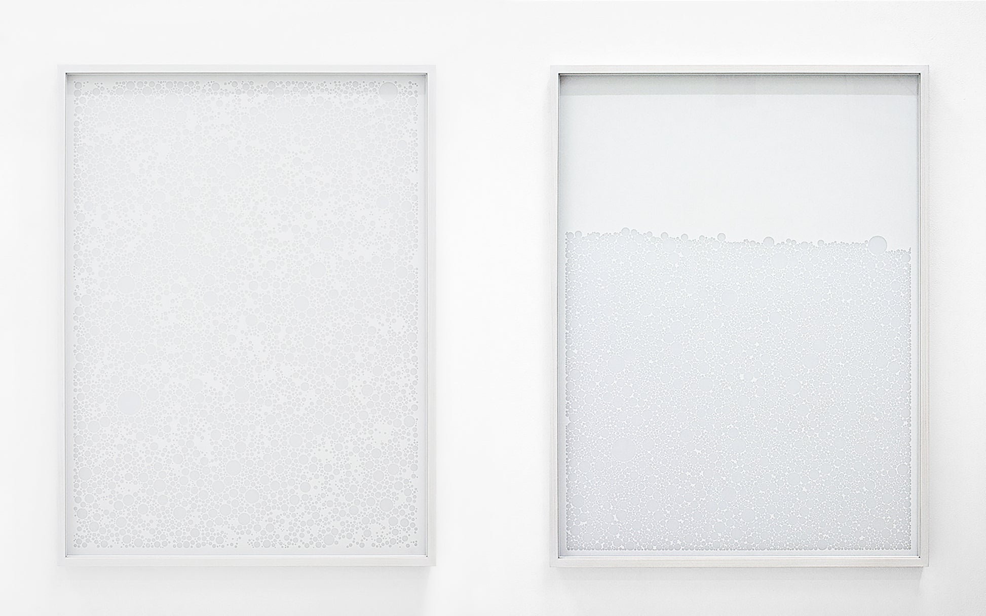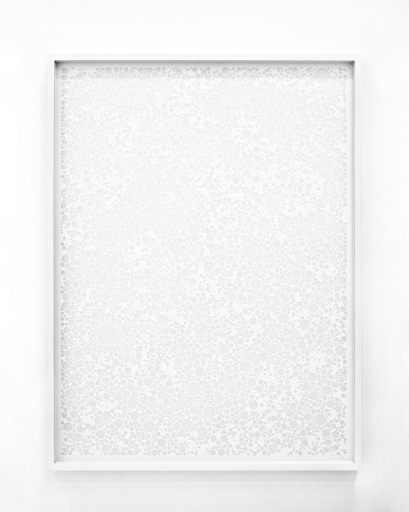 半透明のユポという特殊紙にシルクスクリーンで刷られた版画/マルティプル。数種の大きさの円形の集合であるが、円の部分は半透明な用紙のままで、その周りは白くプリントされていている。全体がベースからクリアランスが設けられ、円はそこに微かな影を落とし、全体が白一色で構成された画面に奥行きをもたらしている。 これは名和がテーマとしているCell(細胞)の状態を表している。2点組で一つは均等に分布、一つは重力によって下方に集まった形で分布。これはCellと周りの空間の非常にデリケートなバランスに動きをもたらす。この2つの状態のCellの数は厳密に合わせられていて、それが対であることが理解できる。Cellの数によって4000/6000/8000の3種の作品が作られた。丁寧に作られた低反射アクリル仕様の木製額に収められ、細部まで緊張感を持った作品です。