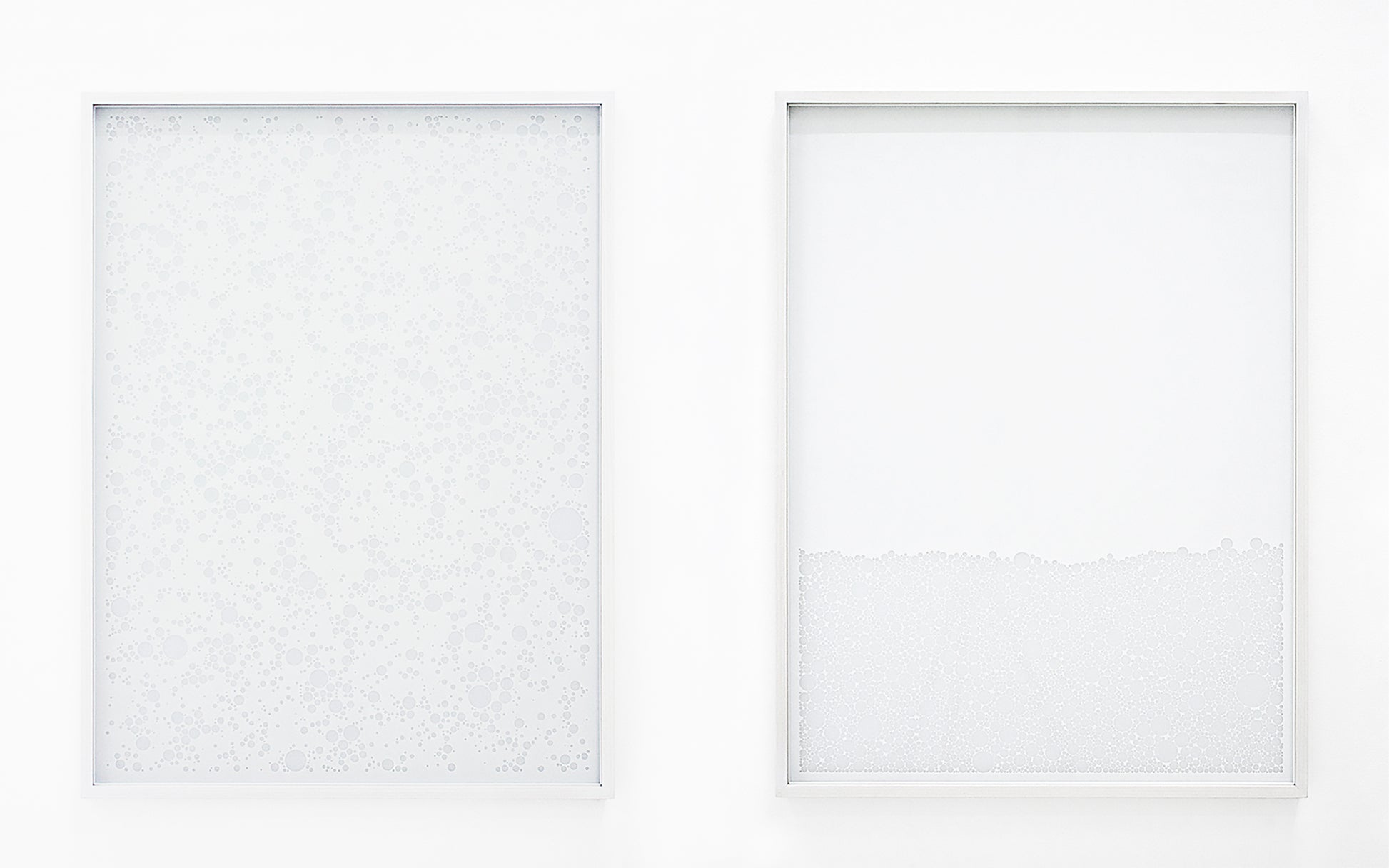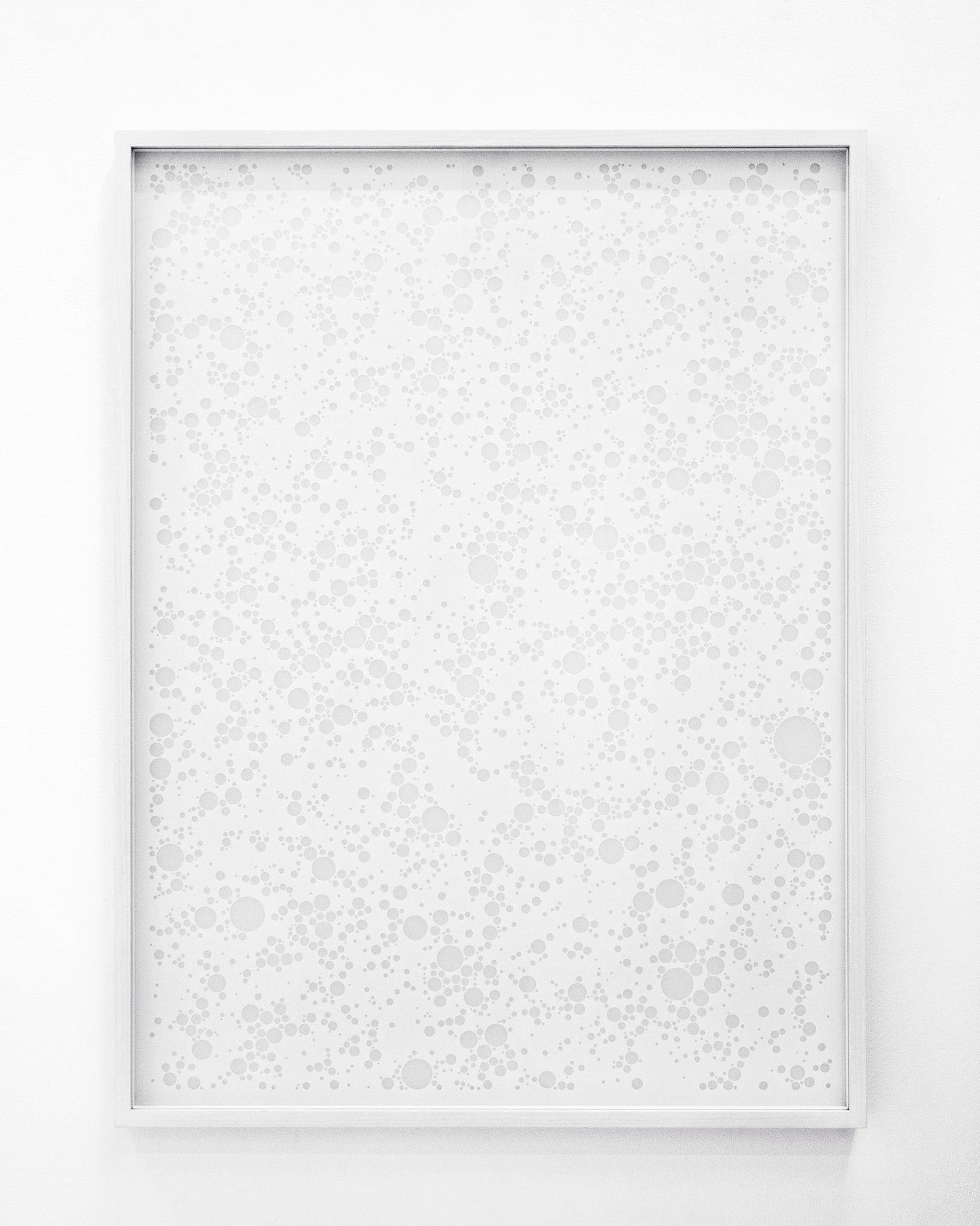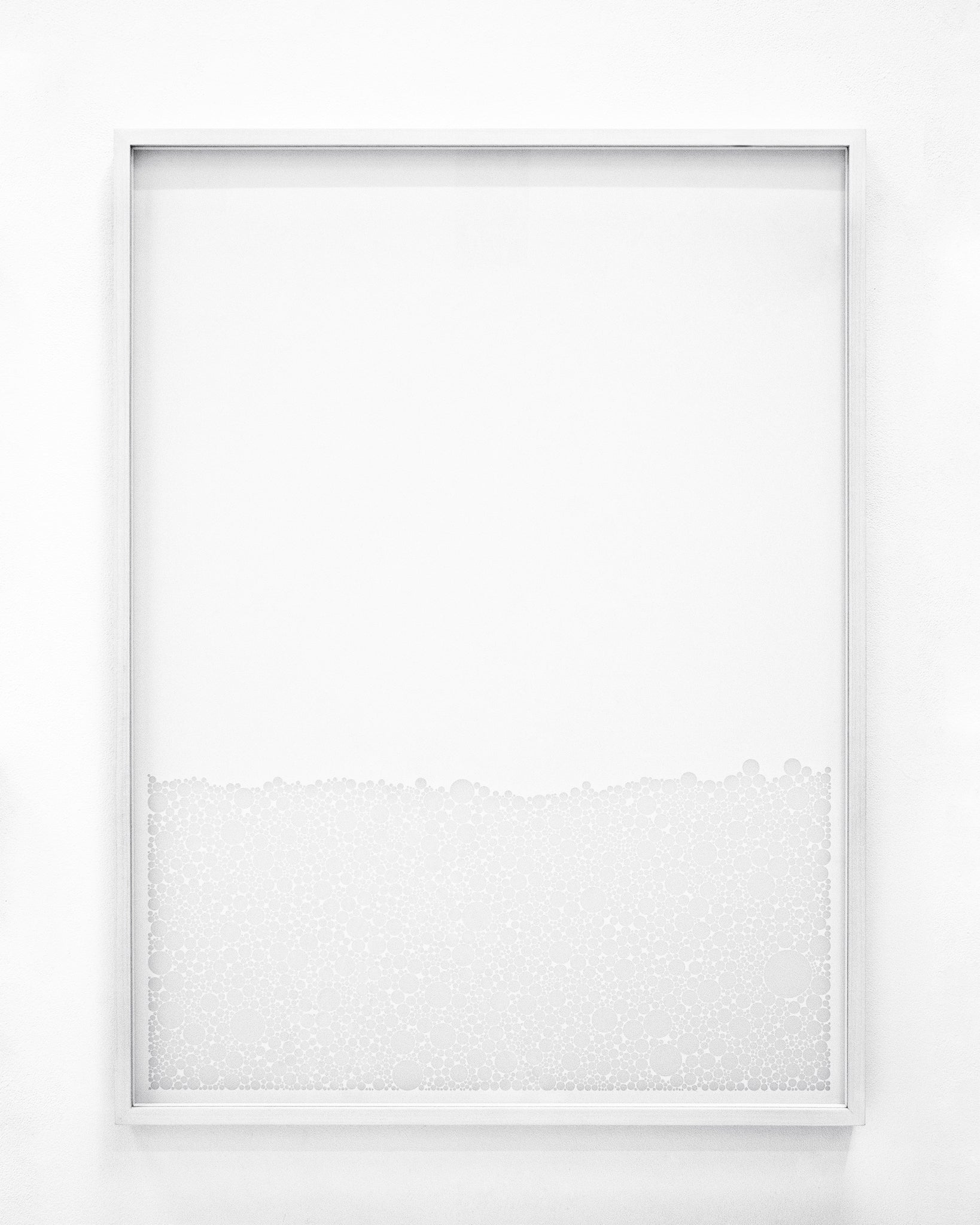 半透明のユポという特殊紙にシルクスクリーンで刷られた版画/マルティプル。数種の大きさの円形の集合であるが、円の部分は半透明な用紙のままで、その周りは白くプリントされていている。全体がベースからクリアランスが設けられ、円はそこに微かな影を落とし、全体が白一色で構成された画面に奥行きをもたらしている。 これは名和がテーマとしているCell(細胞)の状態を表している。2点組で一つは均等に分布、一つは重力によって下方に集まった形で分布。これはCellと周りの空間の非常にデリケートなバランスに動きをもたらす。この2つの状態のCellの数は厳密に合わせられていて、それが対であることが理解できる。Cellの数によって4000/6000/8000の3種の作品が作られた。丁寧に作られた低反射アクリル仕様の木製額に収められ、細部まで緊張感を持った作品です。