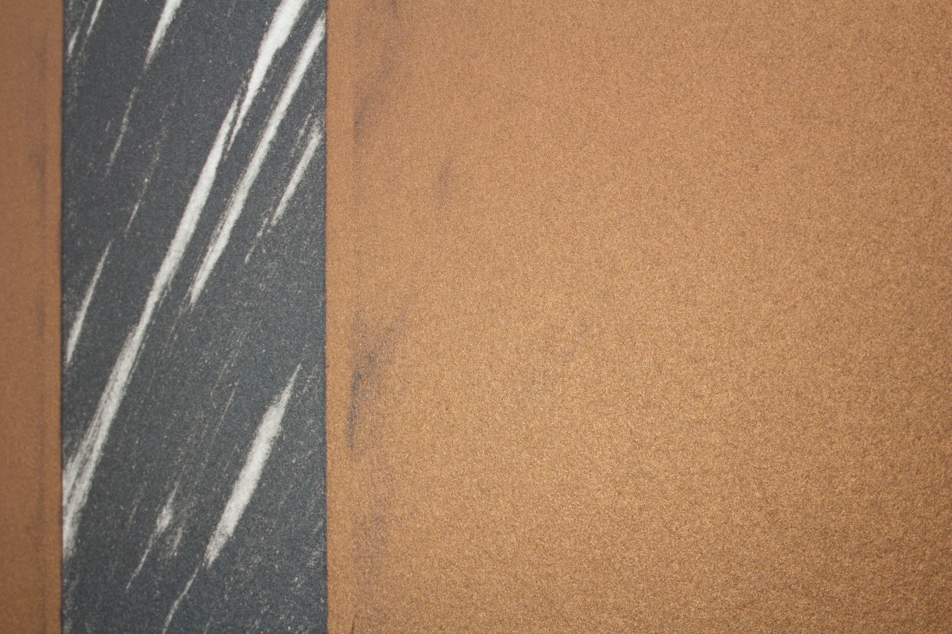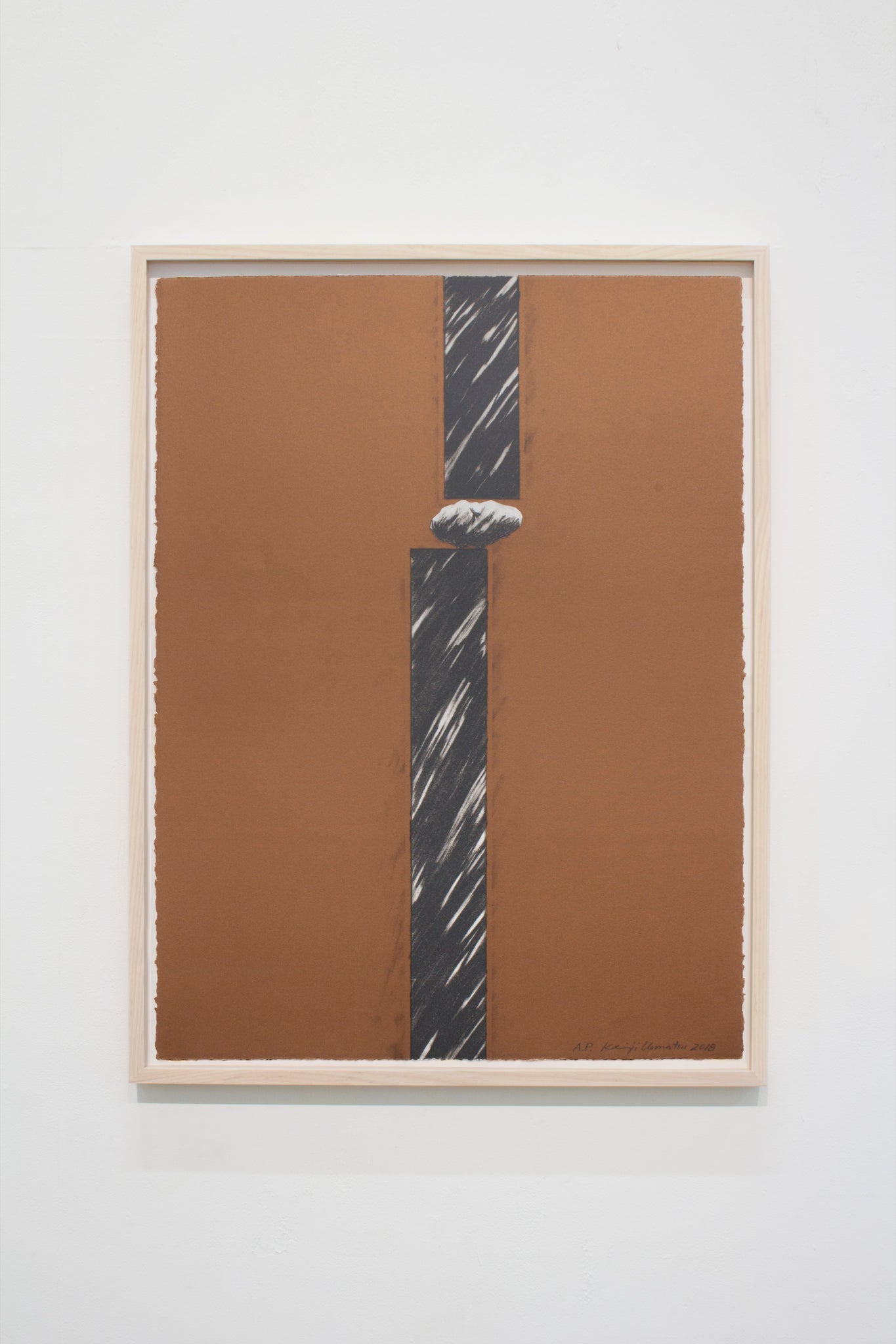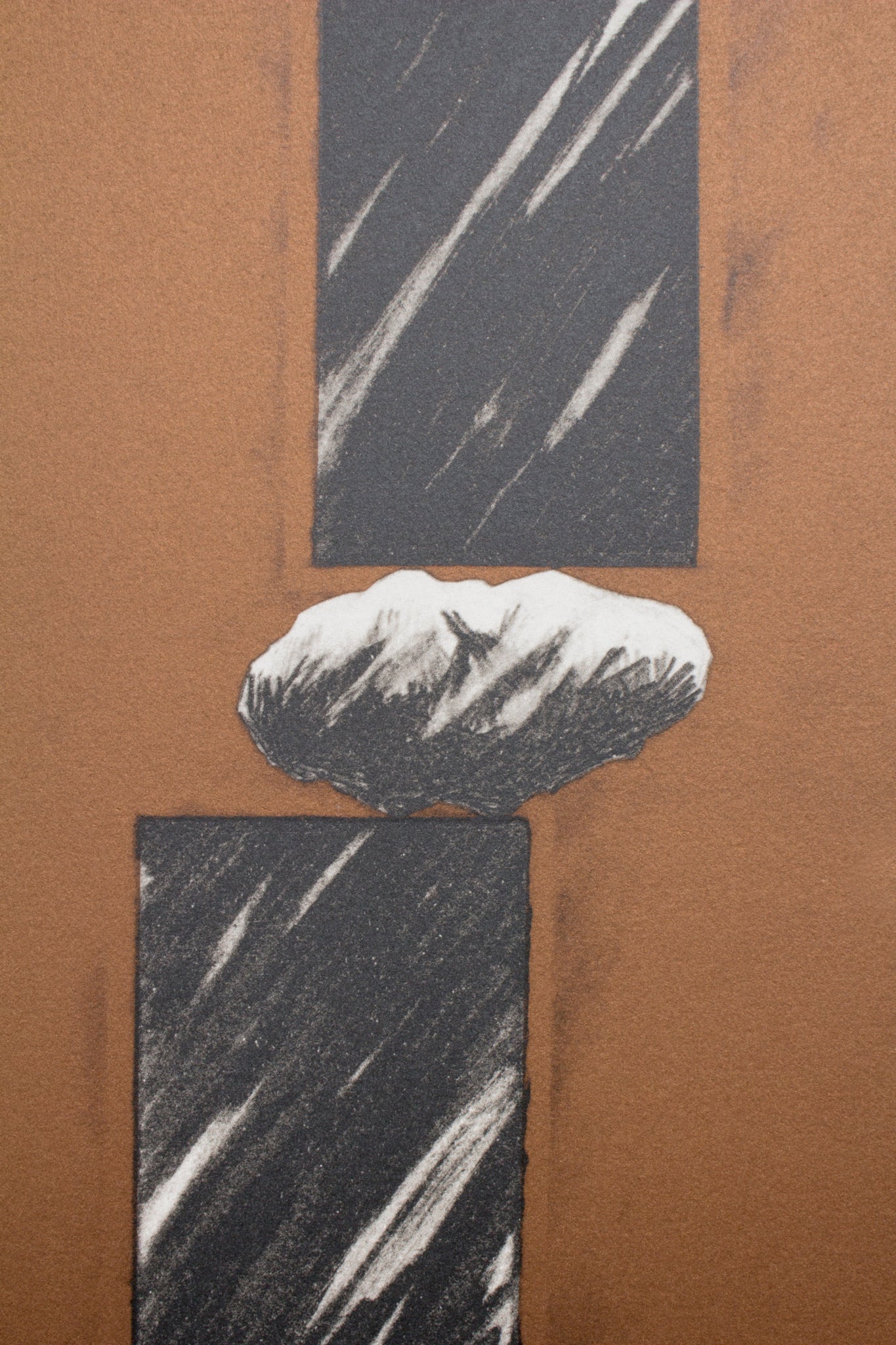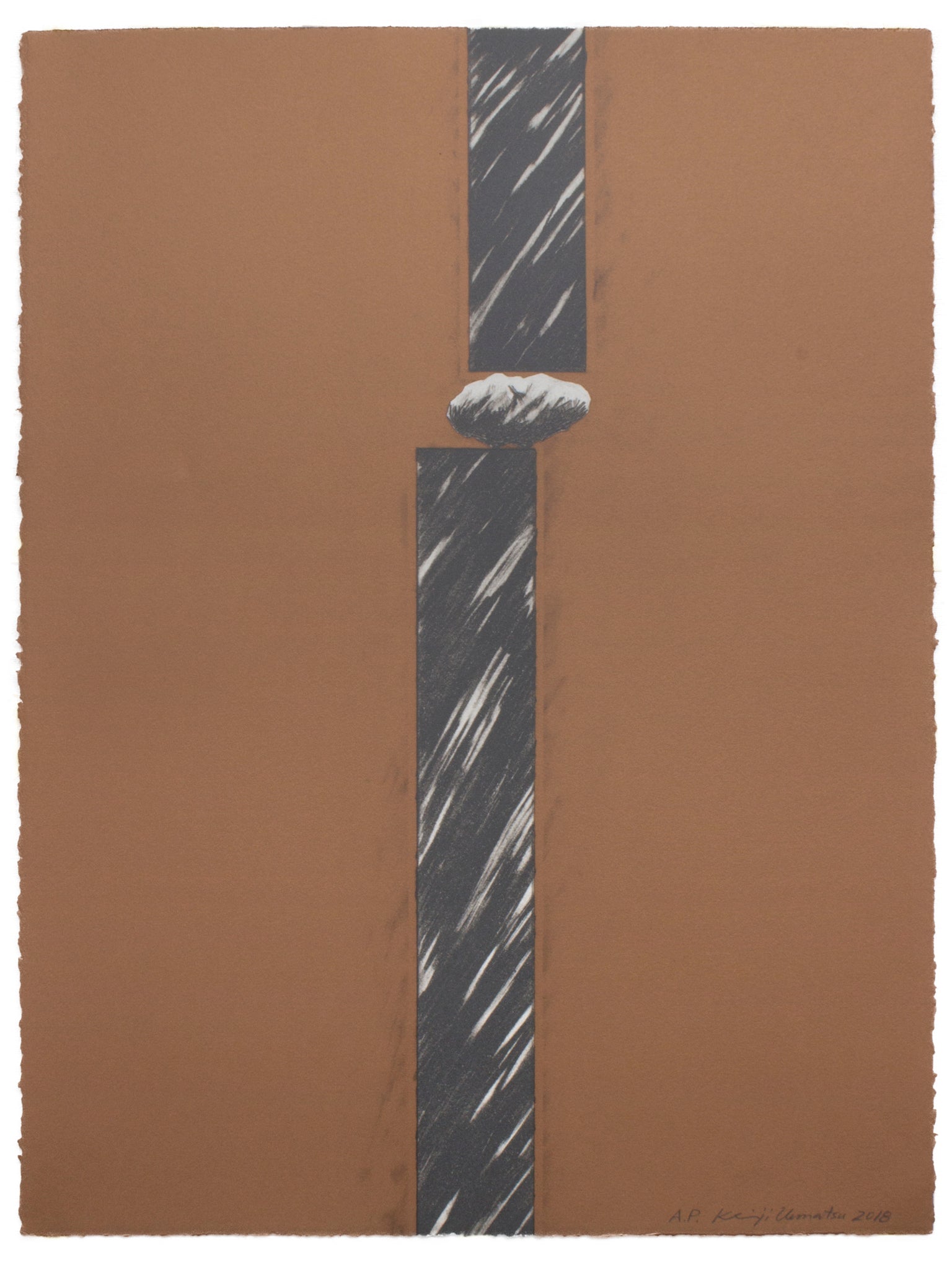 石と黒い棒状のものが空間に危ういバランスを保ってる様を鉛筆で描いたプランドローイングが元になっていますが、ドローイングの複製ではなく、耳付きの版画紙面を一つの空間に見立てた、インスタレーションとしての版画を意図し、完成に至りました。