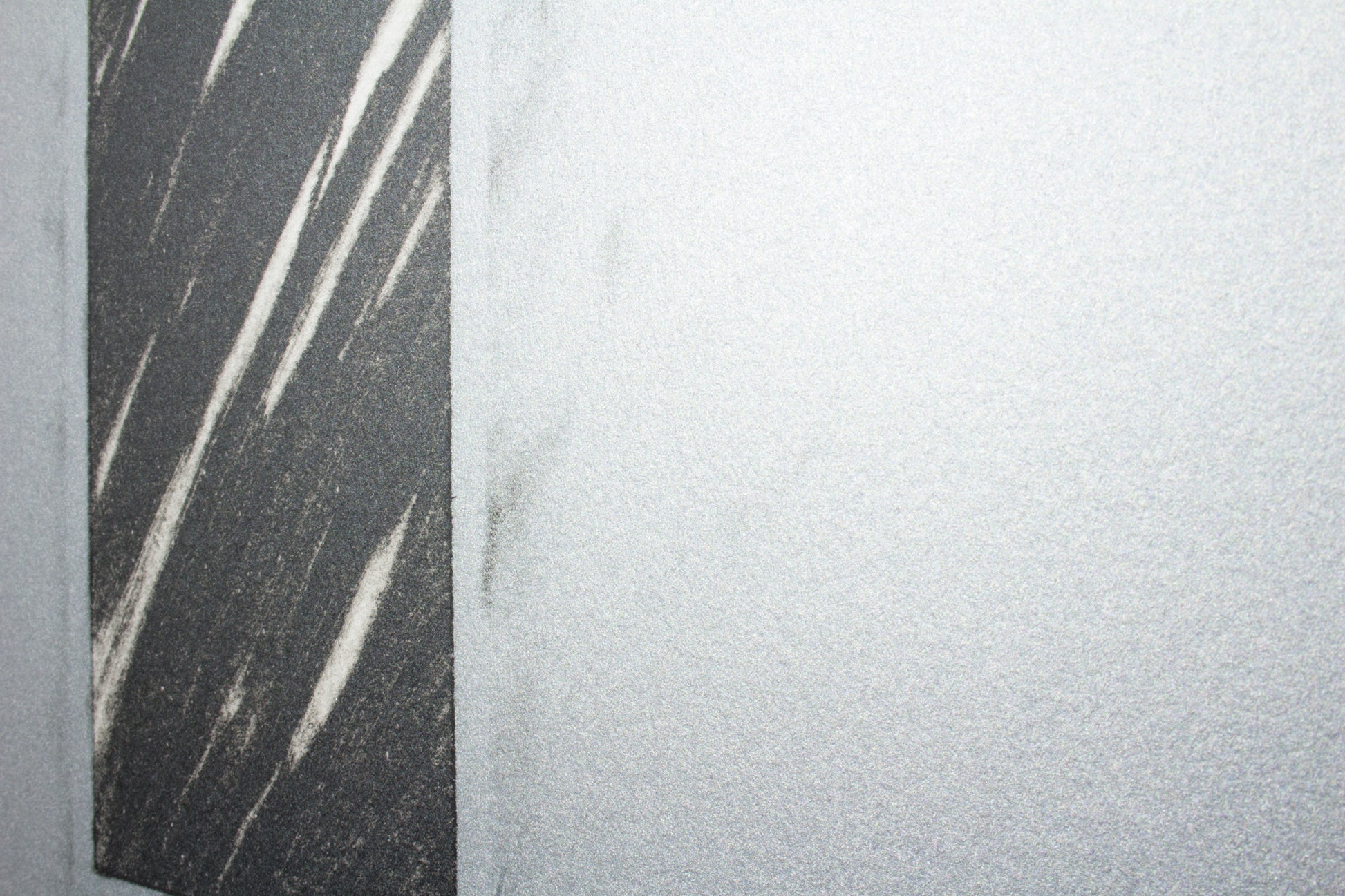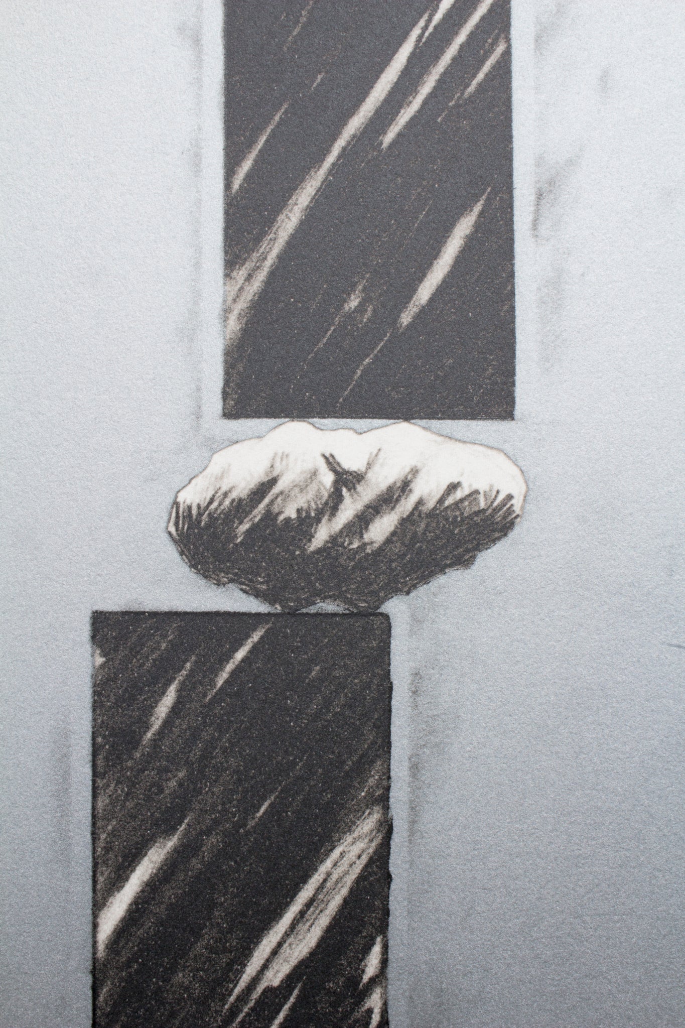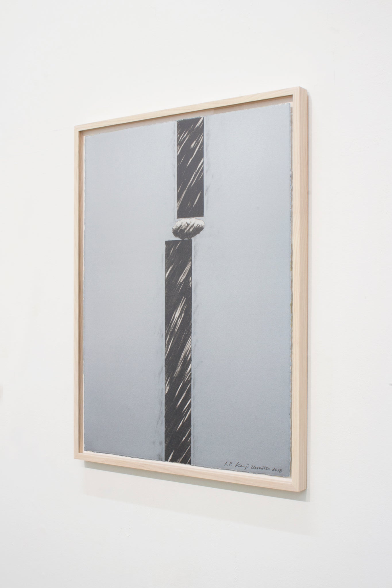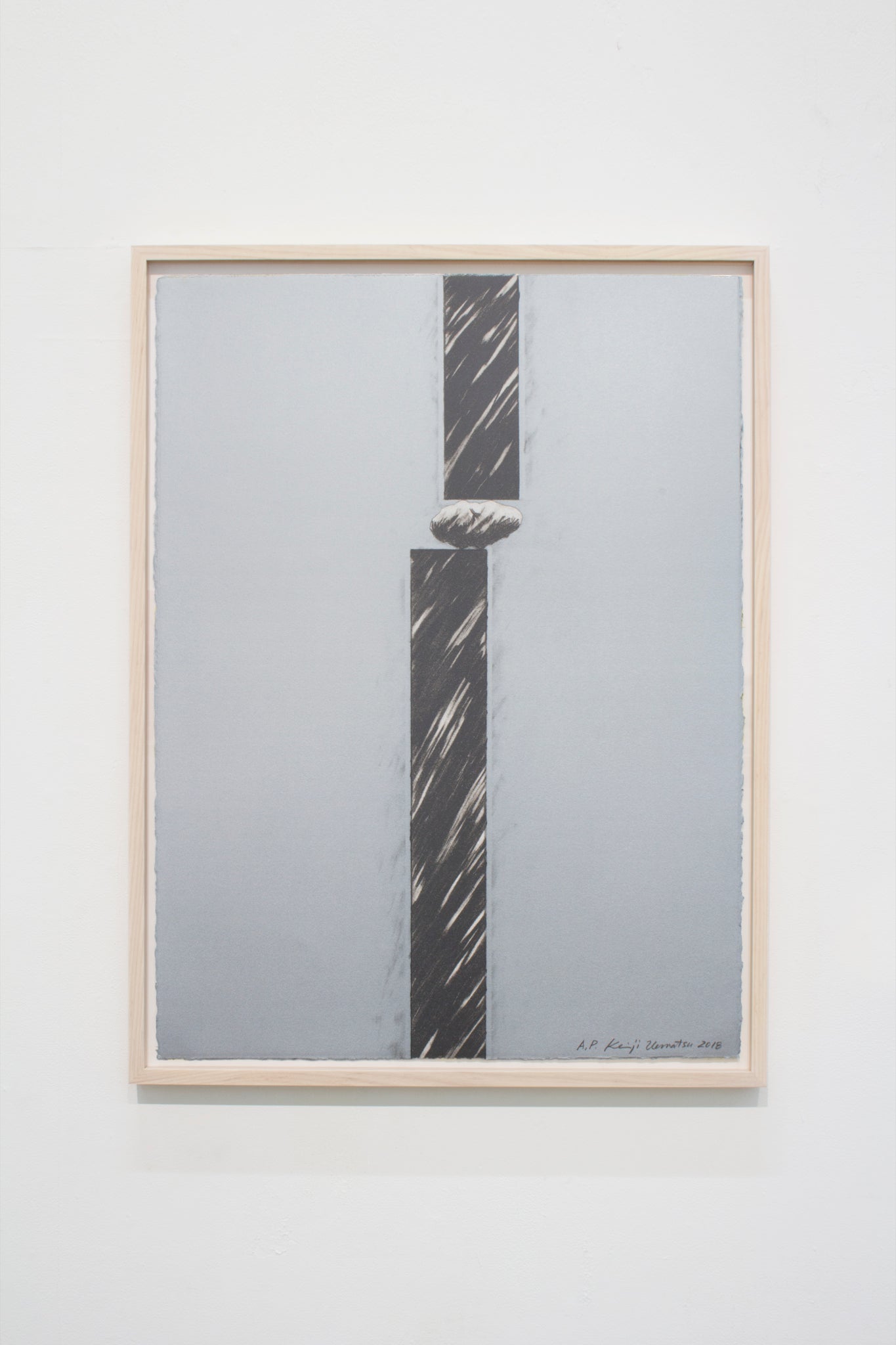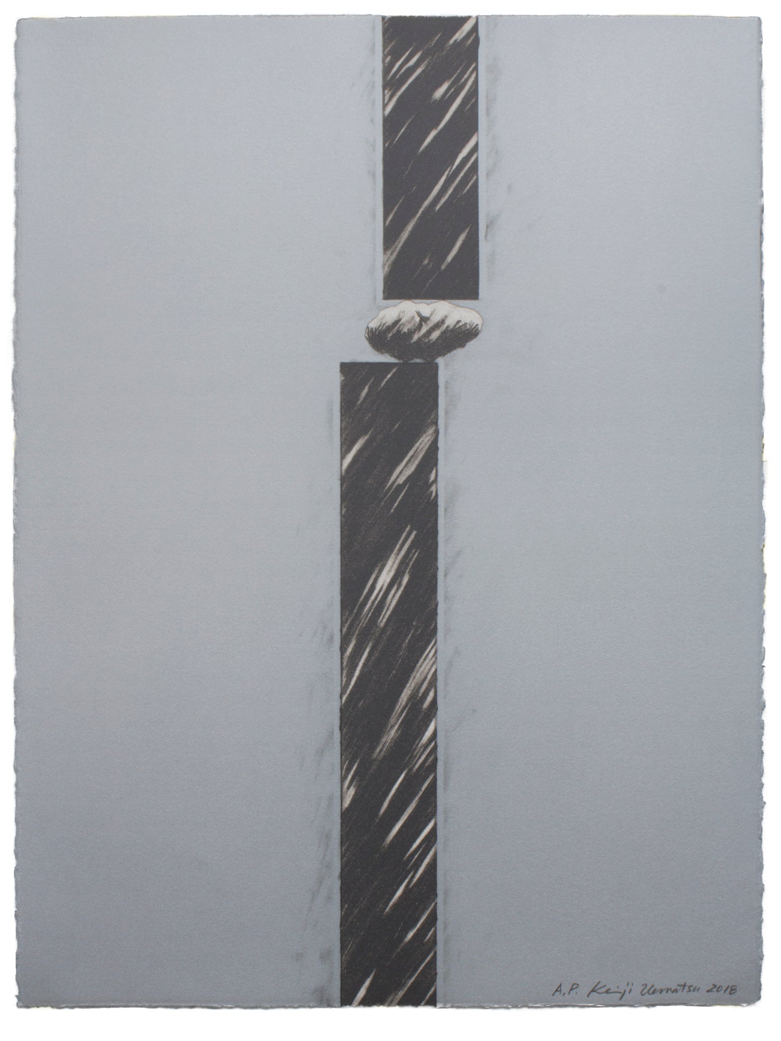石と黒い棒状のものが空間に危ういバランスを保ってる様を鉛筆で描いたプランドローイングが元になっていますが、ドローイングの複製ではなく、耳付きの版画紙面を一つの空間に見立てた、インスタレーションとしての版画を意図し、完成に至りました。