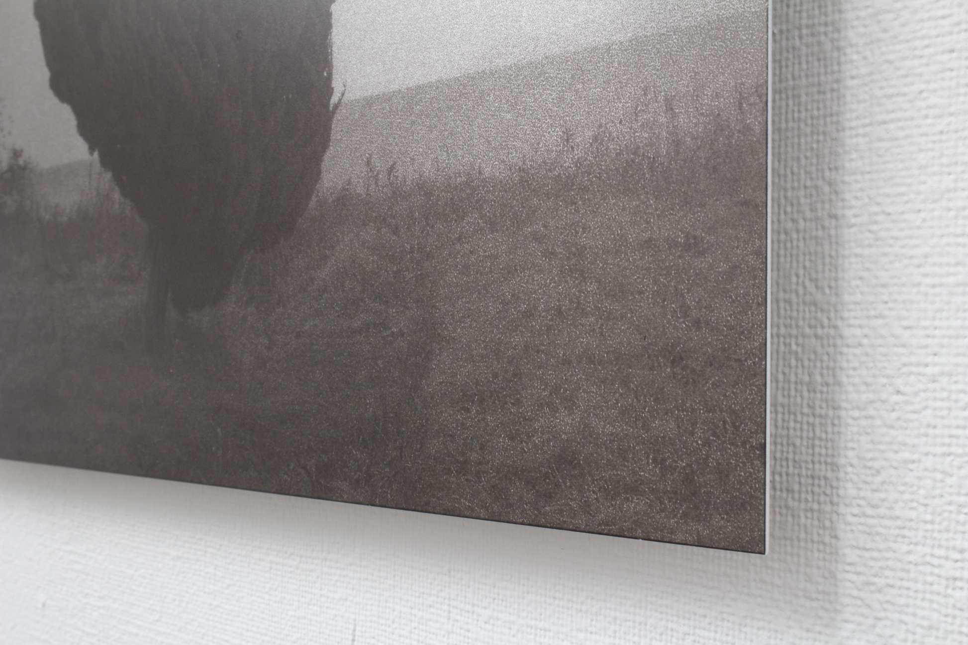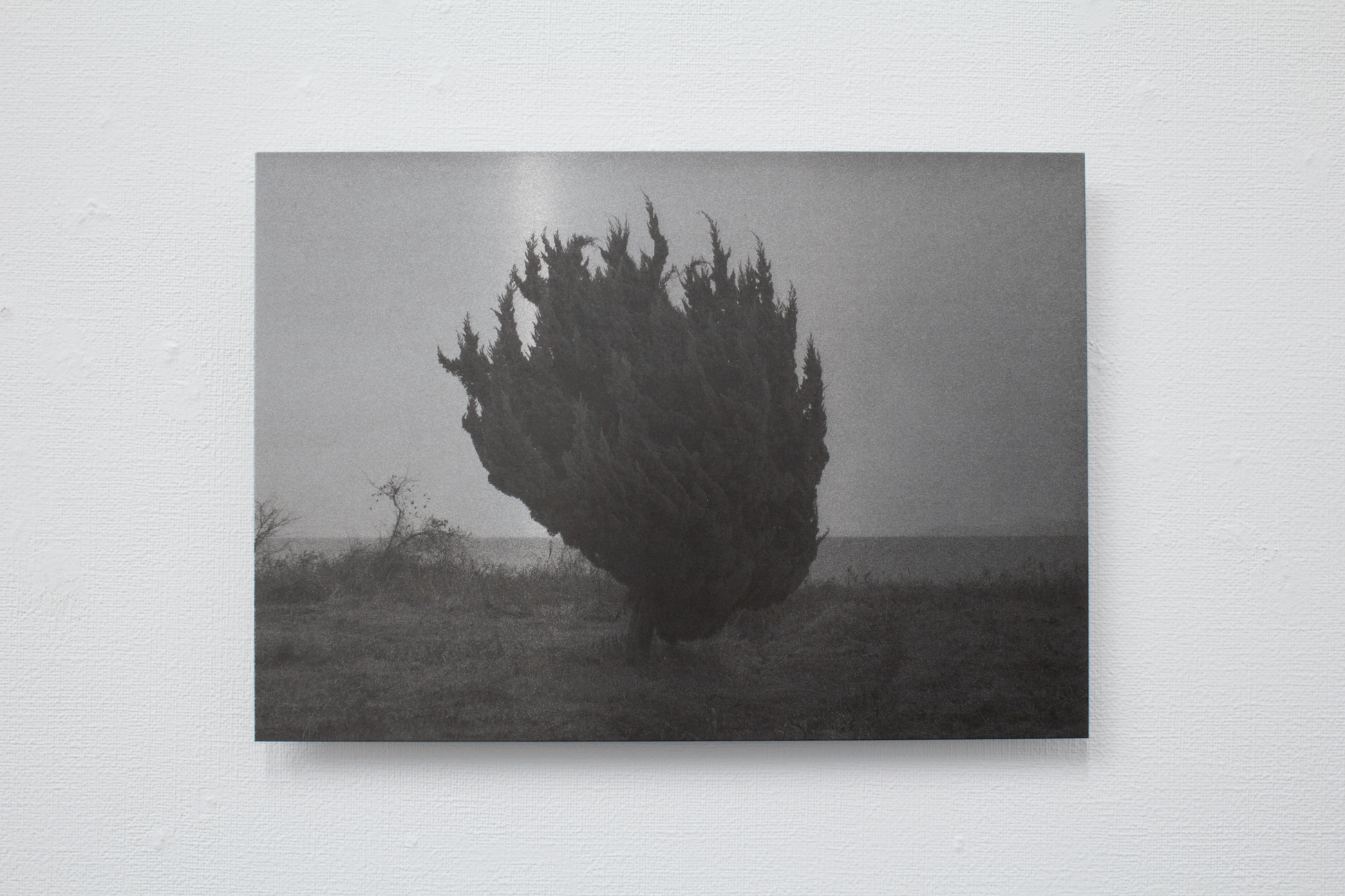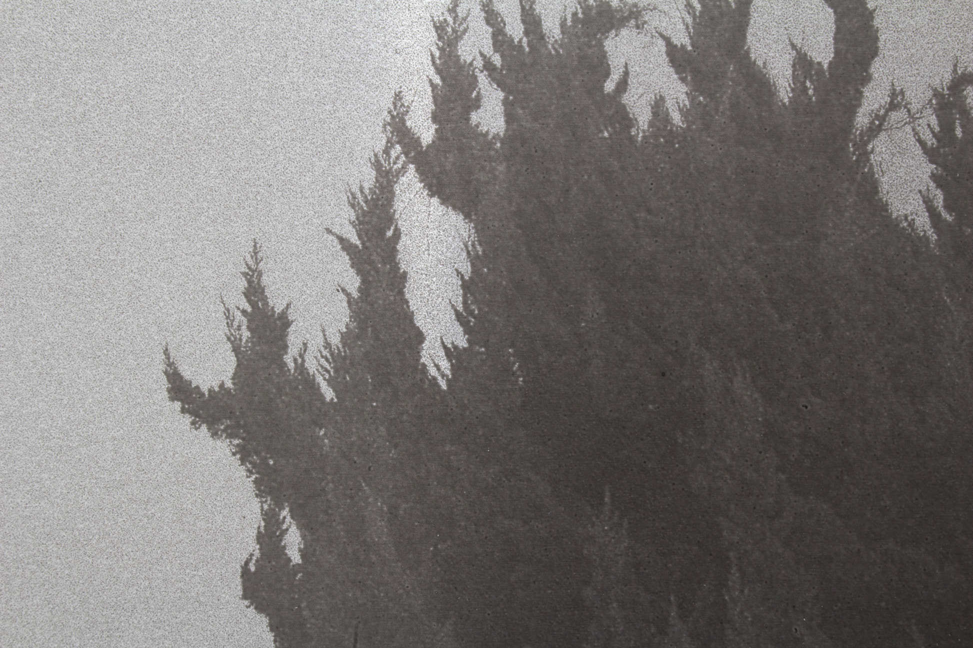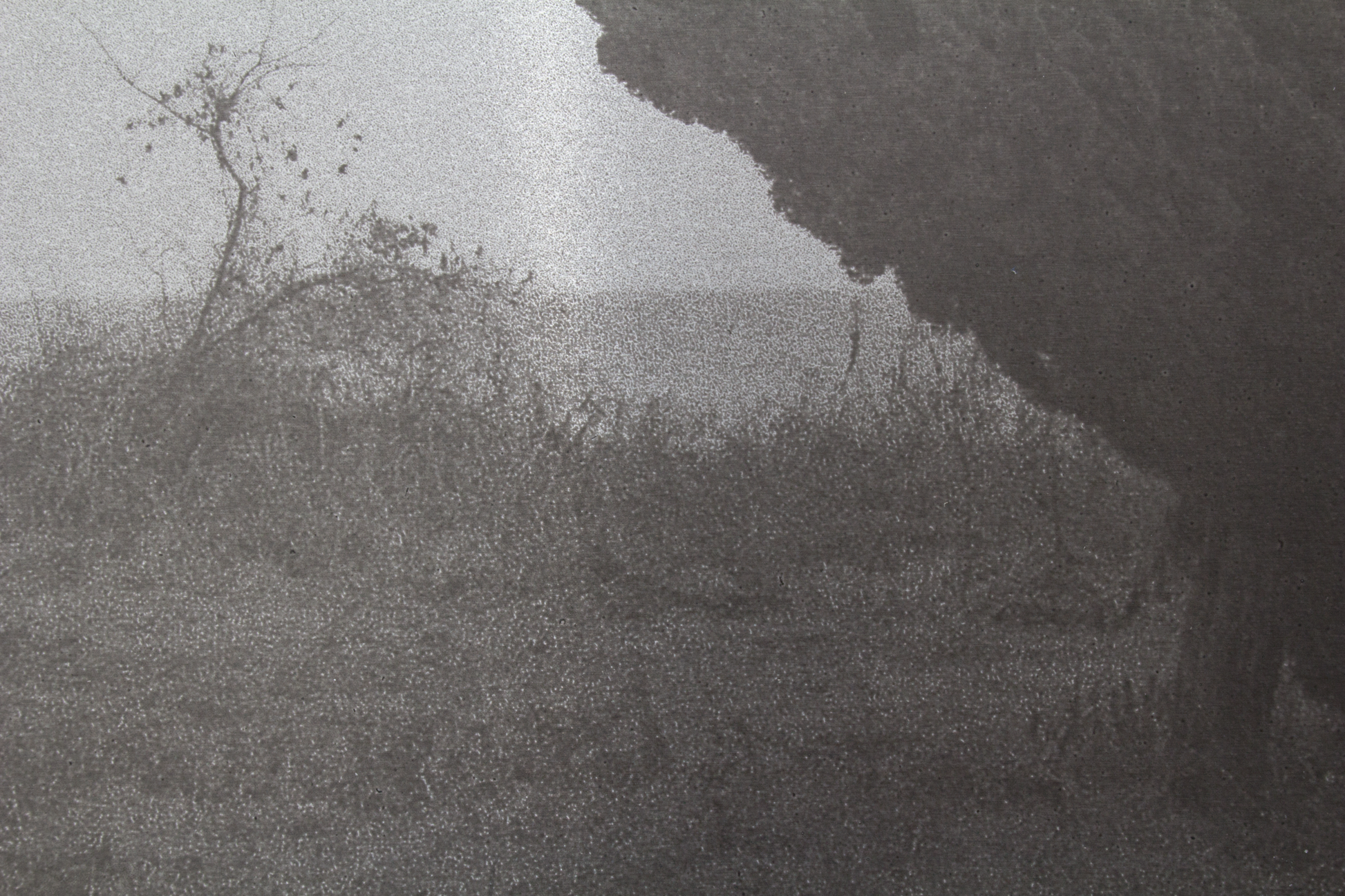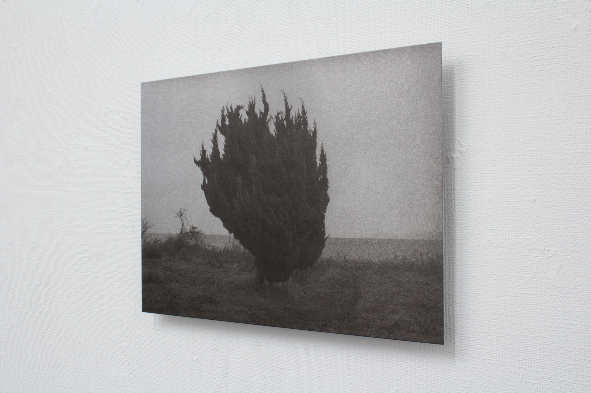 この作品のコンセプトは、写真イメージを物質として固定すること、そしてドローイングを紙に描くのに近い感覚で写真を扱うことにありました。アルミ素地にはすでに鈍く光る金属感があり、そこに刷るイメージは100%の黒までの階調にするのではなく、金属に馴染む範囲で止めました。一番明るい部分は金属の地の色なので、金属の存在とイメージが一体となる、少ない範囲に階調が抑えられています。
