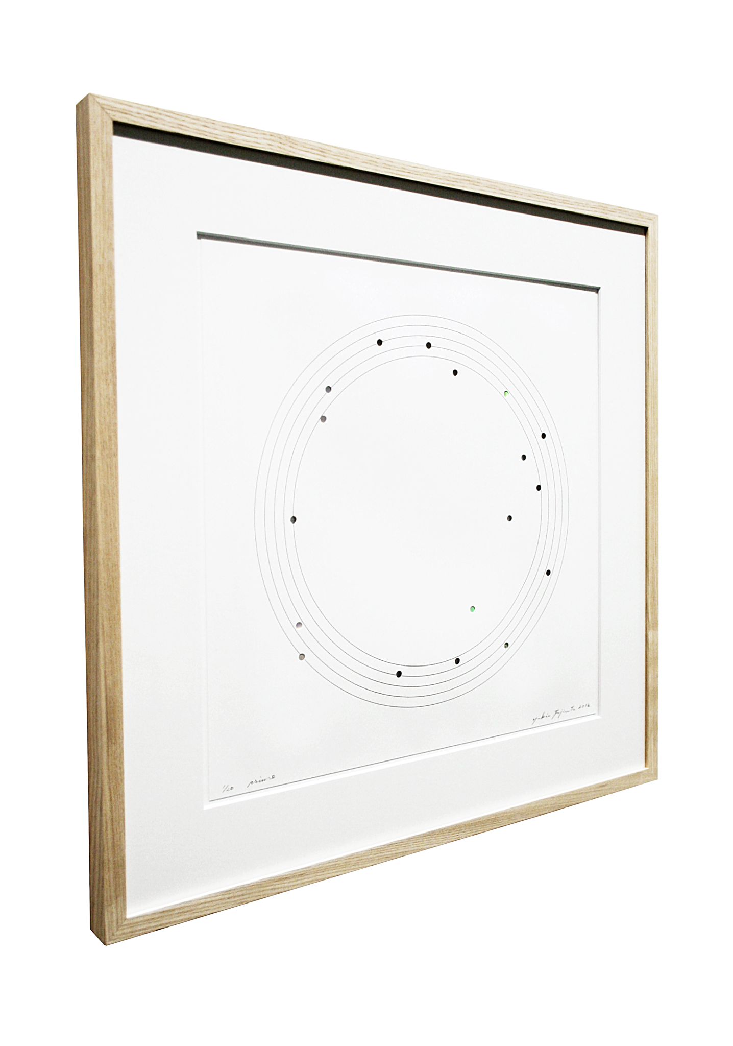 プリントの下にはホログラム紙が取り付けられており、一点一点手作業で空けられた穴を通して、音のイメージを変化する光としてご覧いただけます。