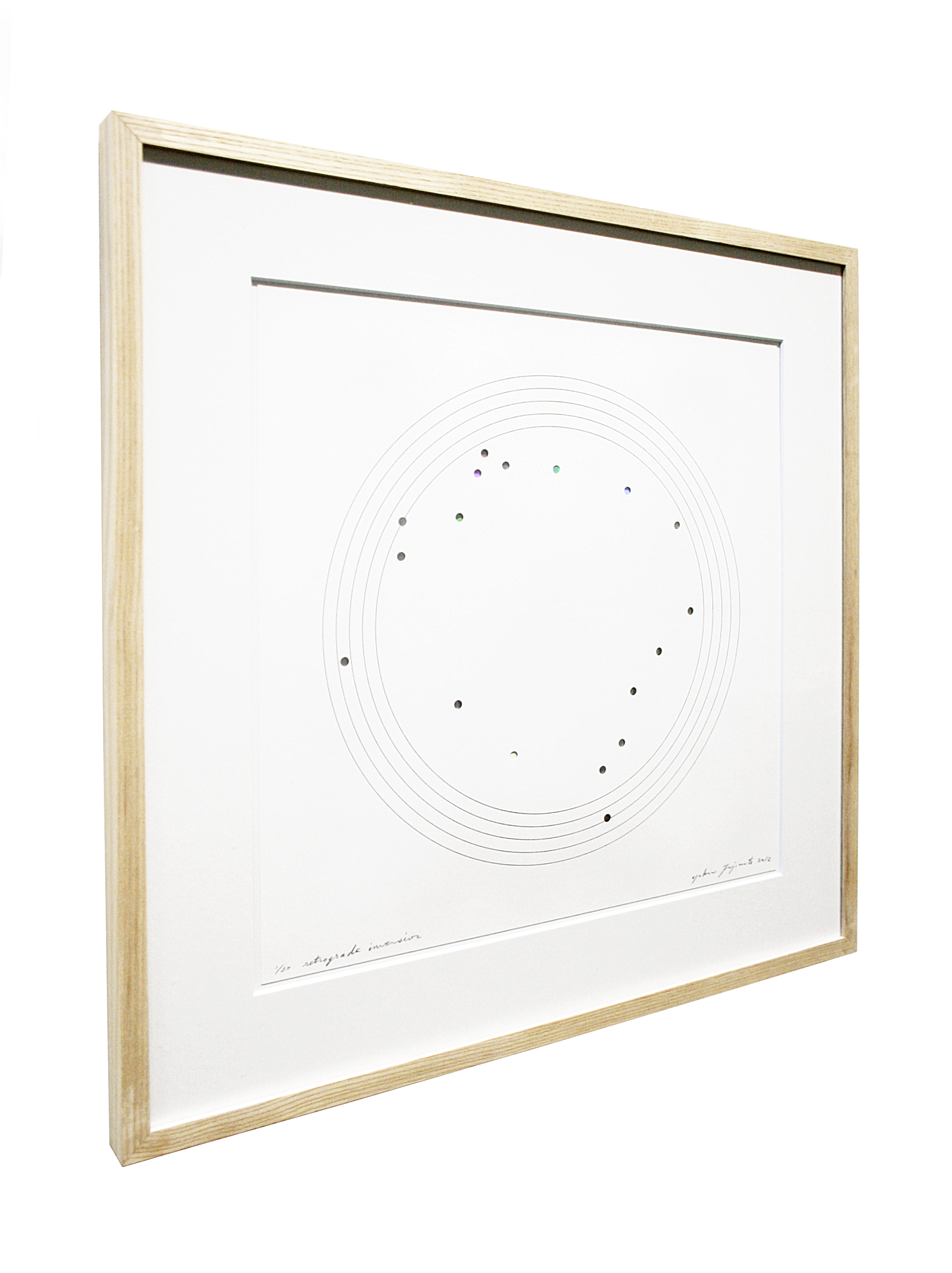 プリントの下にはホログラム紙が取り付けられており、一点一点手作業で空けられた穴を通して、音のイメージを変化する光としてご覧いただけます。
