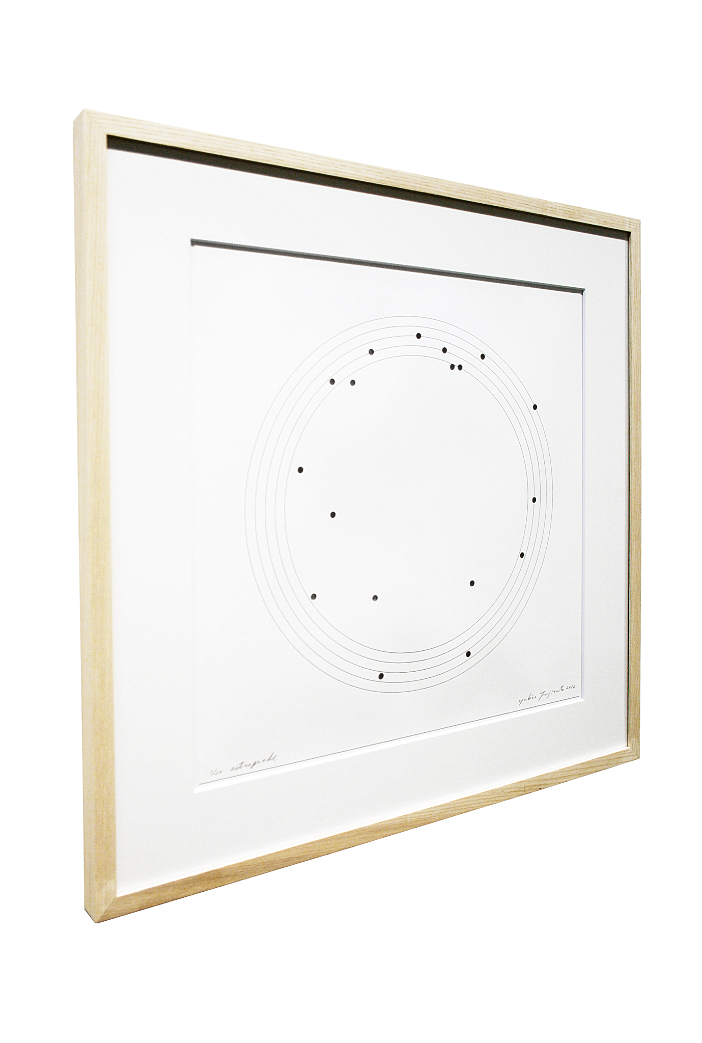 プリントの下にはホログラム紙が取り付けられており、一点一点手作業で空けられた穴を通して、音のイメージを変化する光としてご覧いただけます。