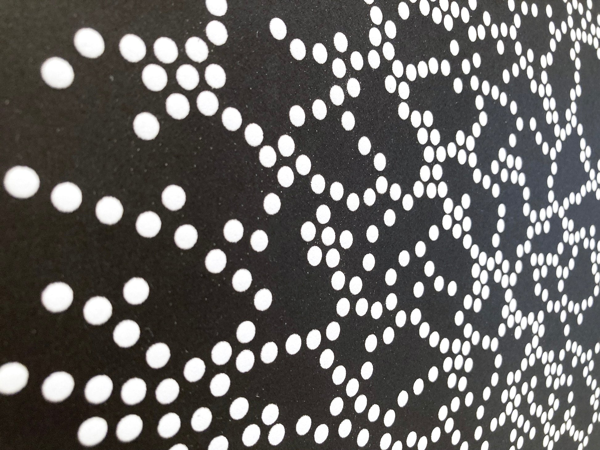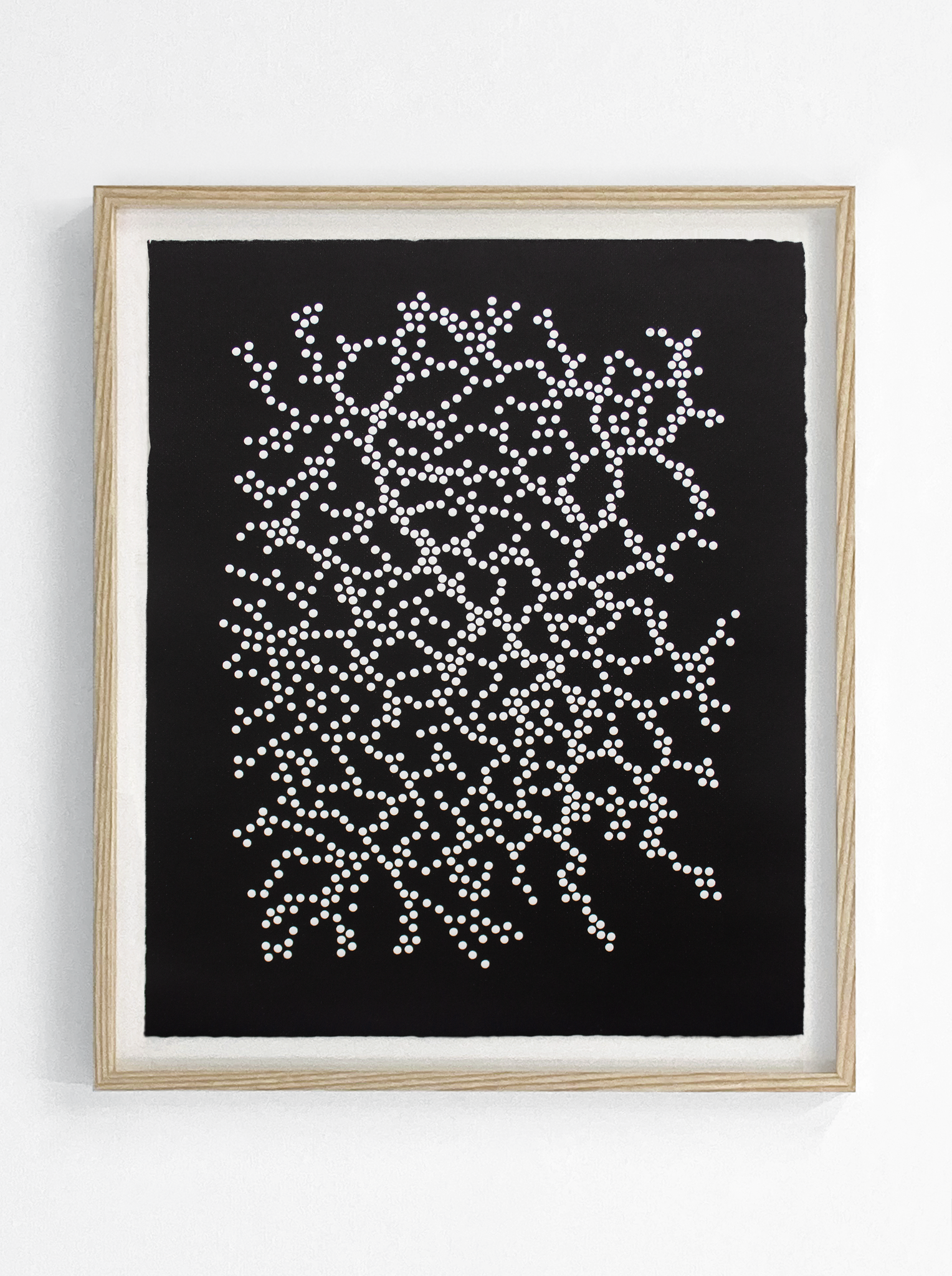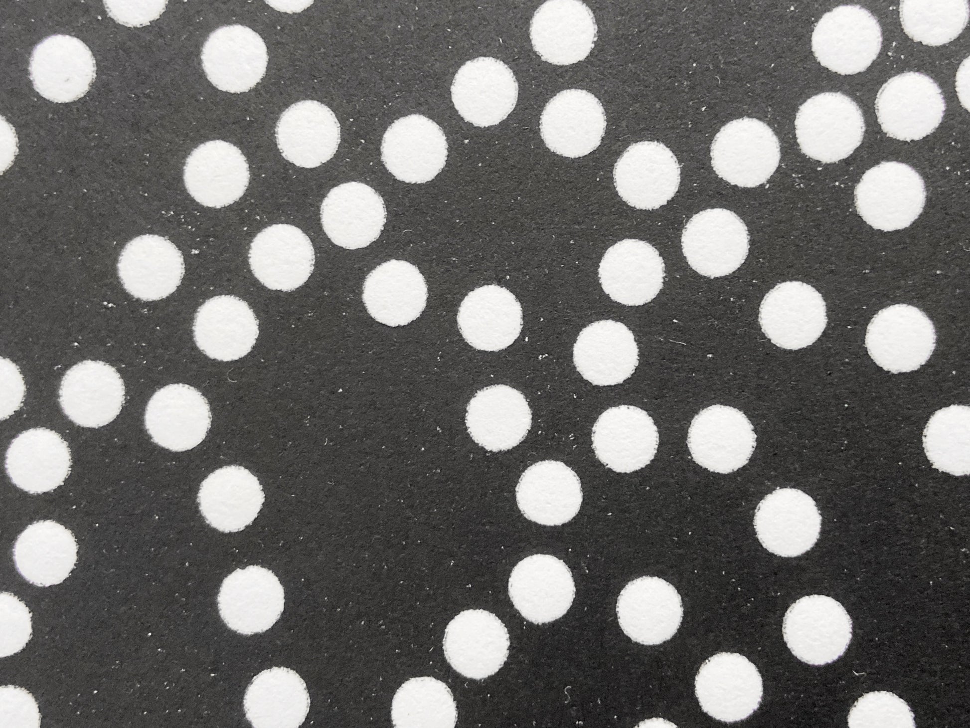 ノマルのディレクターからリノカット展の構想を聞き、シンプルだけど他の版種にできないことは無いかと考え、リノリウムをシンプルな円で打ち抜いた版「1089」。その打ち抜いた円を貼り付けた版の「768」を制作。「1089」は打ち抜いた部分にインクが乗らず光りの抜け穴となり「1089」から打ち抜かれた円を貼り付けた「786」は「1089」から放たれた光を受け留める。それは色のない光の痕跡。