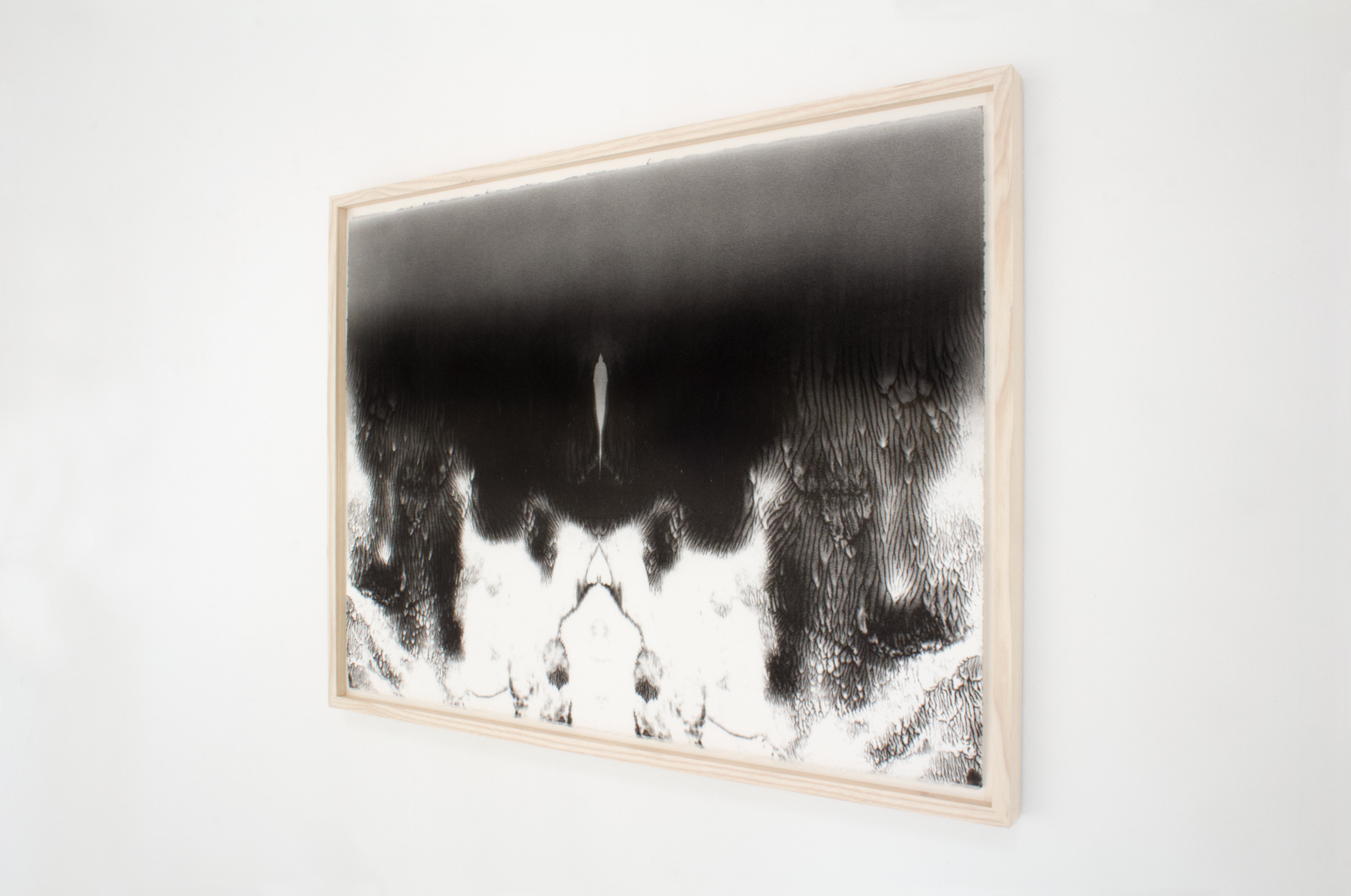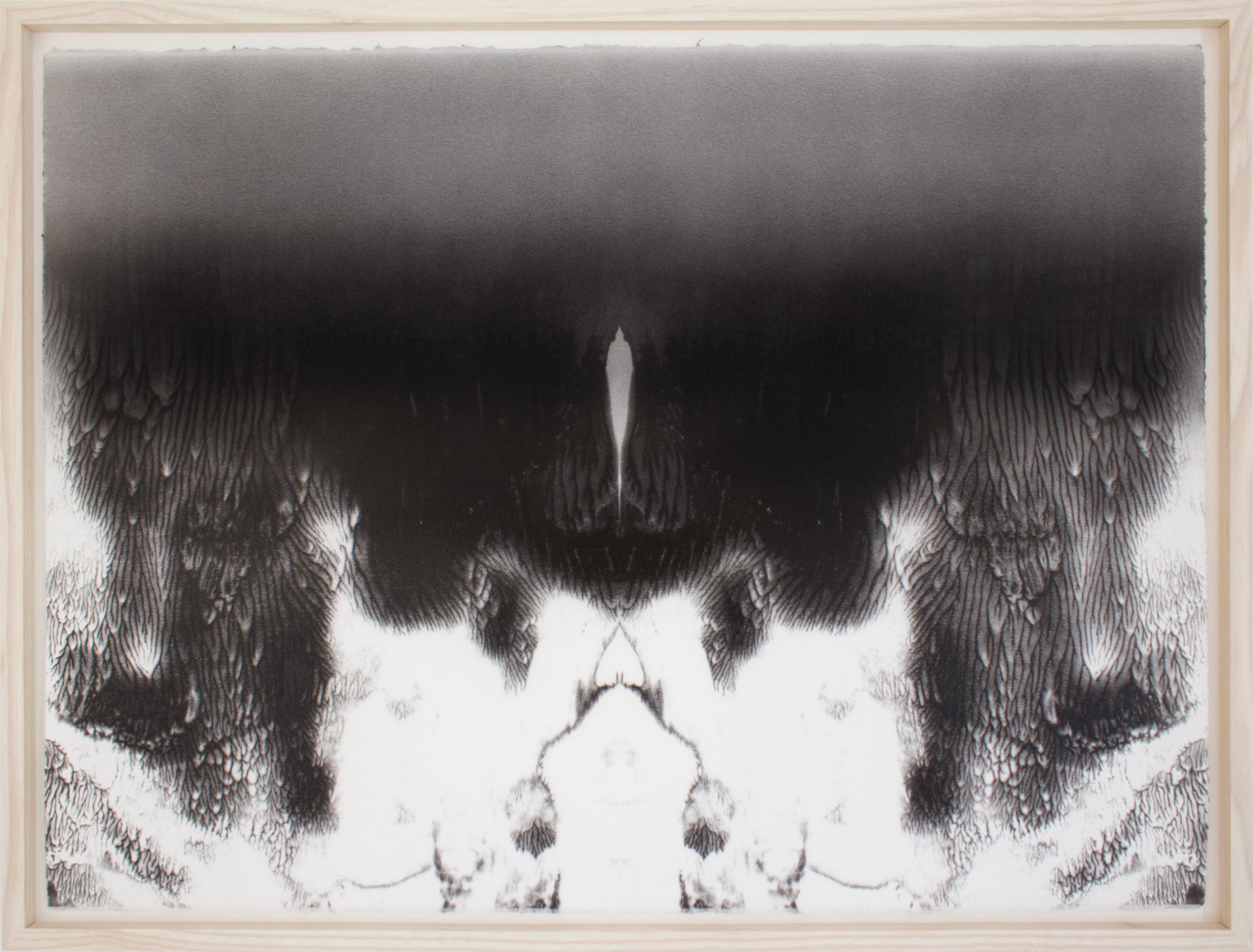 スキージによってインクをこし出す通常のスクリーン印刷とは異なり、インクを吹きつけることでイメージを定着させる。版と支持体の距離によって焦点をコントロールしながら、「集中と拡散」という相反する状態を一度につくり出すことが出来る。