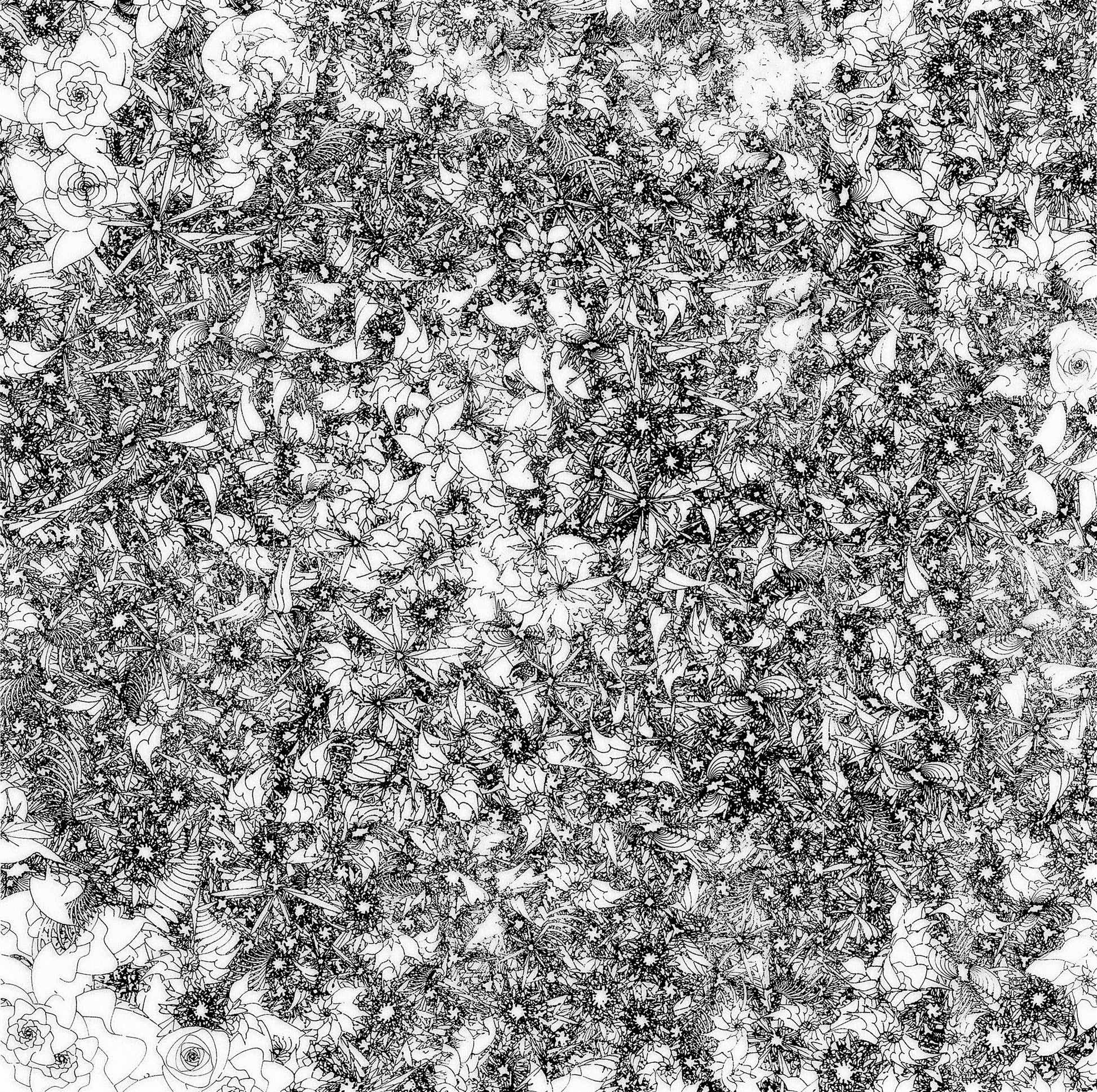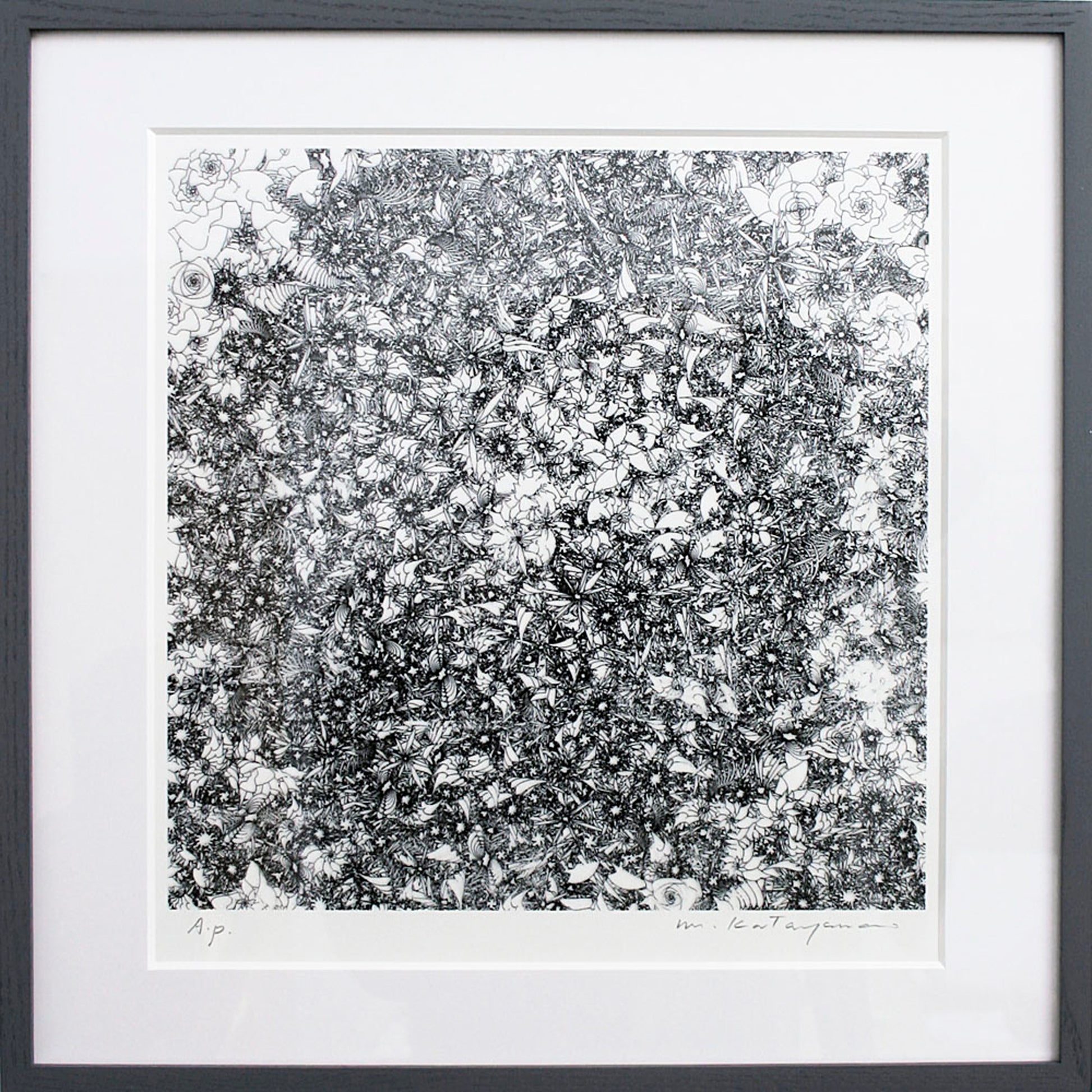 キャンバスに墨で描いた大型平面作品のイメージを元に、パールと黒インクの2版でシンプルに印刷したスクリーンプリント作品。平滑性を求めたキャンバス作品に対し、この版画では奥行きの感じられる仕上がりとなっています。