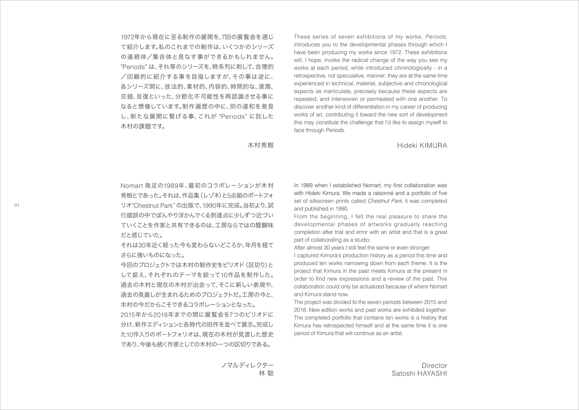 1972年から現在に至る制作の展開を、7回の展覧会を通じて紹介します。私のこれまでの制作は、いくつかのシリーズの連続体/集合体と見なす事ができるかもしれません。"Periods" は、それ等のシリーズを、時系列に則して、合理的/回顧的に紹介する事を目指しますが、その事は逆に、各シリーズ間に、技法的、素材的、内容的、時間的な、浸潤、交錯、反復といった、分節化不可能性を再認識させる事になると想像しています。制作遍歴の中に、別の違和を発見し、新たな展開に繋げる事、これが "Periods" に託した木村の課題です。