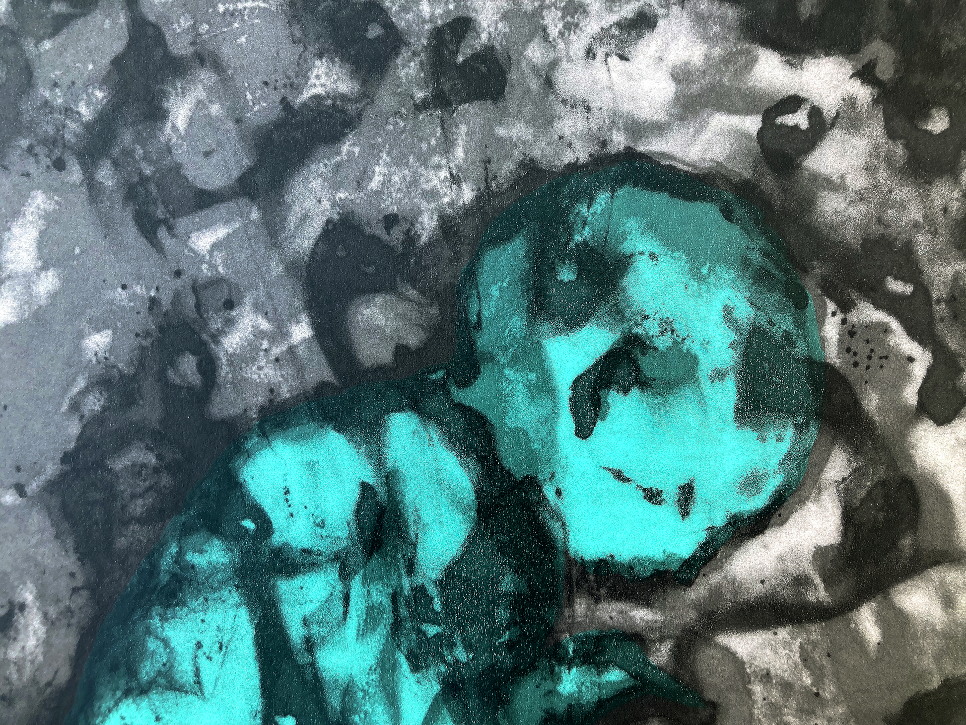 象徴としての石を撮影した写真のイメージを下敷きにした2点(Put stones #1, Put stones #3)と、描き版のみによる1点(Put stones #2)、計3点のシリーズ作品。試し刷りを現場でチェックしながら刷る版の順番や色を調整するライブ感ある制作となりました。