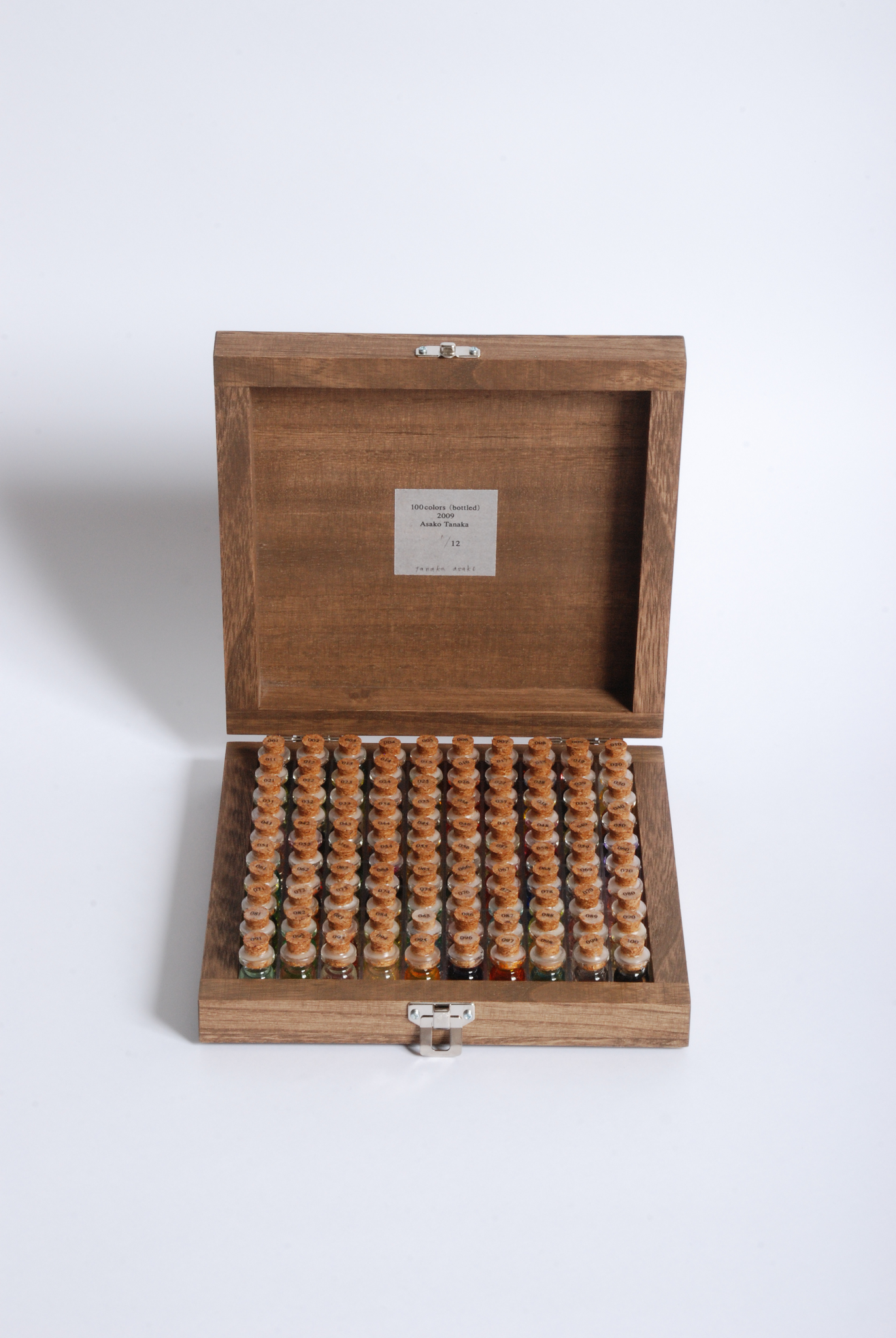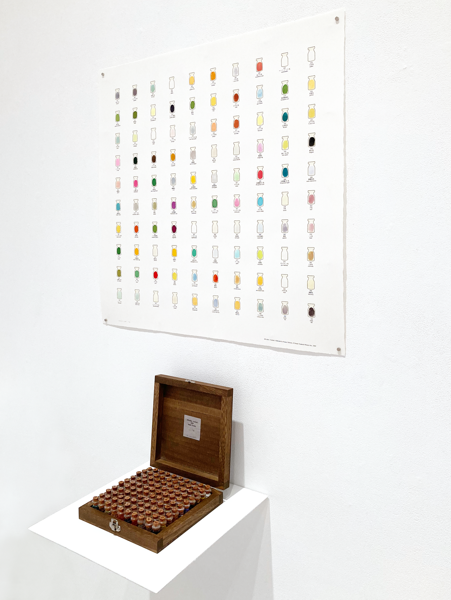100本の瓶(木箱入り)と、そのカラーインクを用いて着彩したシートとのセット作品となります。