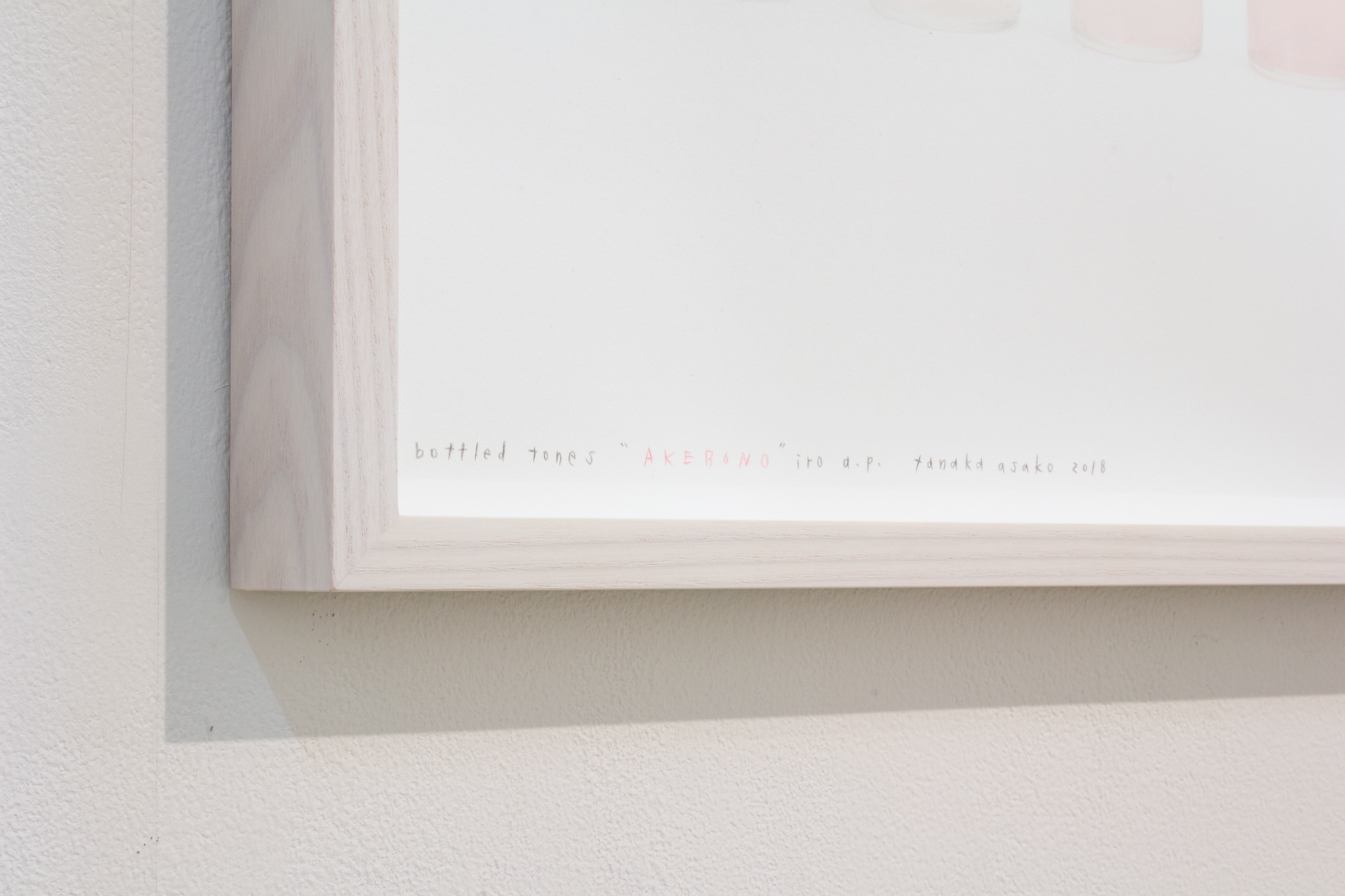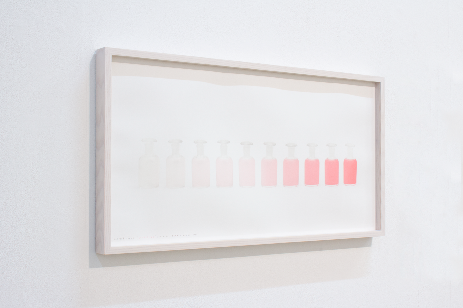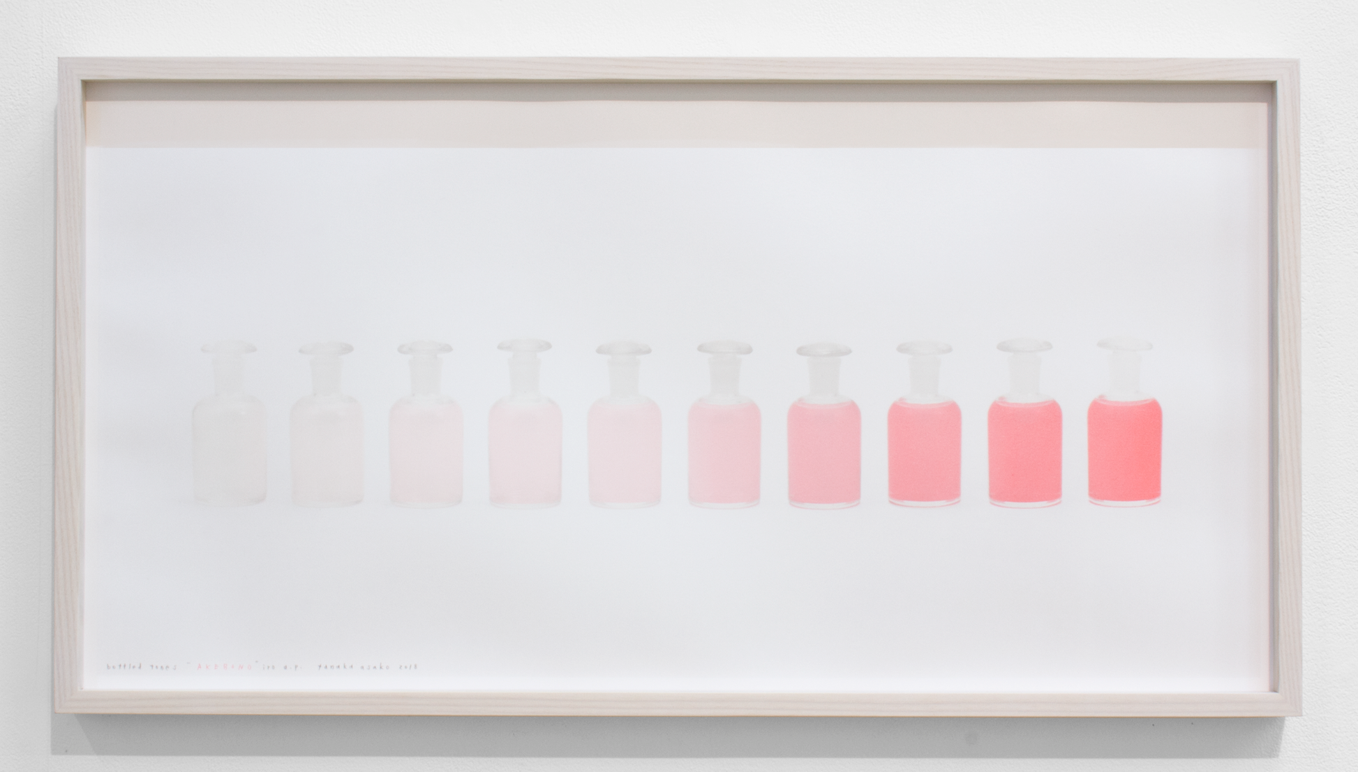この作品はビンの写真と色面を組み合わせたシリーズ作品です。実際に瓶の中に田中が独自の名付けをした色水を入れて並べる作品は過去に発表しましたが、今回は並べた瓶の写真の版と水の部分の版を作り、並んだ水の部分の色面は、透明から淡いテーマ色までが一版のインクグラデーションで刷られています。