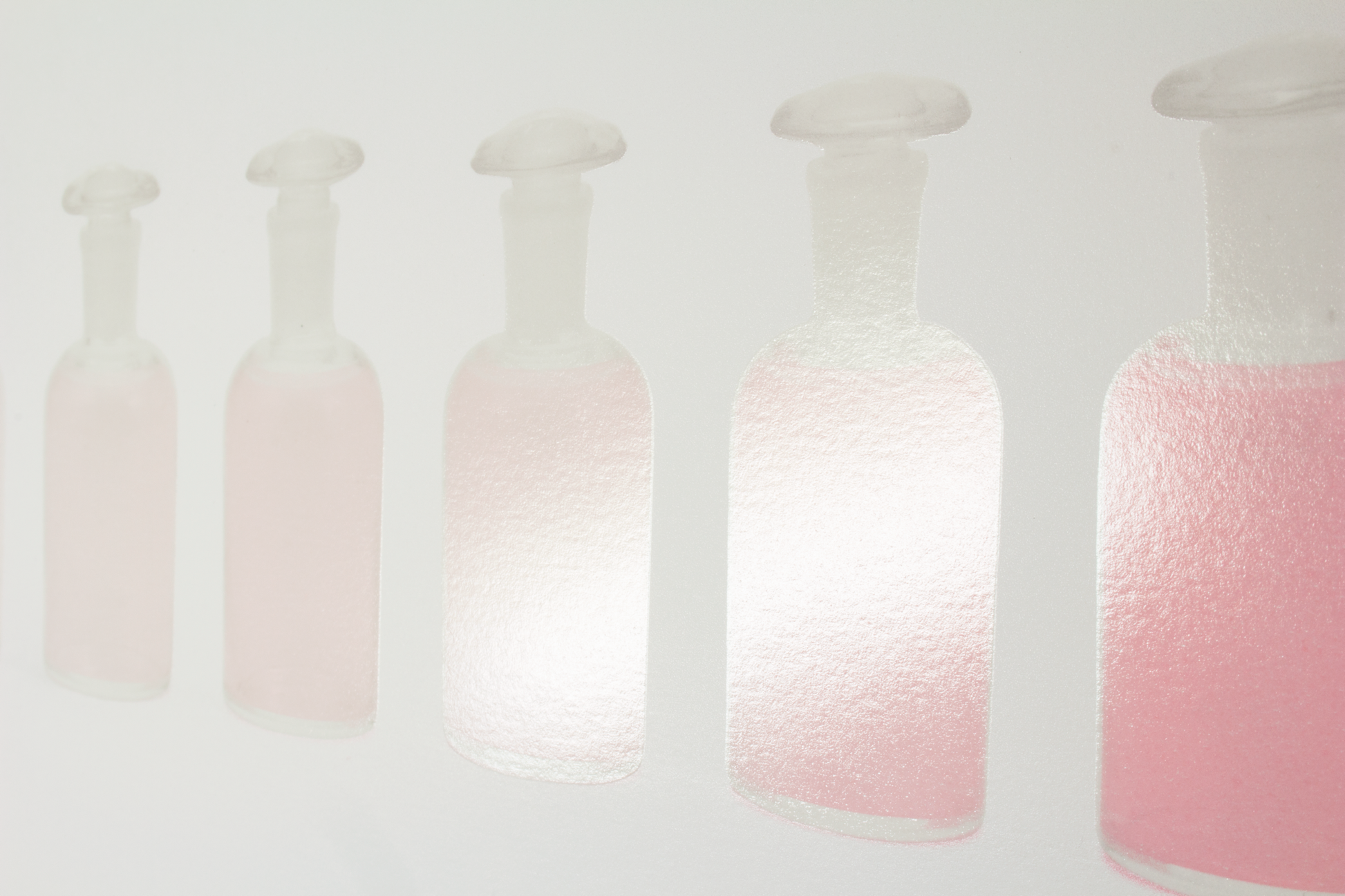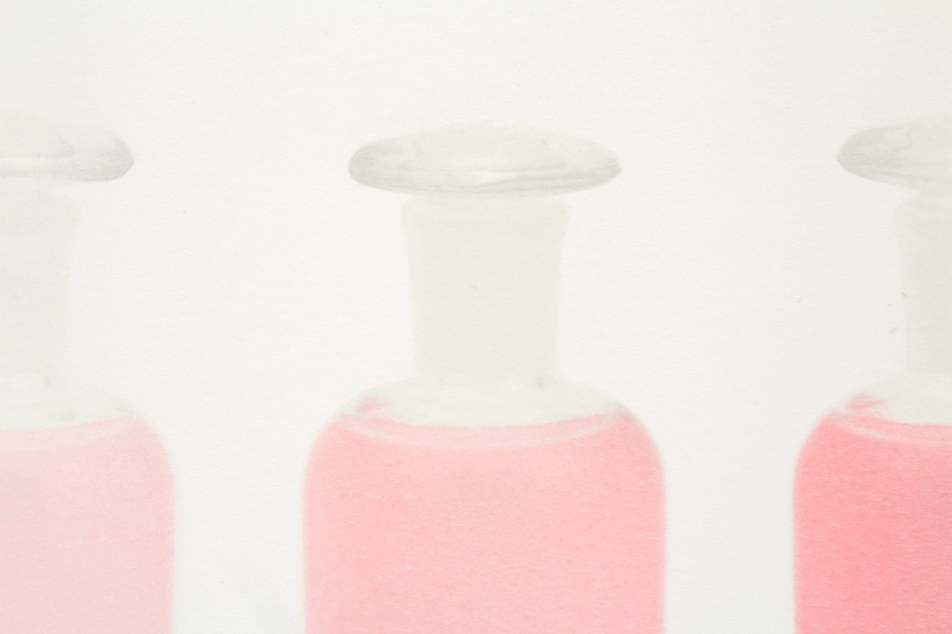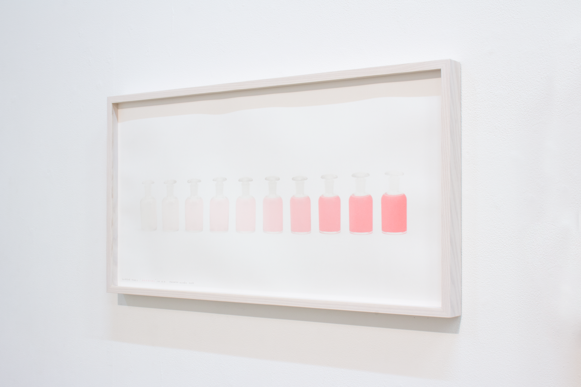 絶妙なグラデーションを描く色面の上に、瓶の写真が刷り重ねられた作品ーこれは色水の再現ではなく、ボトルに入れられた色の作品なのです。