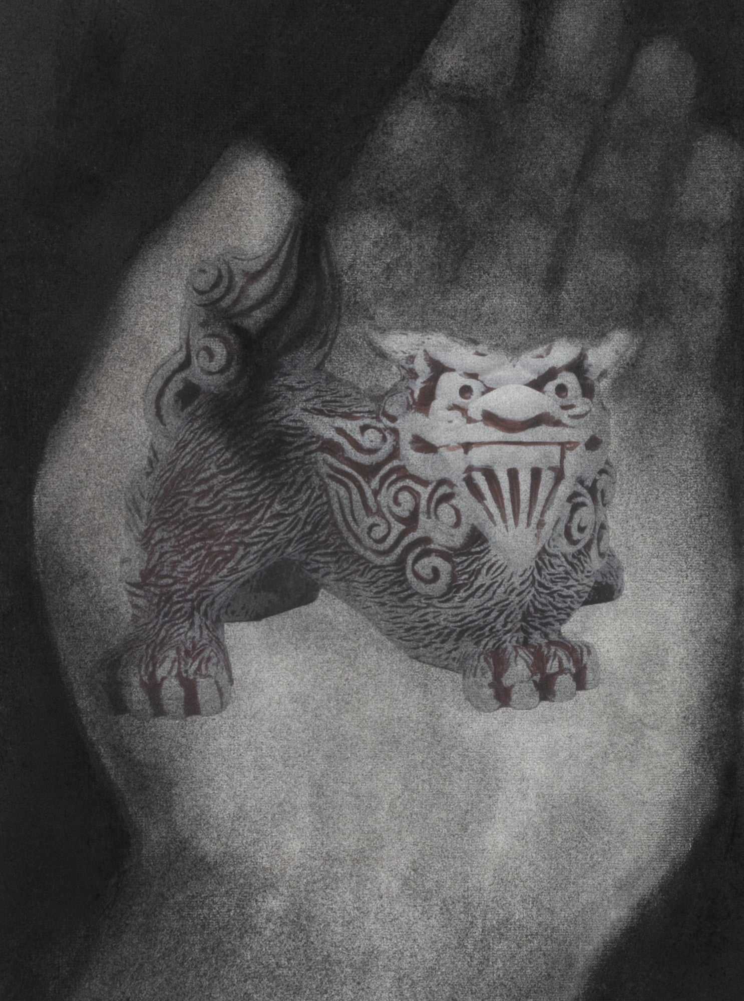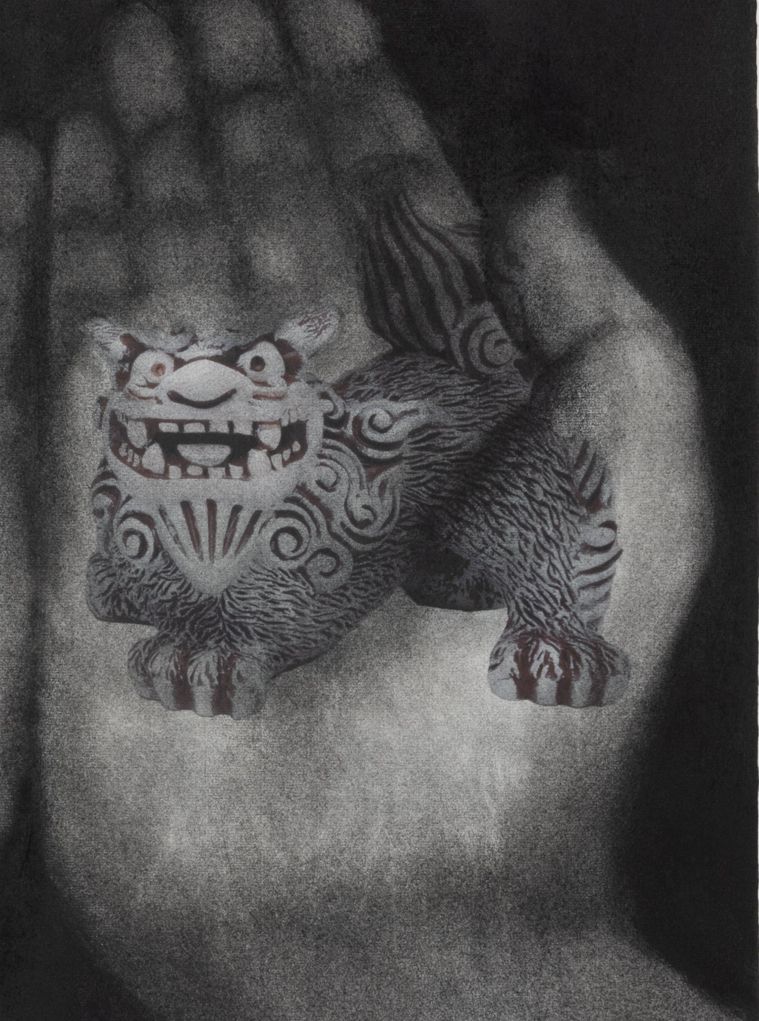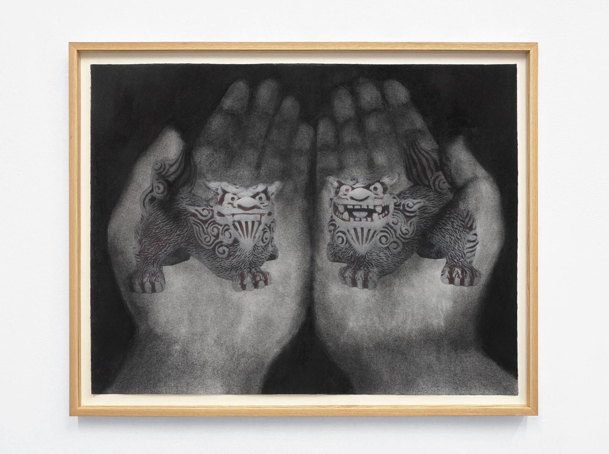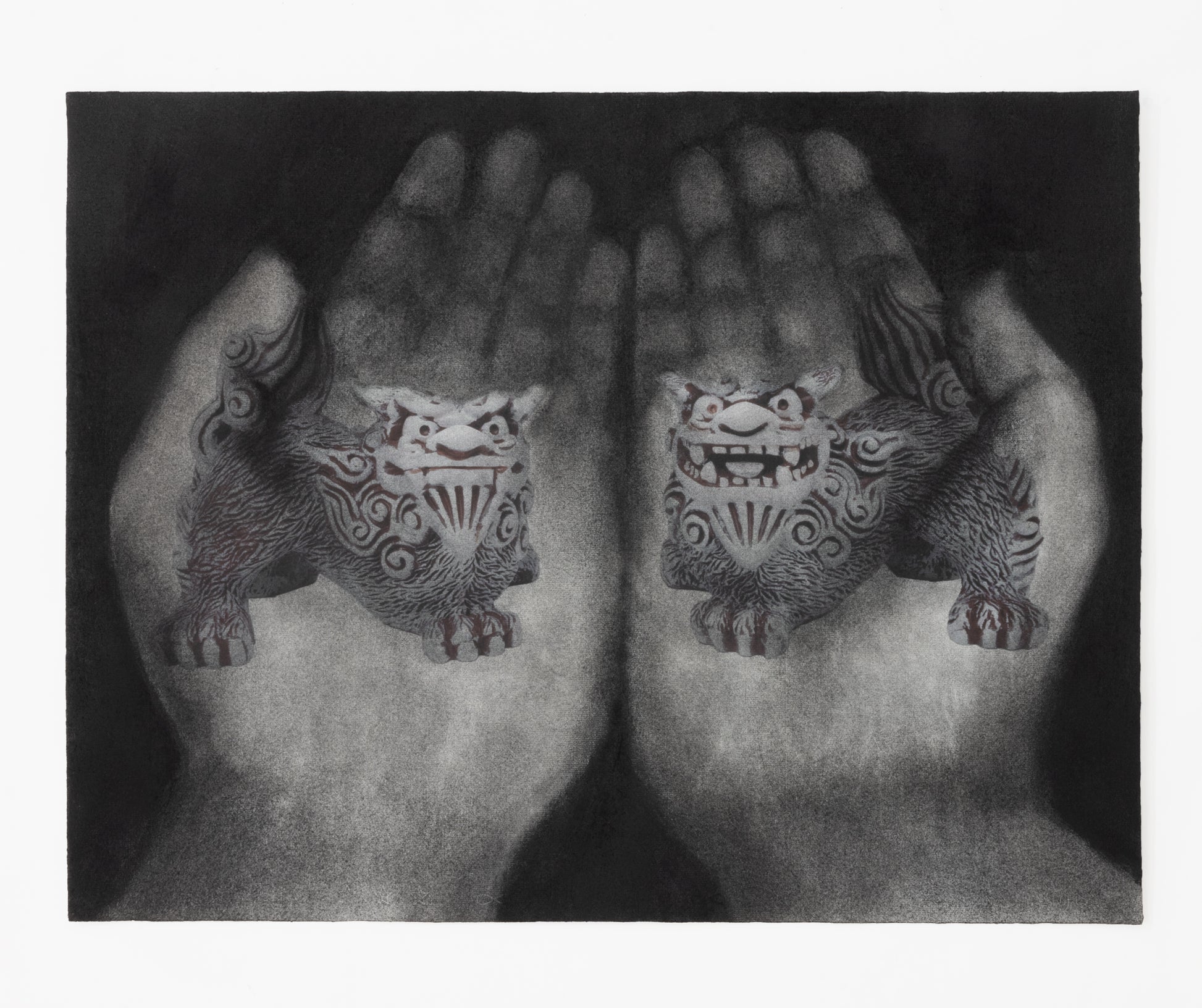 長年にわたり、他者の身体に触れて感じ取ったエネルギーを形として表現してきた池上。本作を含むノマルとのコラボレーション「Prayer」シリーズでは、ガネーシャ、シーサー、日本刀、仏像といった、個人の感覚を超えて精神の深層を象徴するモチーフを中心に据え、手や指を使って自身のアウラを塗り込めるように、木炭や胡粉によるドローイングを展開しています。